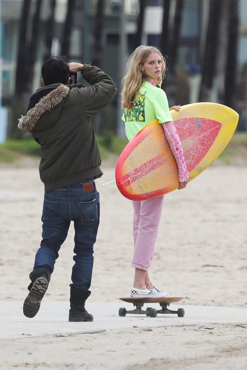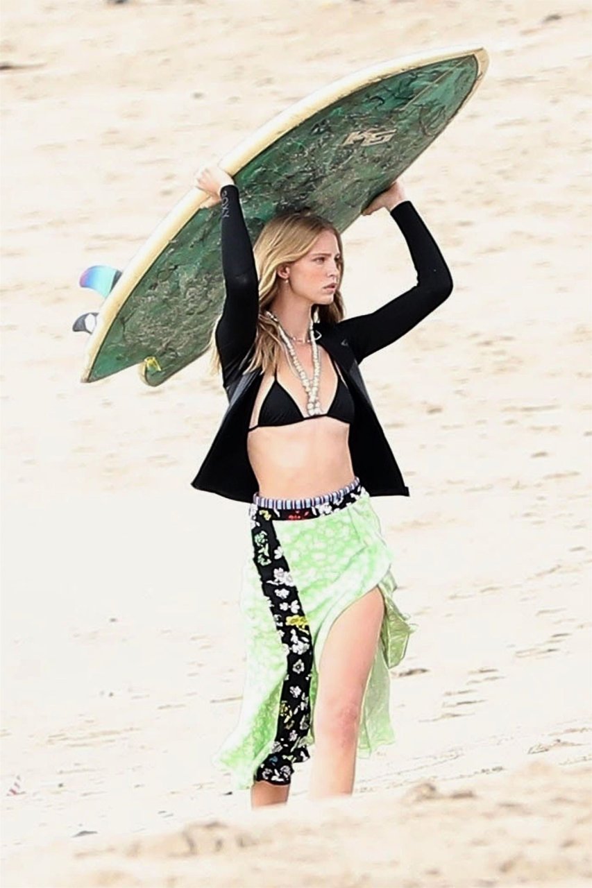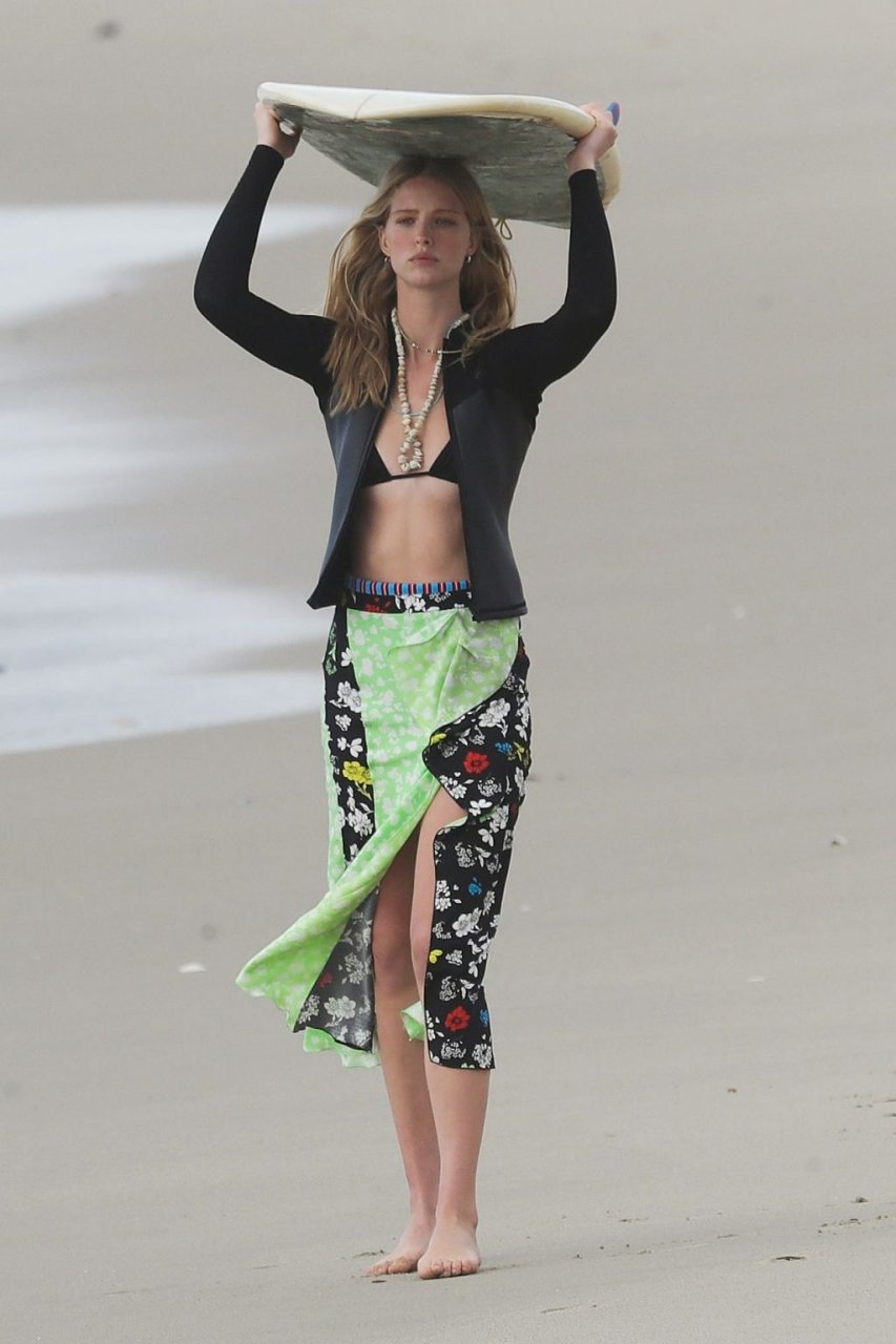 Парень Патрика Шварценеггера, модель Эбби Чемпион (21), была замечена на фотосессии на пляже в Венеции, 15.01.2019. Эбби демонстрировала свой стиль серфингистки в черном свитере, черном бикини и зеленой с черным юбке с цветочным принтом, держа доску для серфинга над головой.