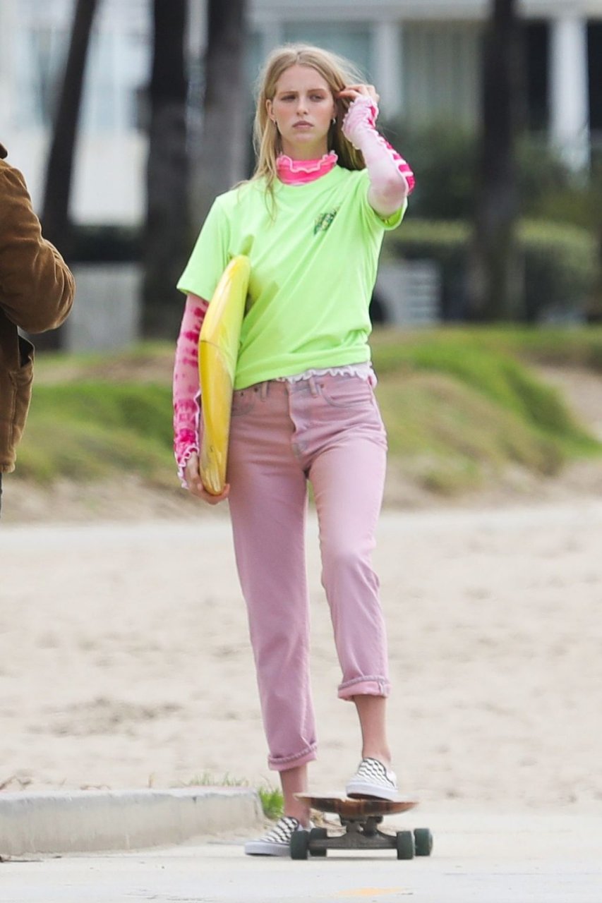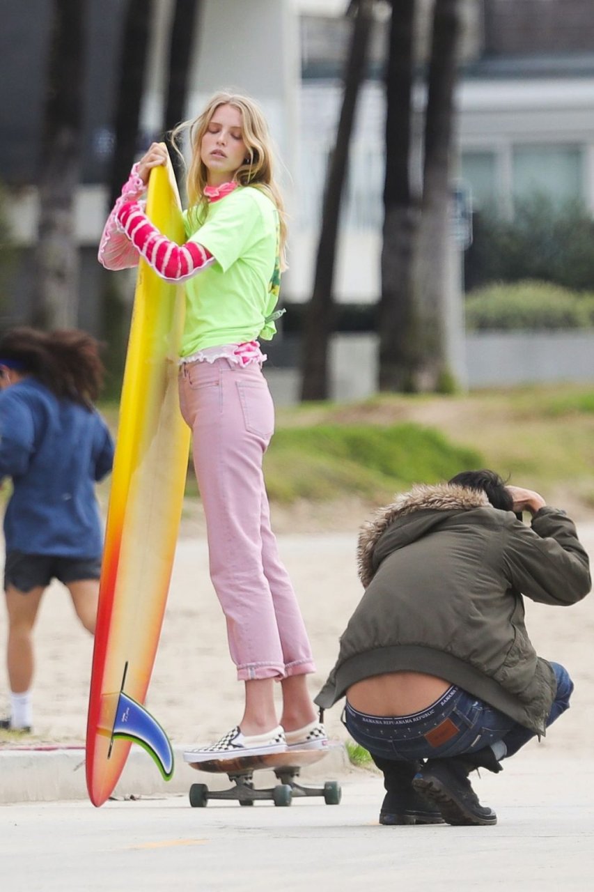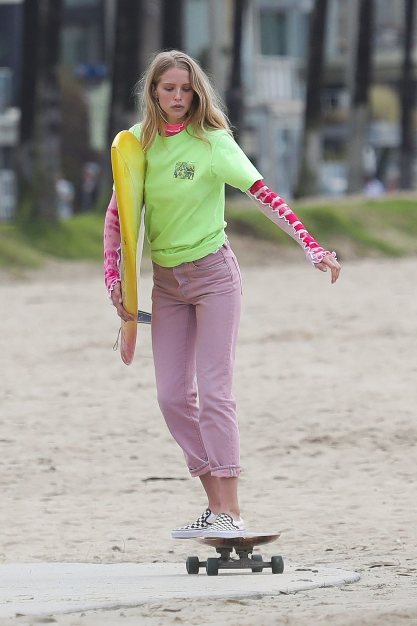 Парень Патрика Шварценеггера, модель Эбби Чемпион (21), была замечена на фотосессии на пляже в Венеции, 15.01.2019. Эбби демонстрировала свой стиль серфингистки в черном свитере, черном бикини и зеленой с черным юбке с цветочным принтом, держа доску для серфинга над головой.