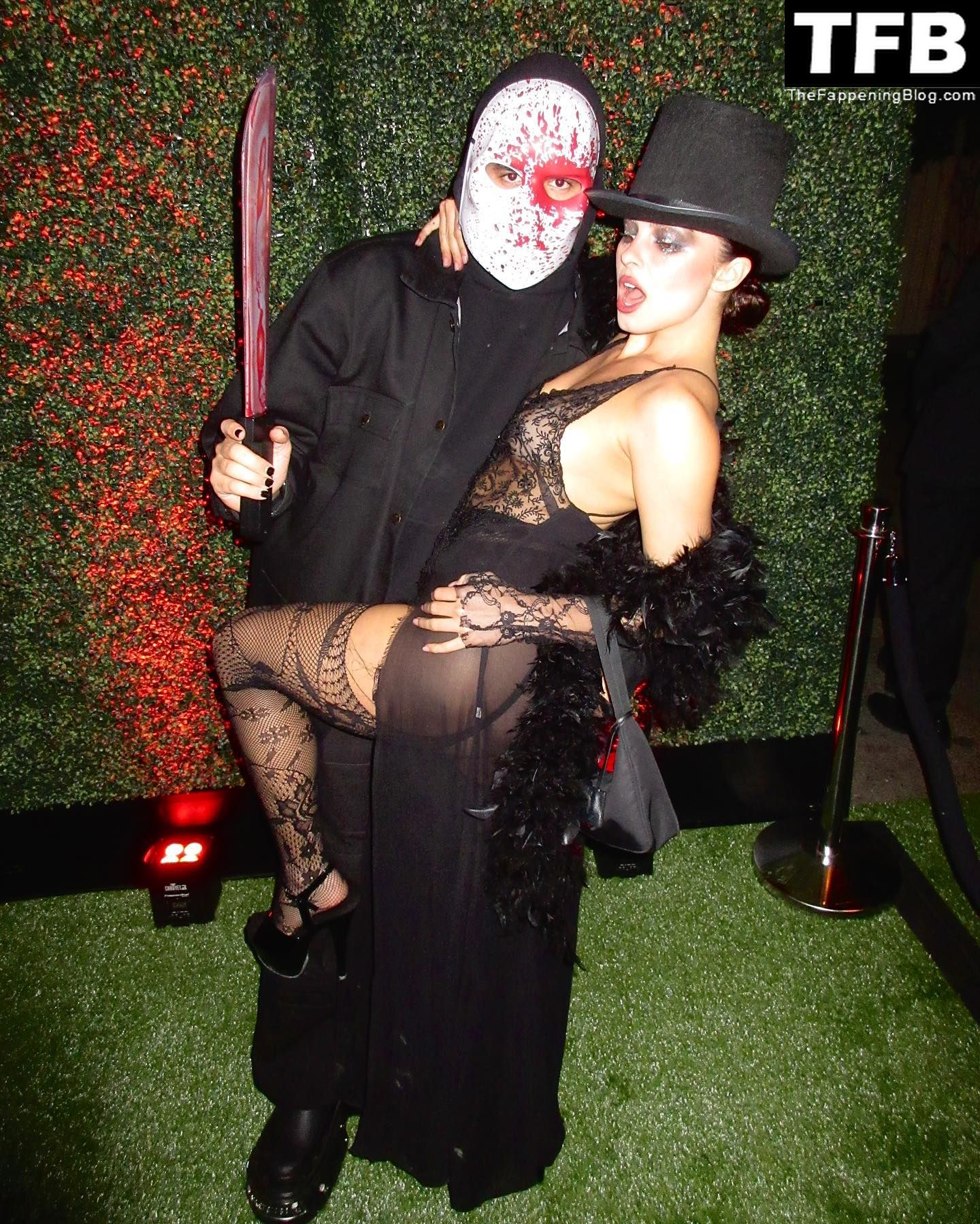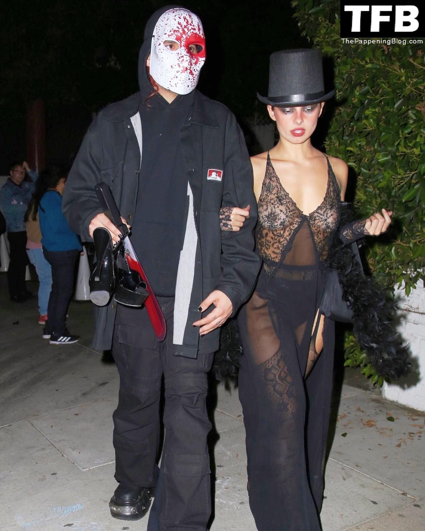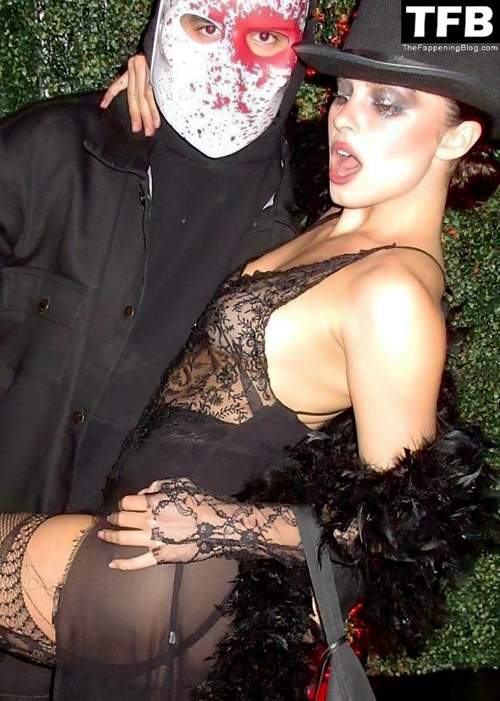 Эддисон Рэй в кружевном чёрном наряде на вечеринке и при выходе из Chateau Marmont в Вест-Голливуде, 29.10.2022.
