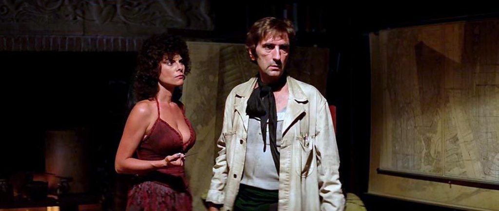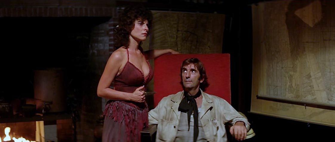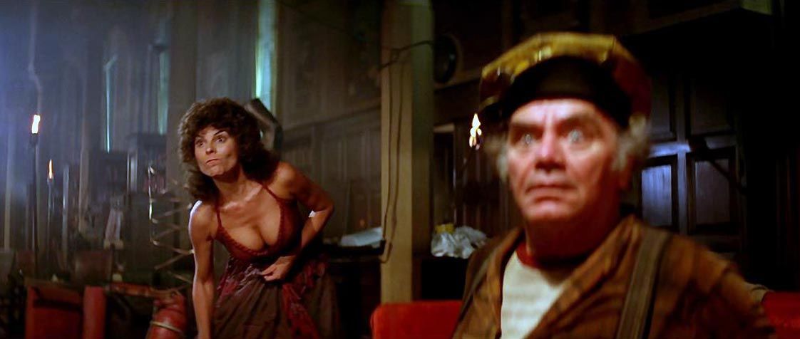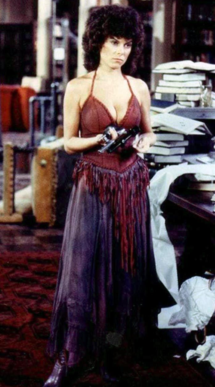 The next scene is not a naked, not a sex scene. This scene is just purely sexy, and it’s from the ‘Escape from New York’ movie. Adrienne Barbeau flaunts her cleavage in a low-cut red dress as she walks down some stairs with a couple of people, clutching a torch in one hand. She takes them to a library, where she stands in the background while a couple of guys chat, and then moves into the foreground to stand beside one of the guys seated in a chair.