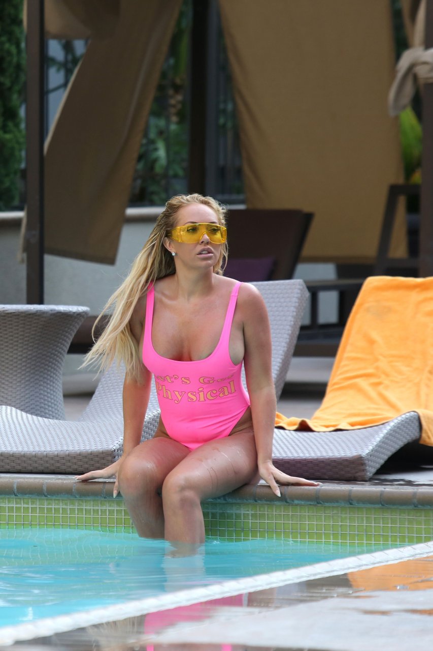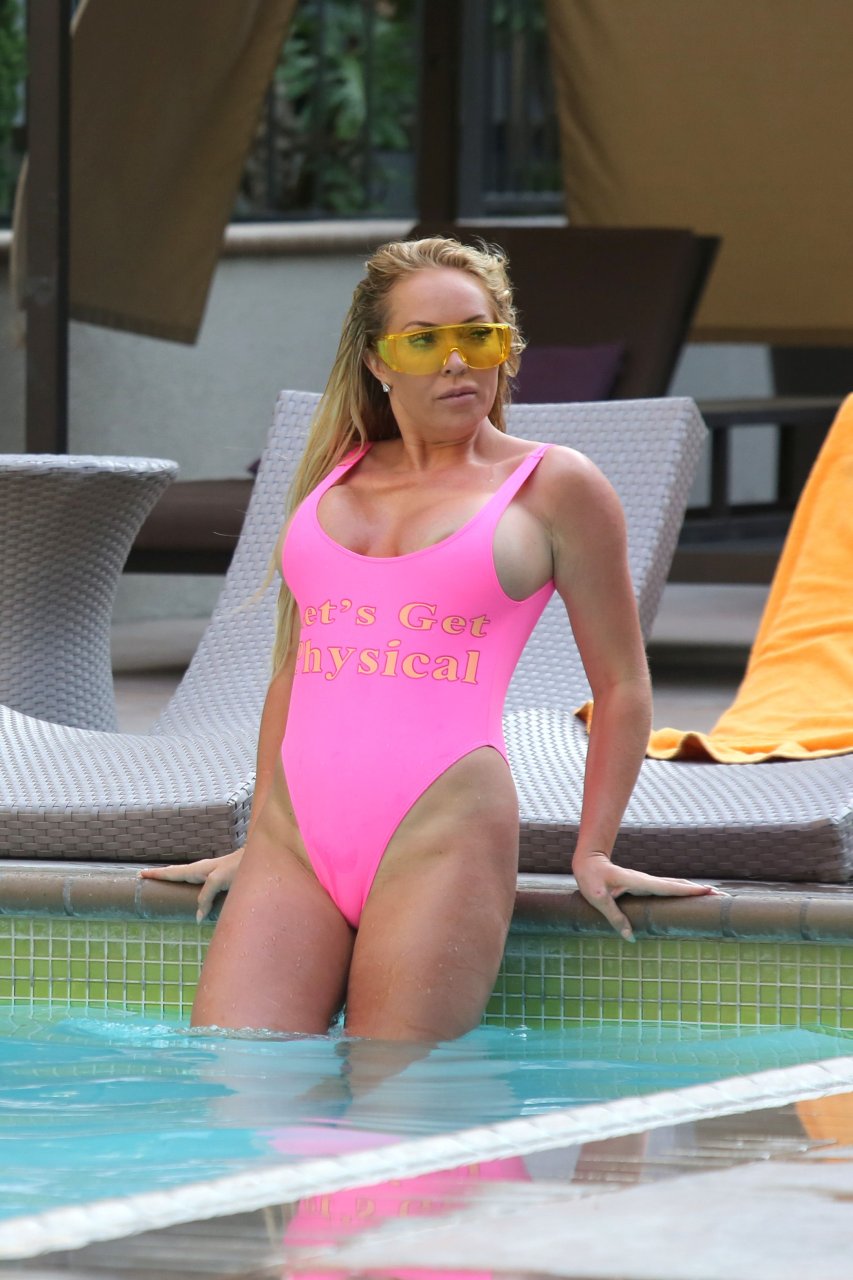 Эйслайн Хорган-Уоллес демонстрирует свои груди и ягодицы в розовом купальнике у бассейна в Лос-Анджелесе, 30.06.2017. Эйслайн Хорган-Уоллес — британская модель, дизайнер, актриса, колумнист журнала и телеведущая, медийная личность. Возраст – 38.