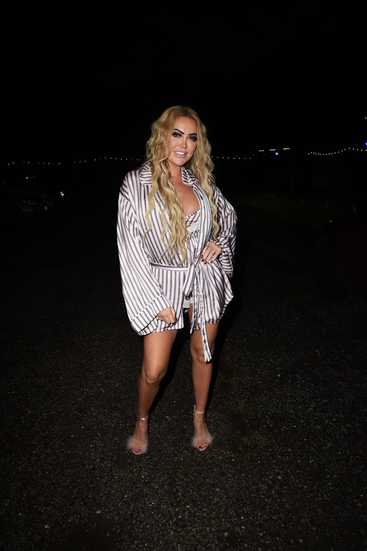 Английская телеведущая, модель и колумнист Эйслин Хорган-Уоллес (41) демонстрирует свои груди и ноги на VIP-вечере в кинотеатре Tulleys Haunted Drive-In в центре мероприятий Tulleys Farm, Тернерс Хилл, Кроули, Суссекс, 10/08/2020.