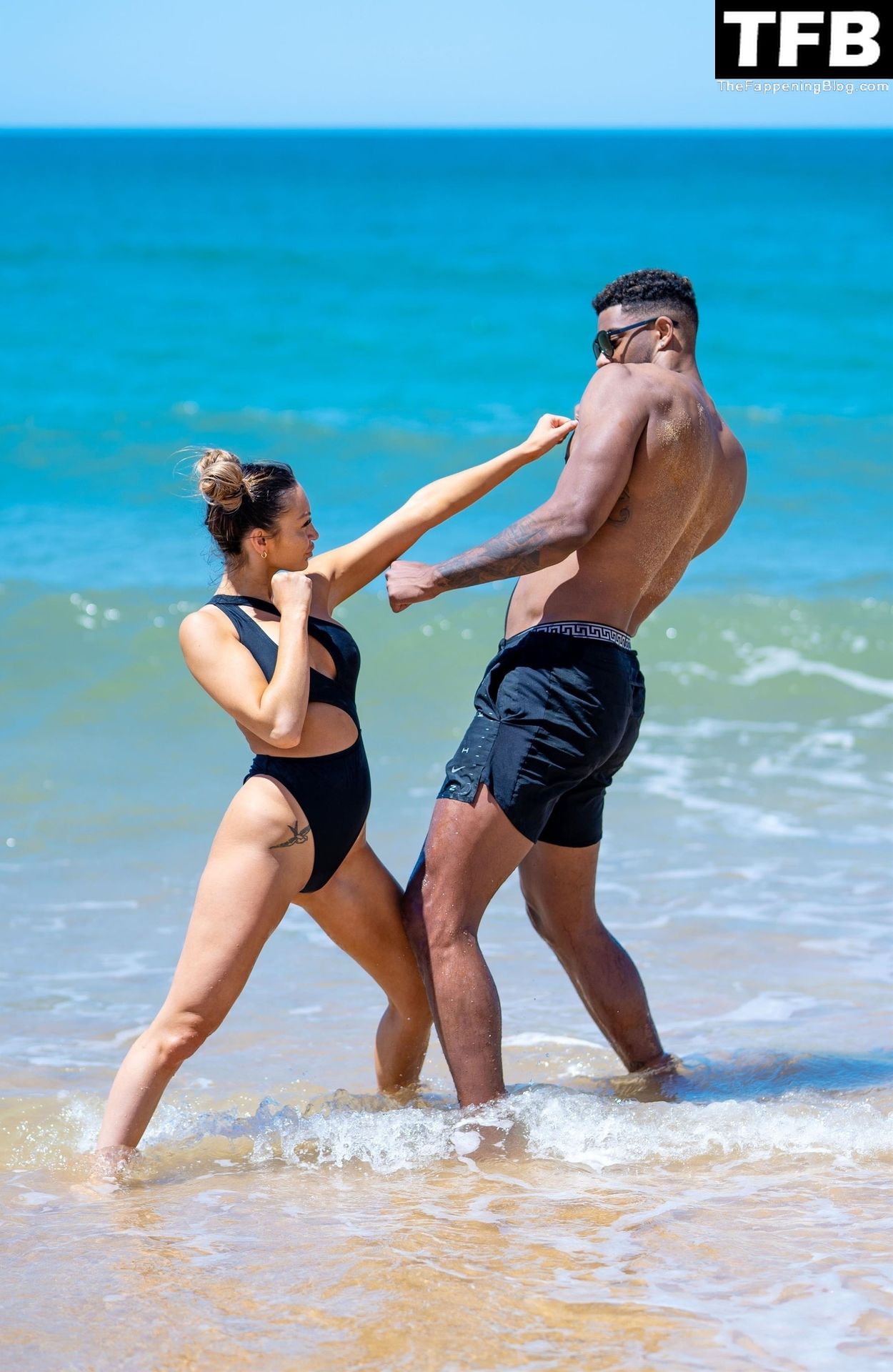 Звёзды шоу “Celeb MMA”, AJ Бункер и Тео Кэмпбелл наслаждаются отдыхом от изнурительного буткемпа, весело проводя время на солнце с небольшой игровой схваткой на пляжах Алгарве, 28.05.2022.
