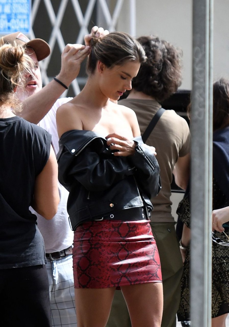 Бразильская модель Алессандра Амбросио старается избежать конфуза с одеждой в черной кожаной куртке и красной юбке для фотосессии Elle Italy в Литтл Гаване, Флорида, 23.01.2019.