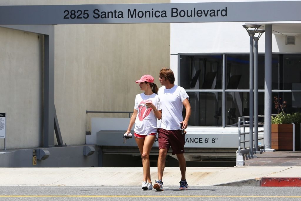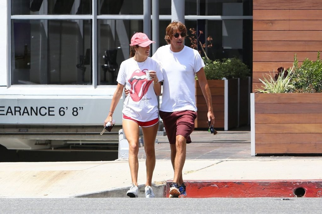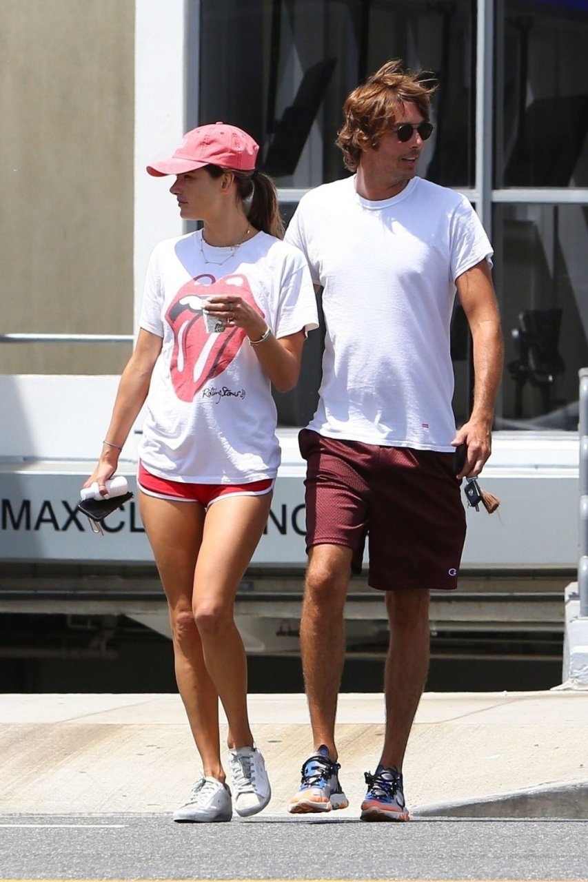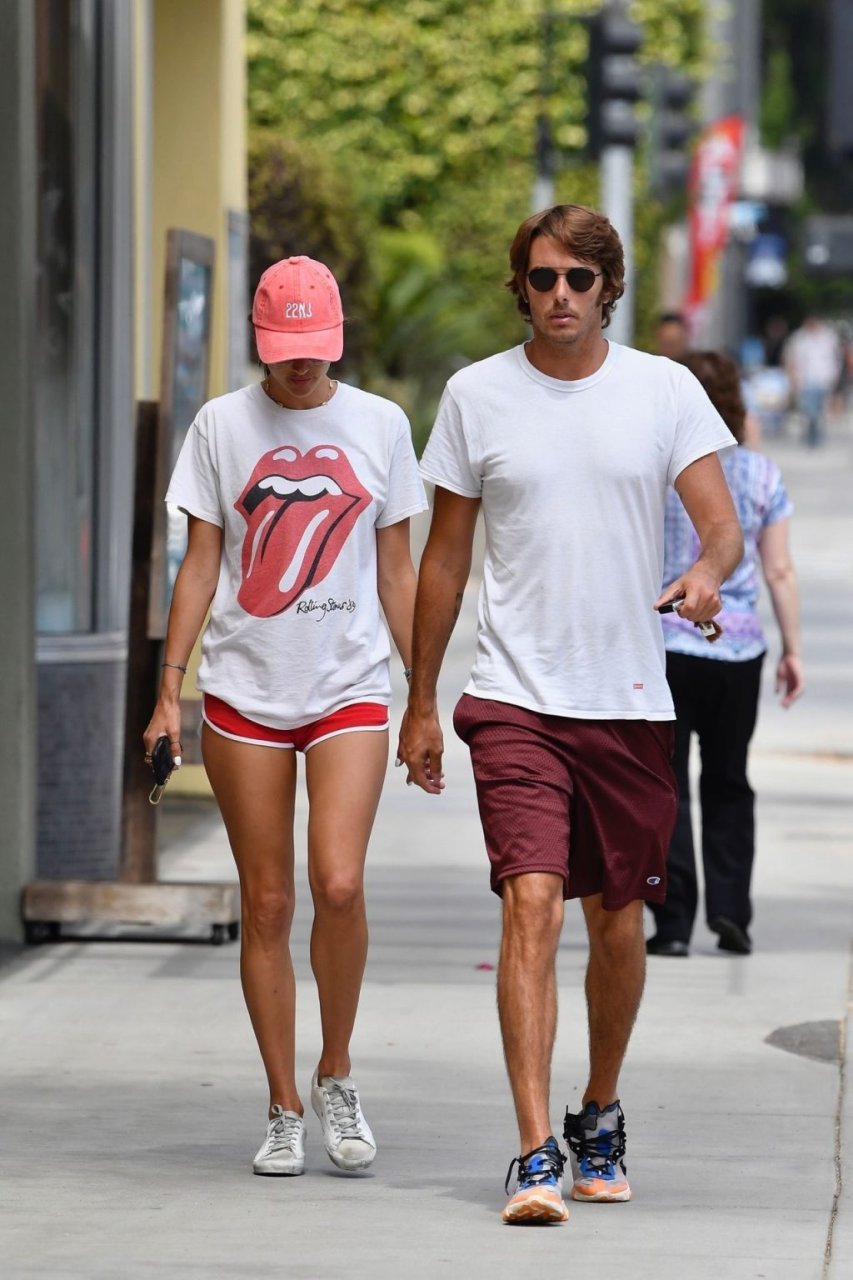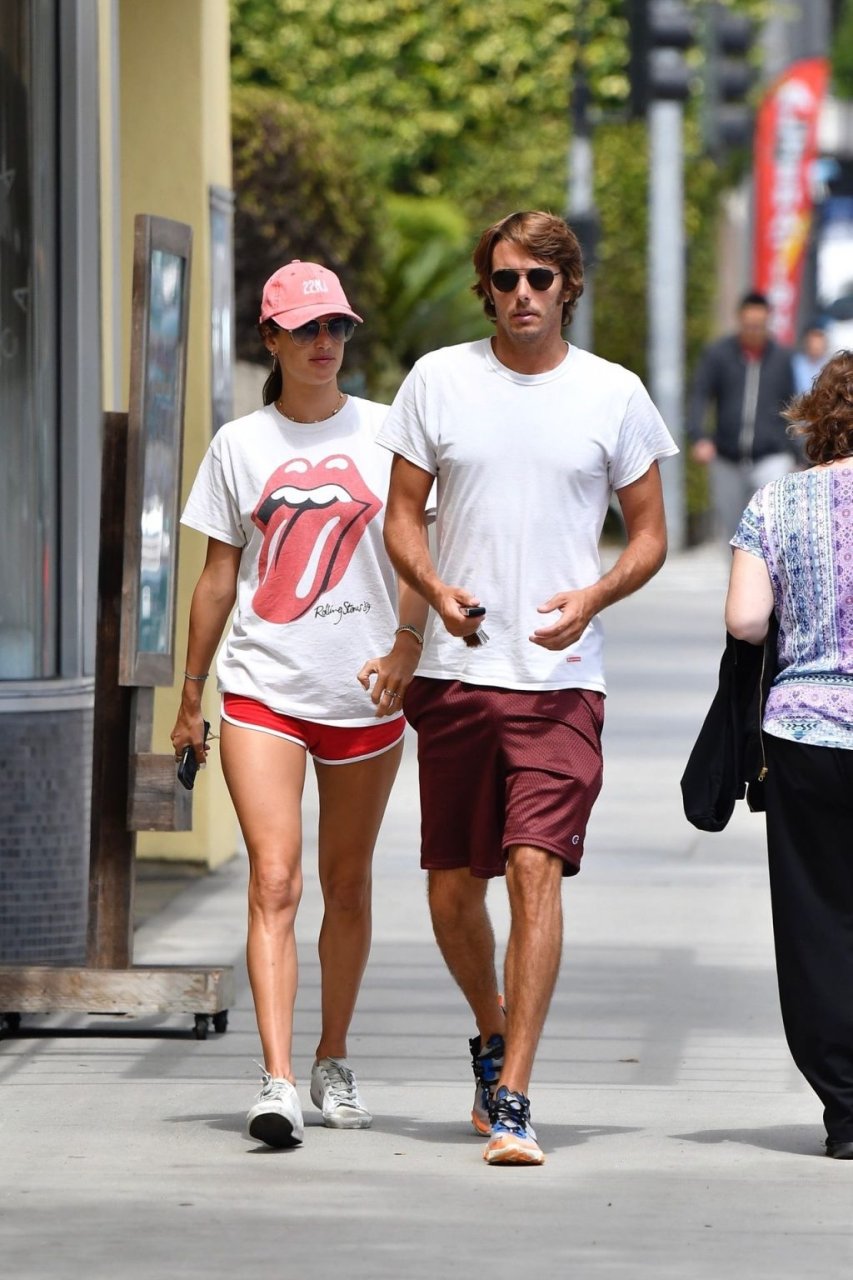 Бразильская супермодель Александра Амбросио и её возлюбленный Николо Одди отправляются на обед в Санта-Монике в Tocaya Organica, 22.08.2019. Александра одета в футболку Rolling Stones, красные короткие шорты и красную шляпу для своего обеда.