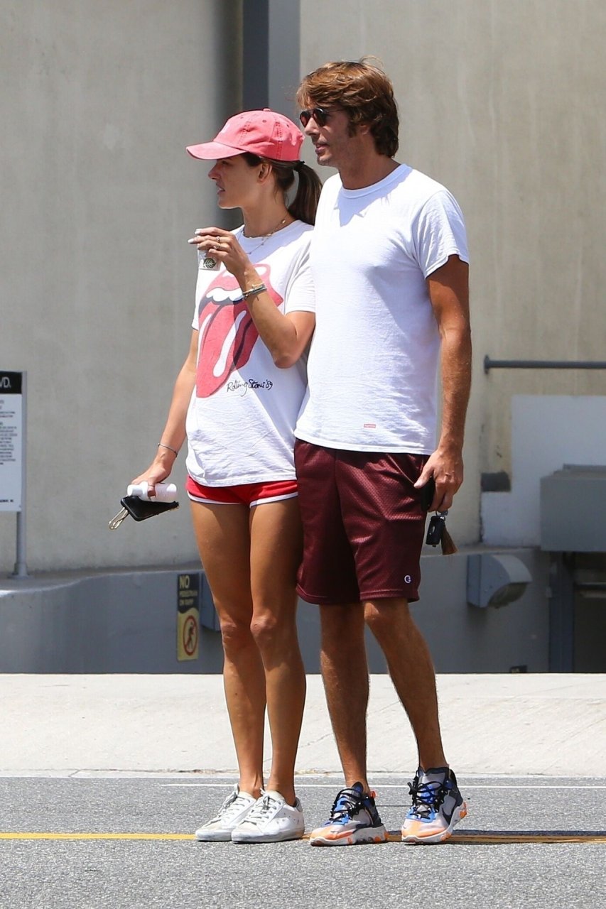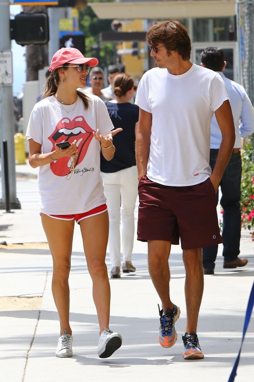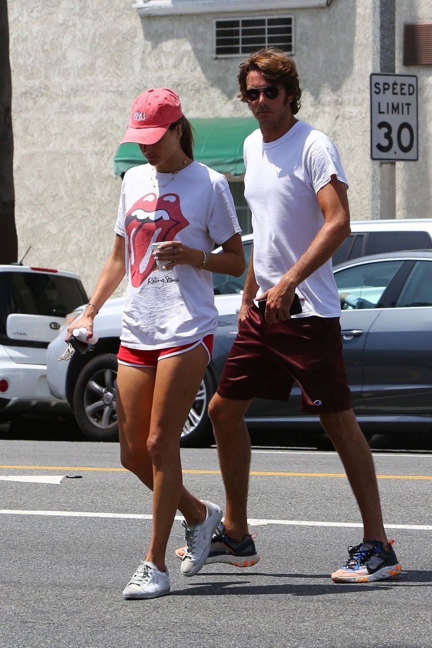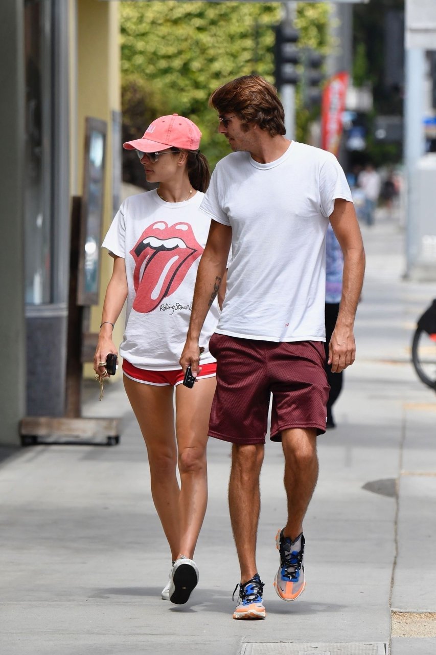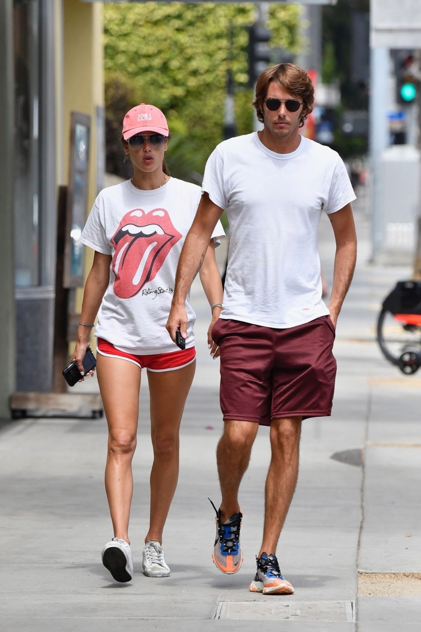 Бразильская супермодель Александра Амбросио и её возлюбленный Николо Одди отправляются на обед в Санта-Монике в Tocaya Organica, 22.08.2019. Александра одета в футболку Rolling Stones, красные короткие шорты и красную шляпу для своего обеда.