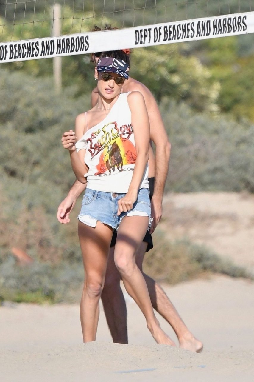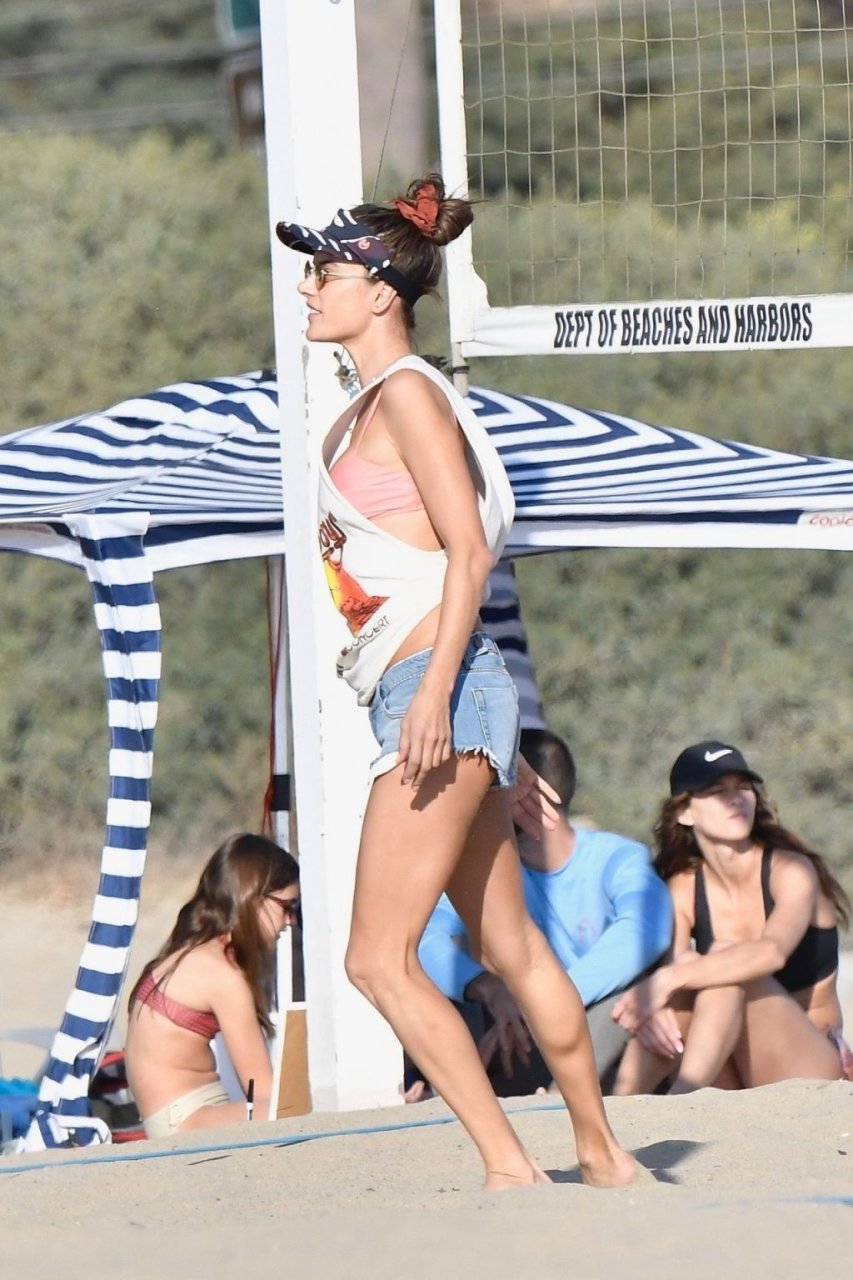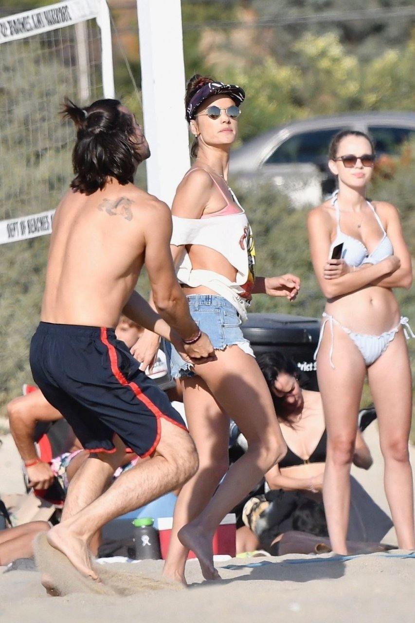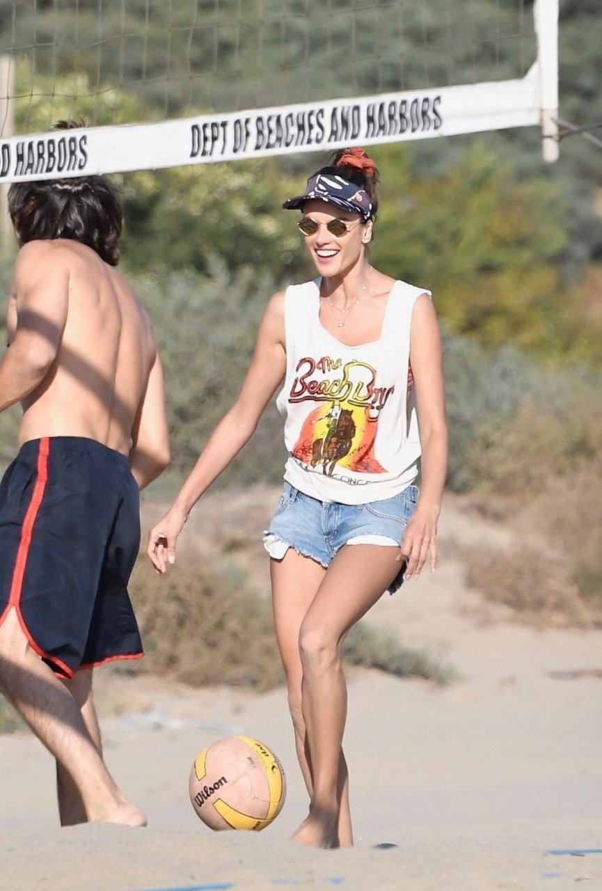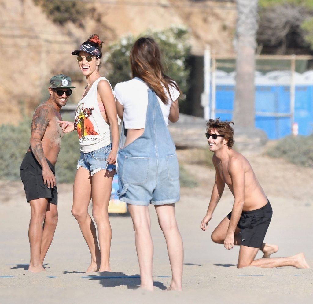Александра Амбросио наслаждается прекрасным субботним днем, играя в волейбол на пляже Санта-Моника с детьми, бойфрендом Николо Одди и друзьями, 13.10.2019. 38-летняя бразильская красавица выглядела так, будто отлично проводит время с широкой улыбкой на лице.