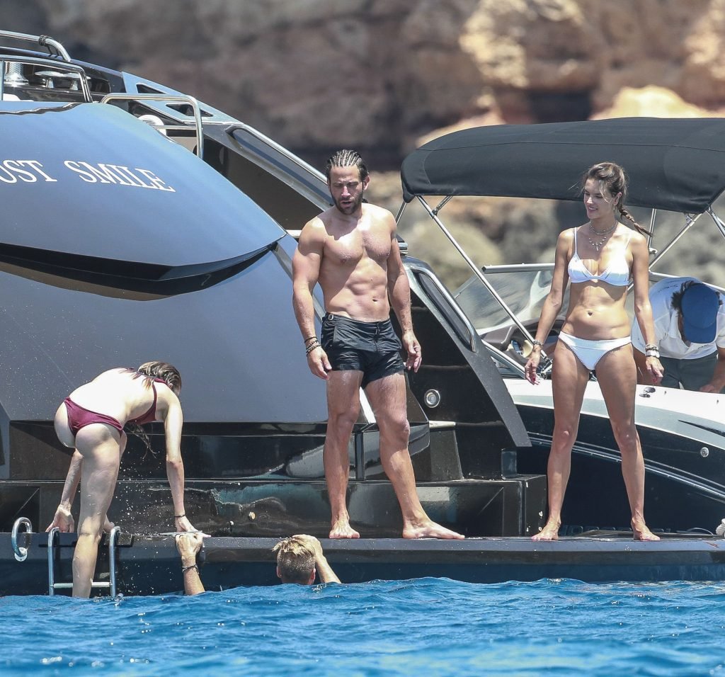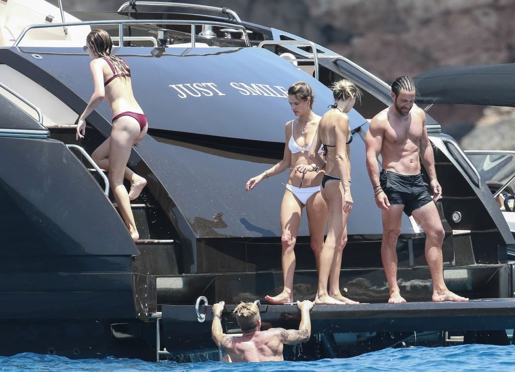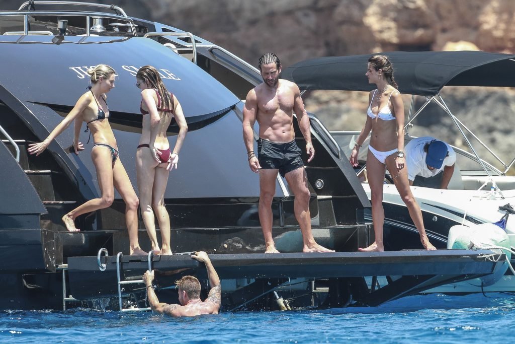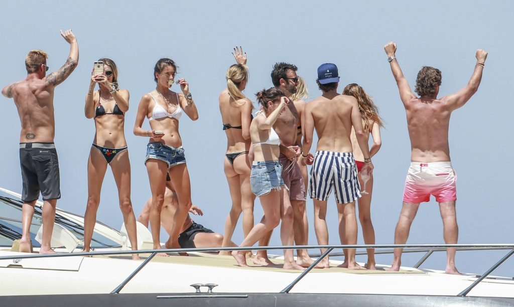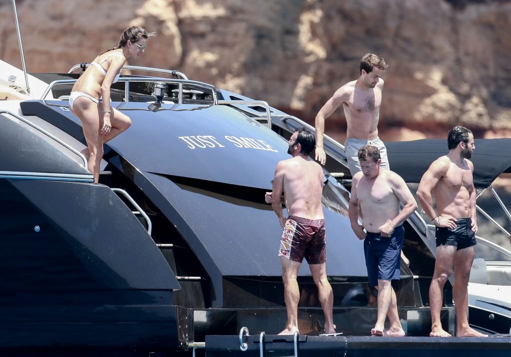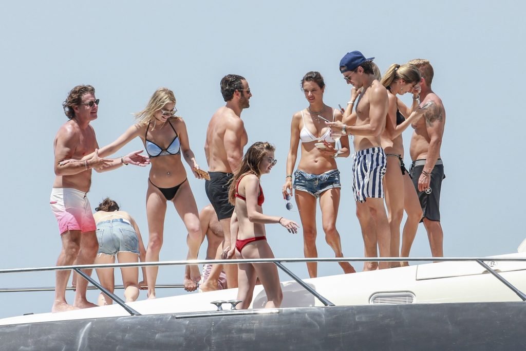 Супермодель Александра Амбросио с женихом Джейми Мазуром, Талитой Корреа, Луди Дельфино и другими друзьями наслаждались прогулкой на красивой лодке во время отпуска на Ибице, 11.07.2017.
