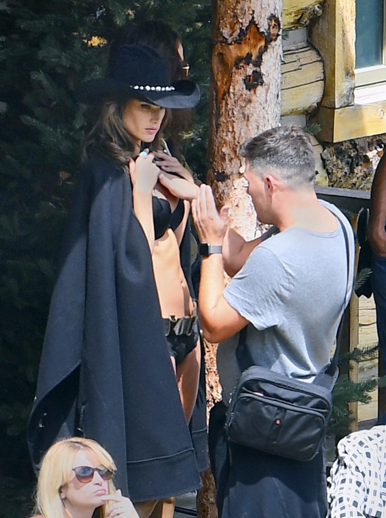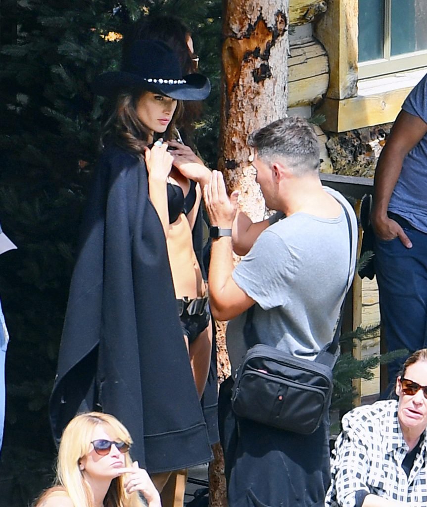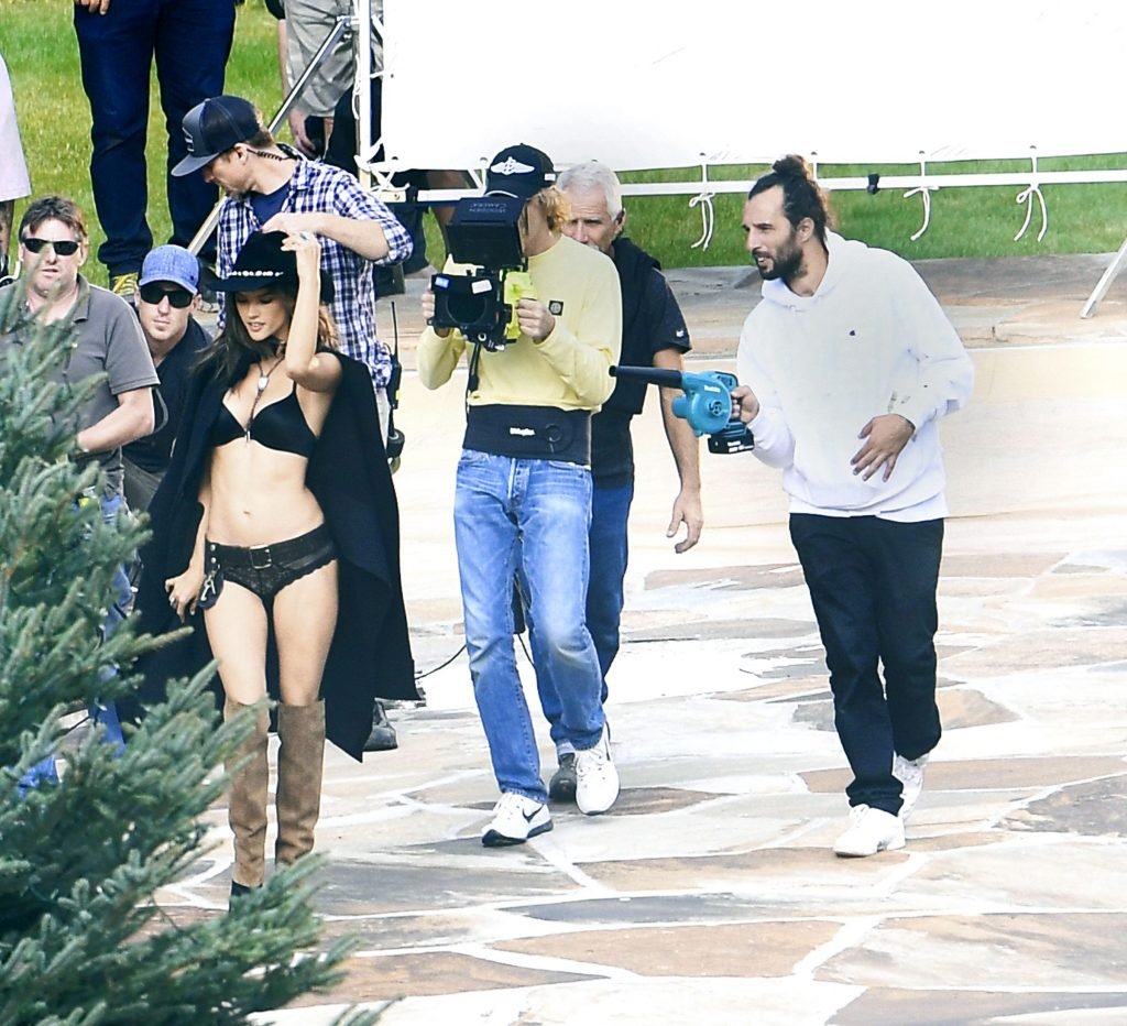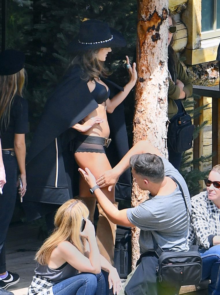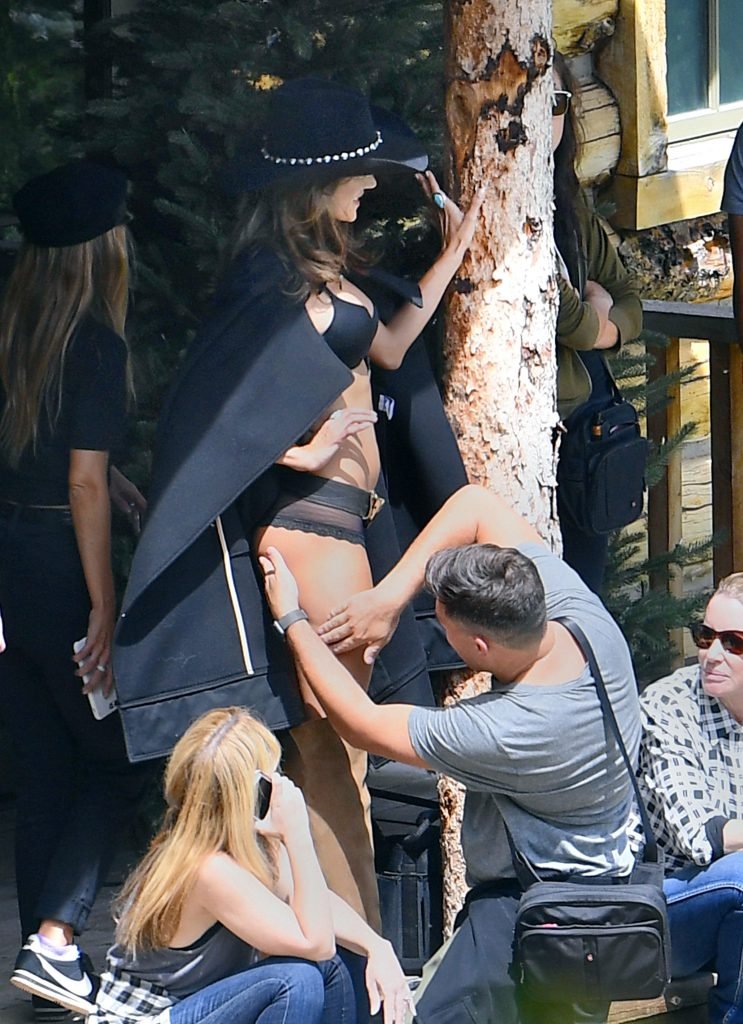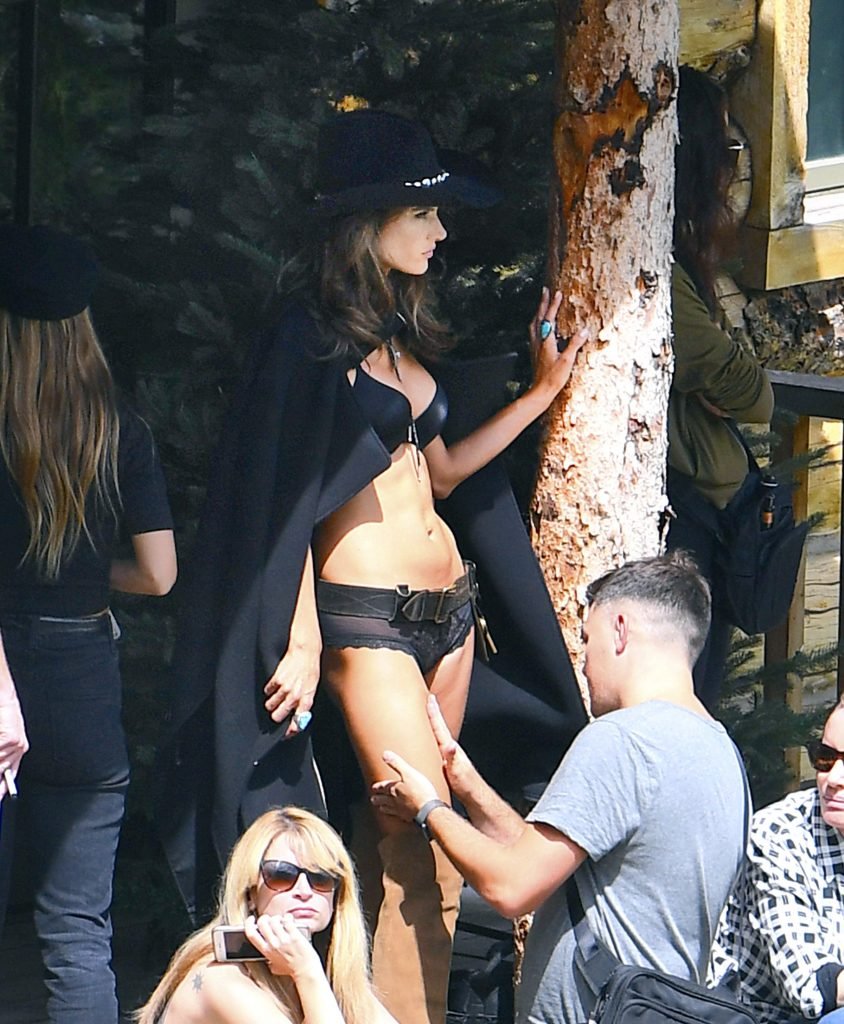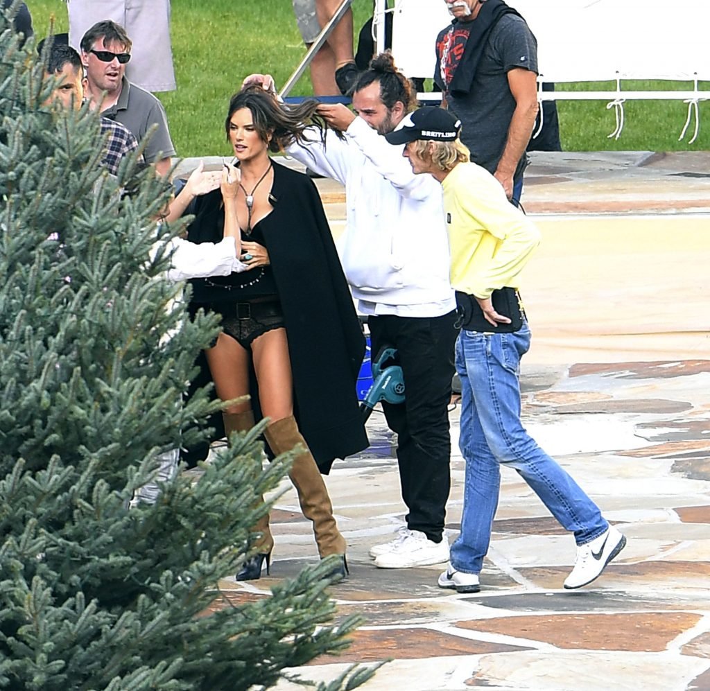 Супермодель Александра Амбросио была замечена, когда её намазывали маслом во время фотосессии для предстоящего праздничного каталога Victoria Secret в Аспене, 15.08.2017.