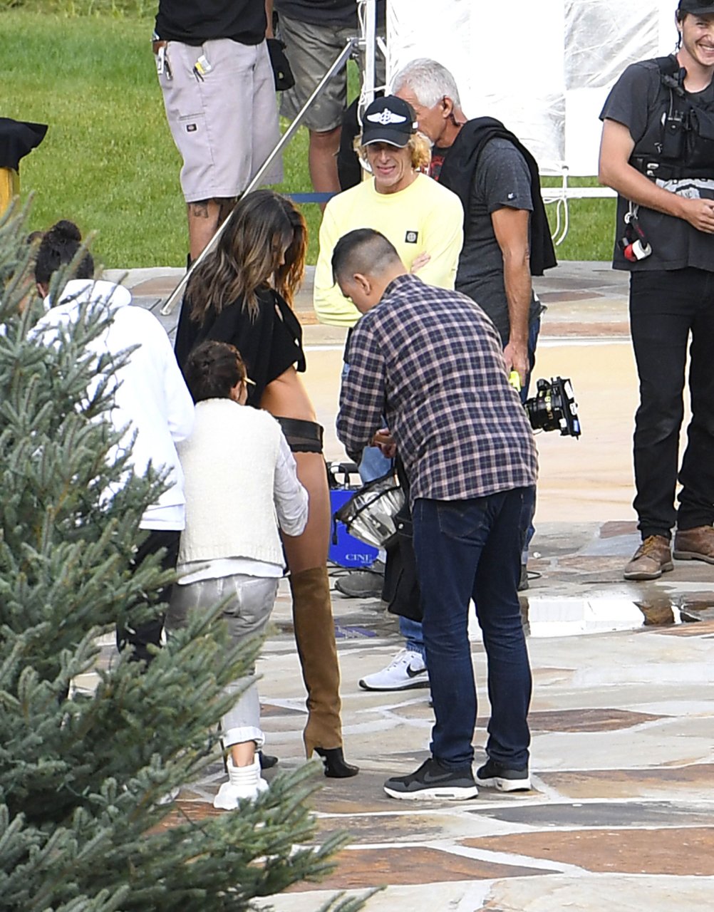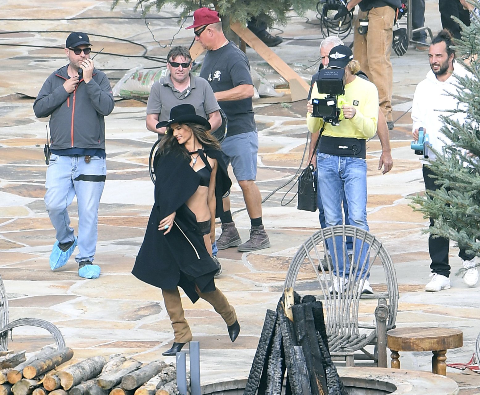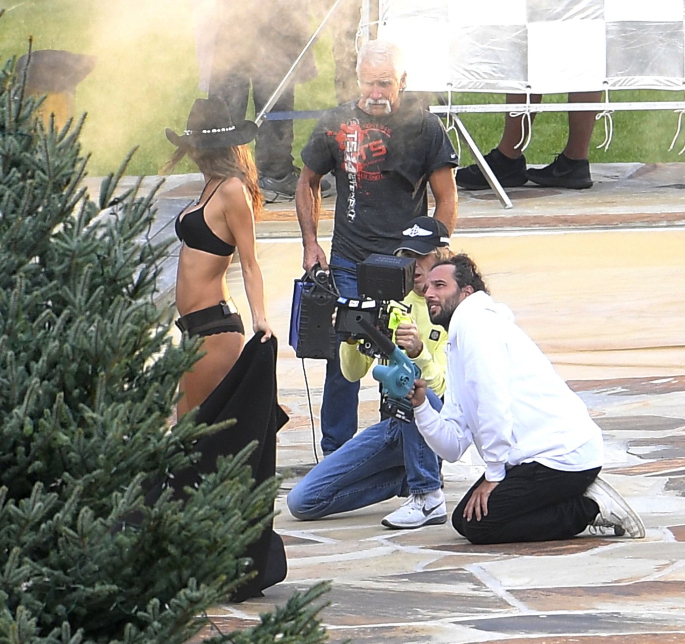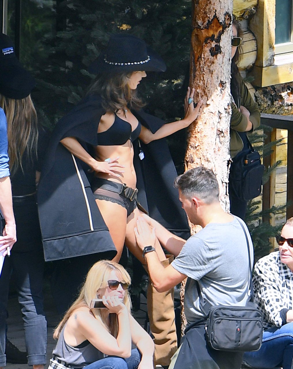 Супермодель Александра Амбросио была замечена, когда её намазывали маслом во время фотосессии для предстоящего праздничного каталога Victoria Secret в Аспене, 15.08.2017.