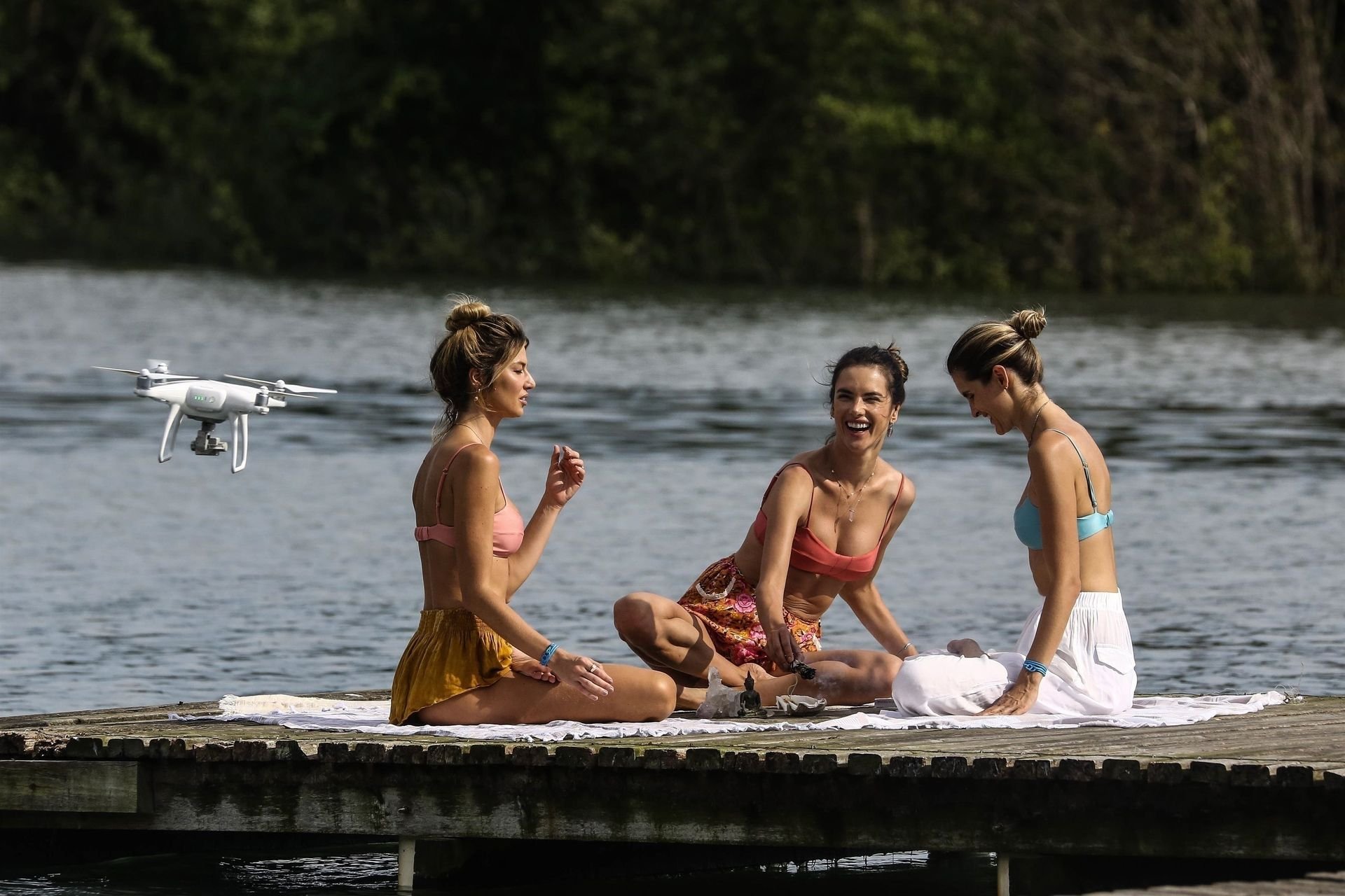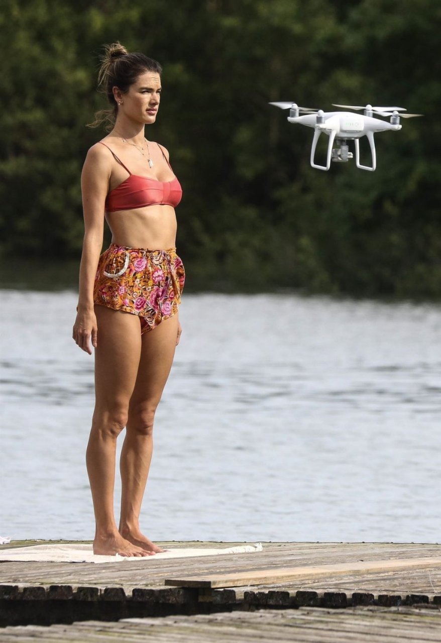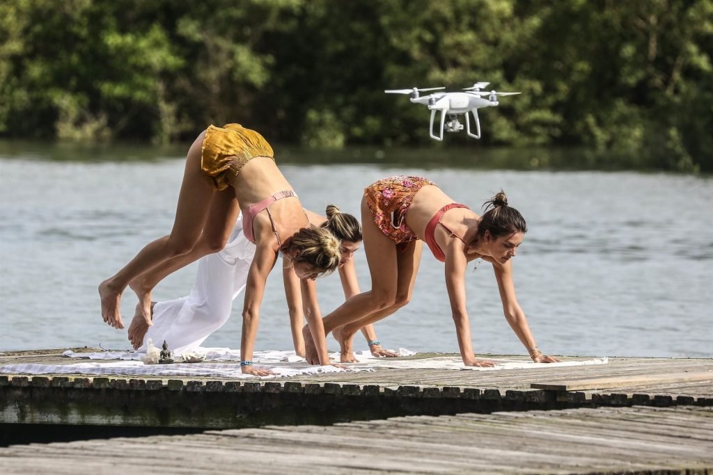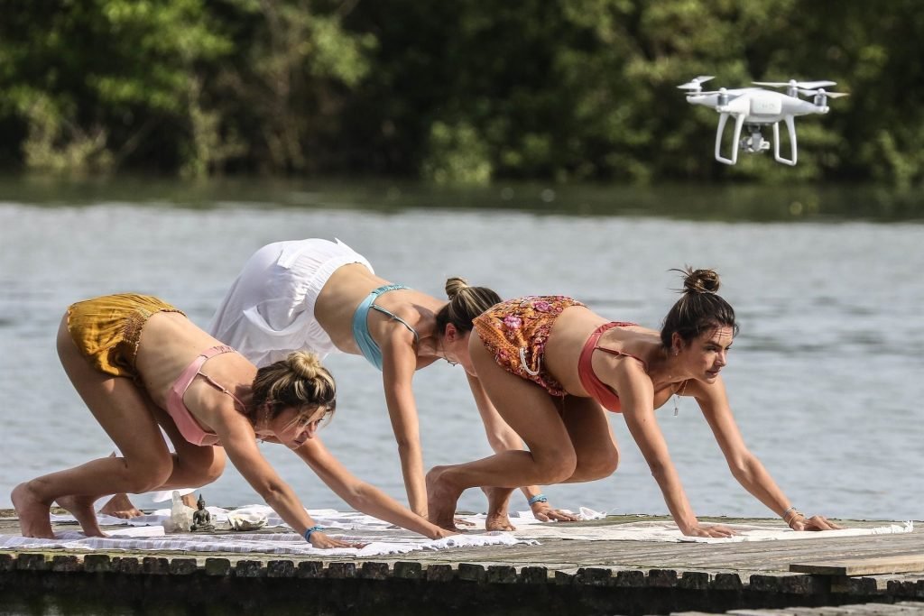 Александра, которая одета в двухцветный купальник цвета каштан, присоединилась к двум красавицам для занятий йогой на пляже. Супермодель и мать троих детей, попросила оператора с дроном задокументировать упражнение.