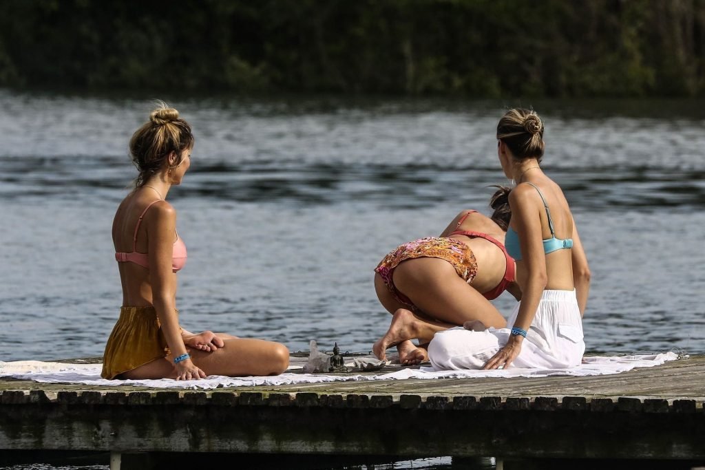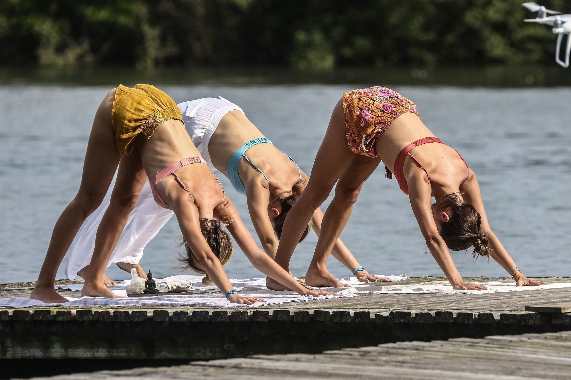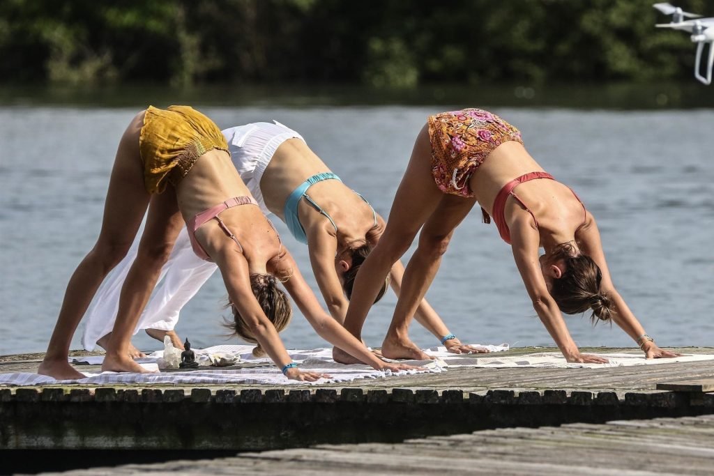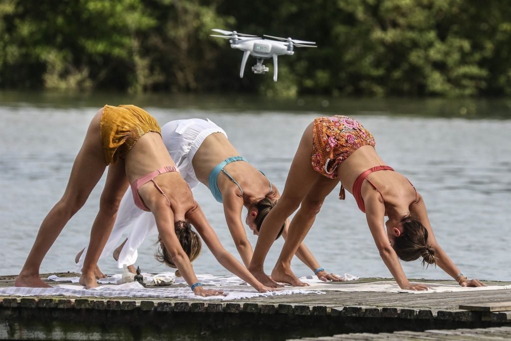 Александра, которая одета в двухцветный купальник цвета каштан, присоединилась к двум красавицам для занятий йогой на пляже. Супермодель и мать троих детей, попросила оператора с дроном задокументировать упражнение.
