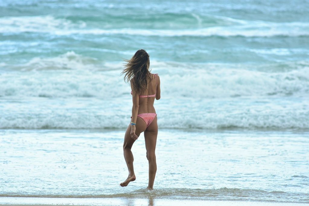 Модель Victoria’s Secret и бывший ангел Александра Амбросио воспользовалась пустым пляжем в этот поздний воскресный вечер во Флорианополисе. Идея была нырнуть, но так как вода была очень холодной, она просто намочила ноги и прошлась по песку.