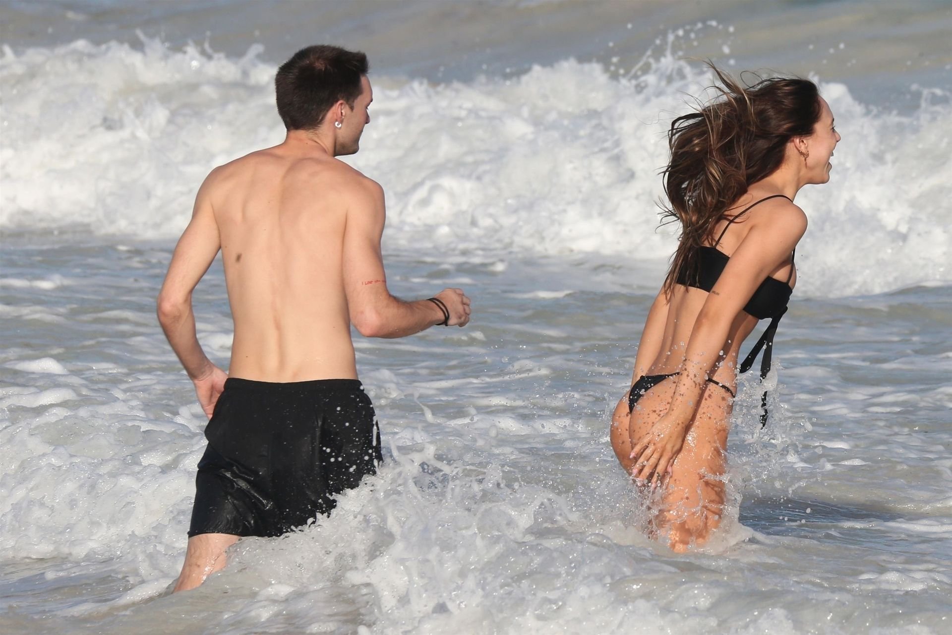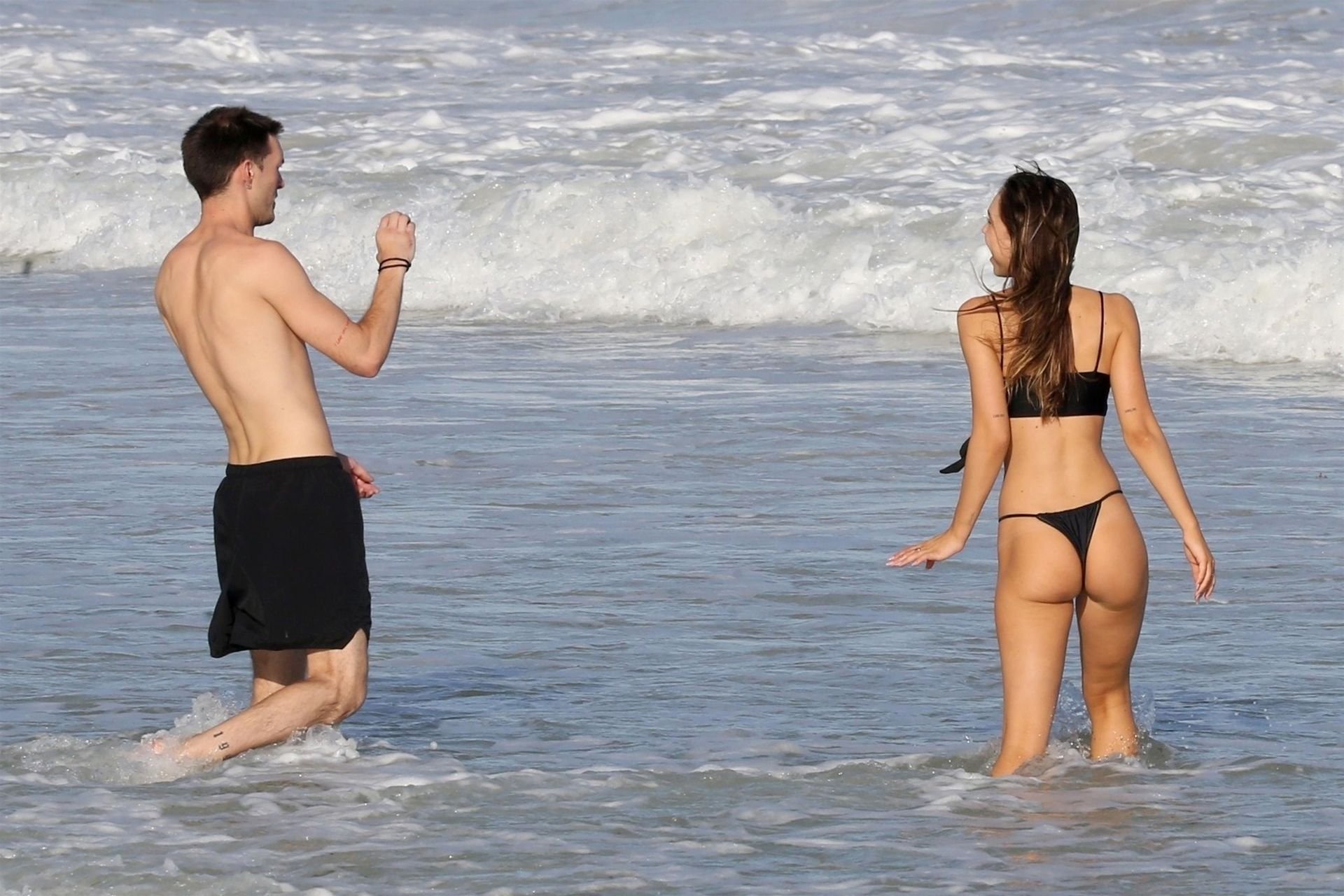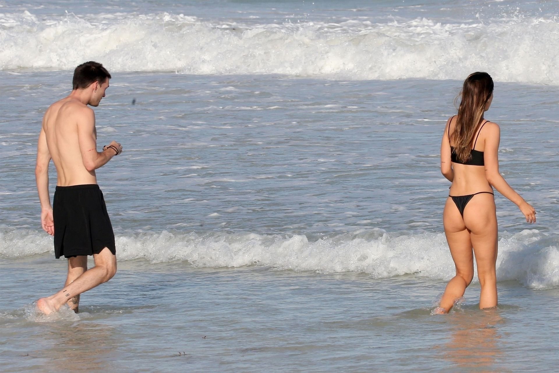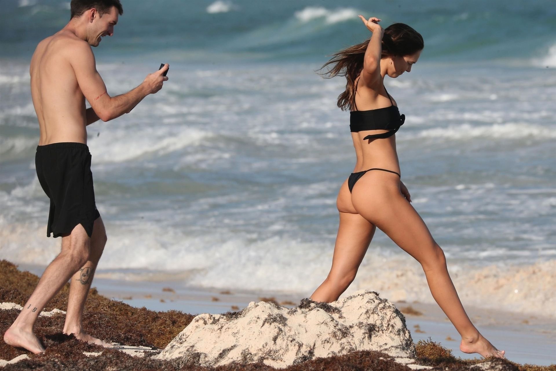 Модель и бывшая участница шоу “Танцы со звёздами” наслаждается отдыхом, чтобы начать 2019 год в курортном отеле Casa Malca Tulum в Кинтана-Роо, Мексика, 01/04/2019. Она сногсшибательно выглядит в крошечном чёрном бикини, когда она и мужчина сталкиваются с волнами на переполненном пляже.
