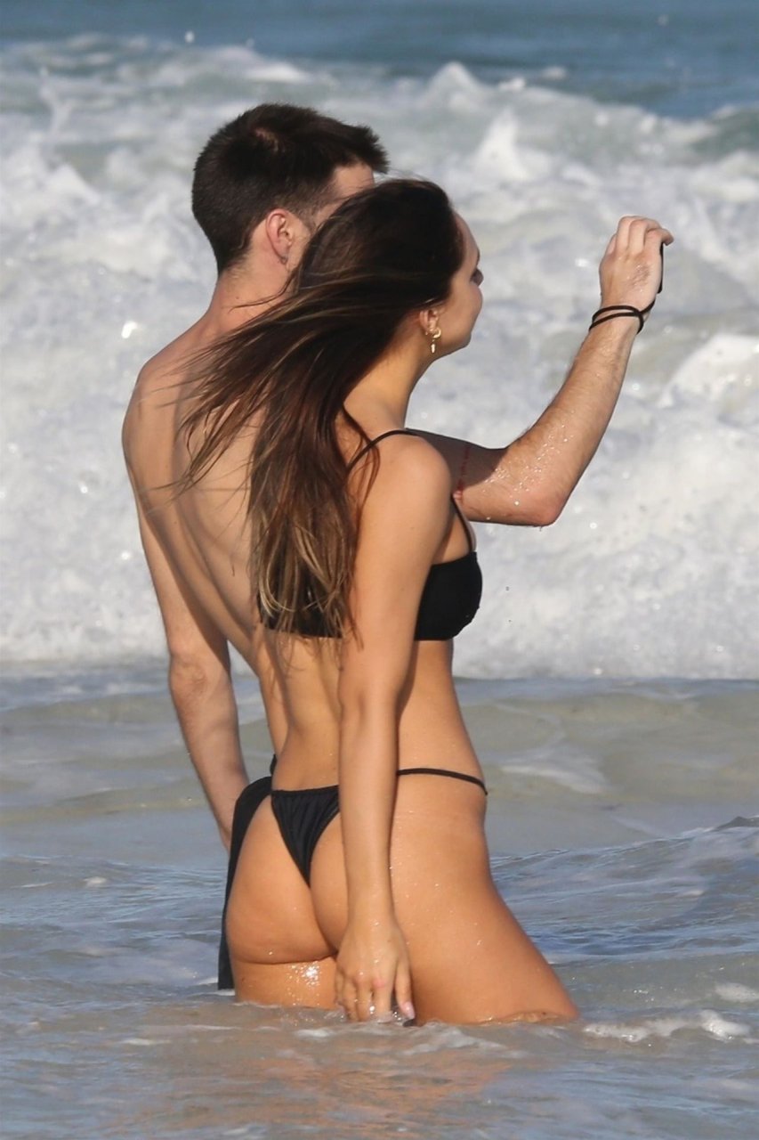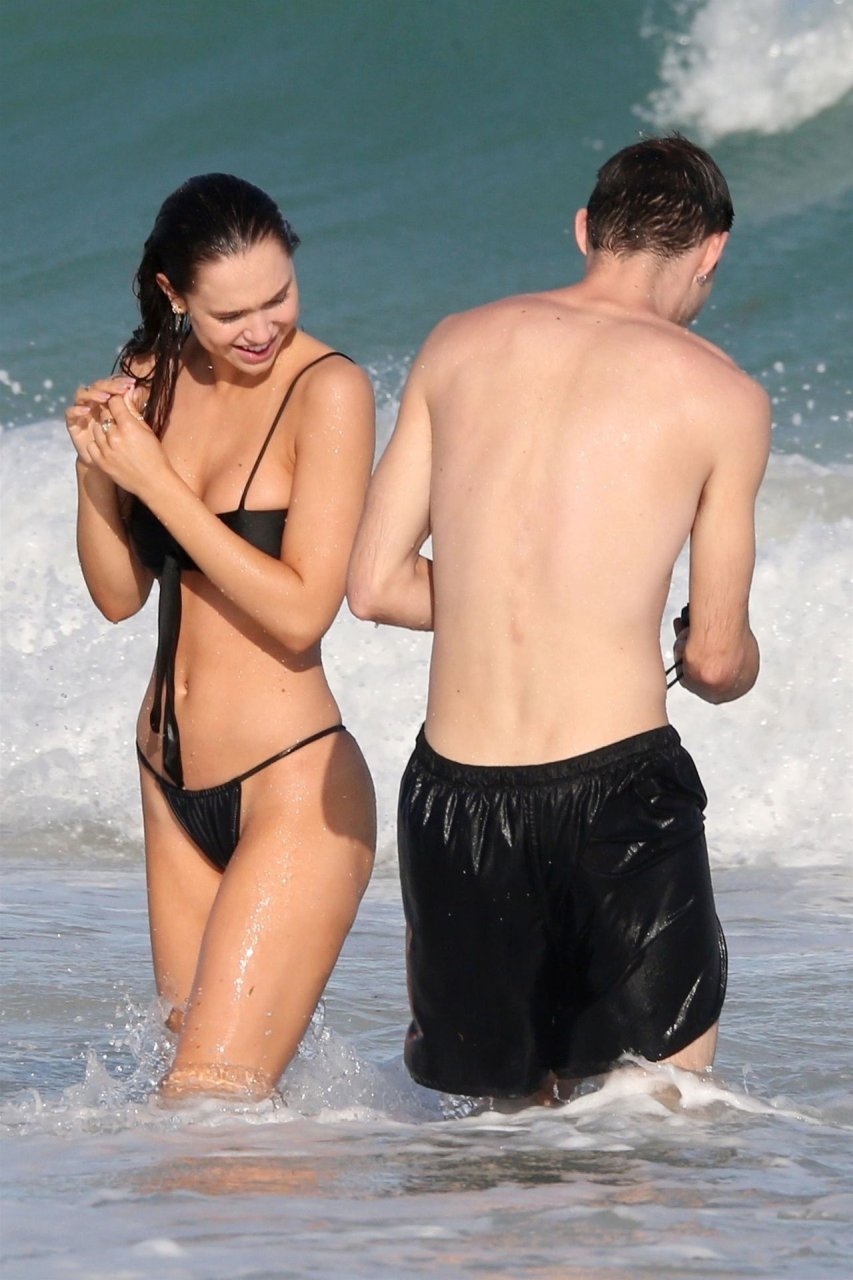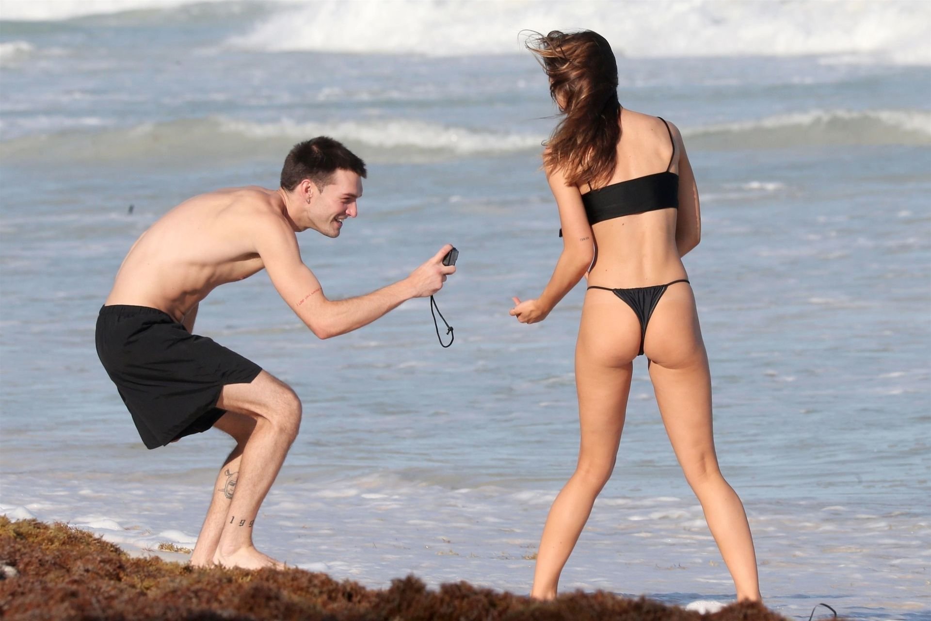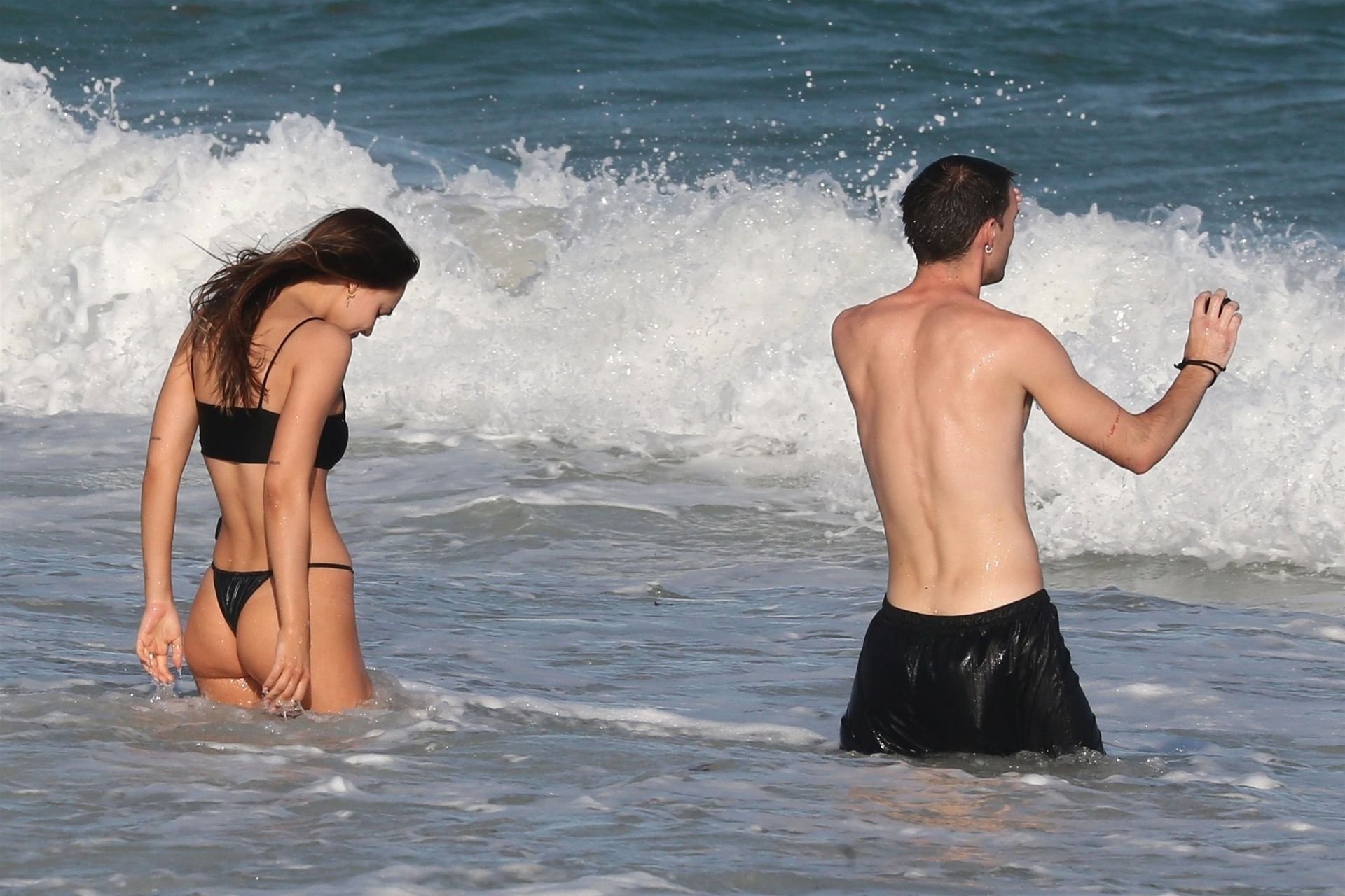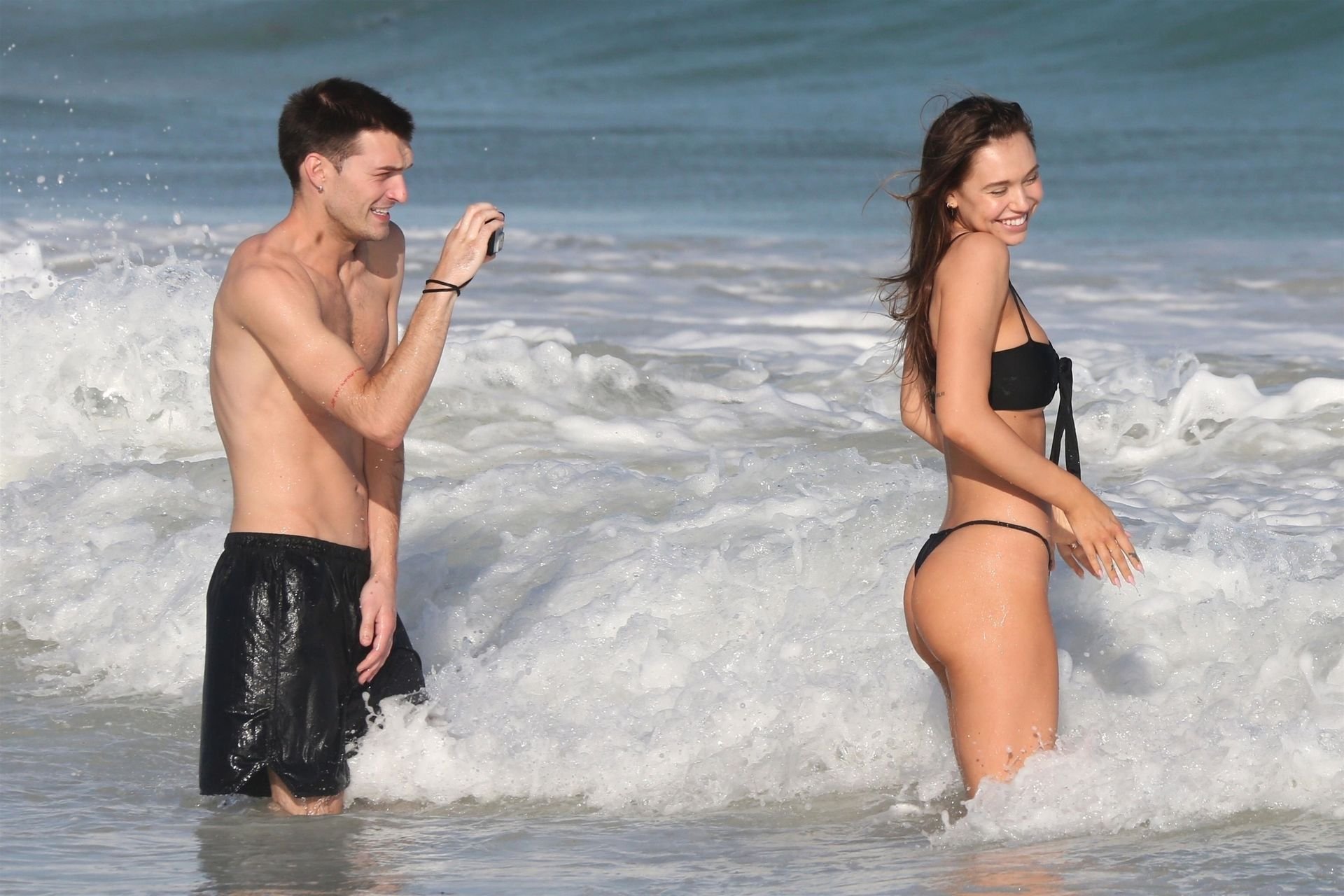 Модель и бывшая участница шоу “Танцы со звёздами” наслаждается отдыхом, чтобы начать 2019 год в курортном отеле Casa Malca Tulum в Кинтана-Роо, Мексика, 01/04/2019. Она сногсшибательно выглядит в крошечном чёрном бикини, когда она и мужчина сталкиваются с волнами на переполненном пляже.