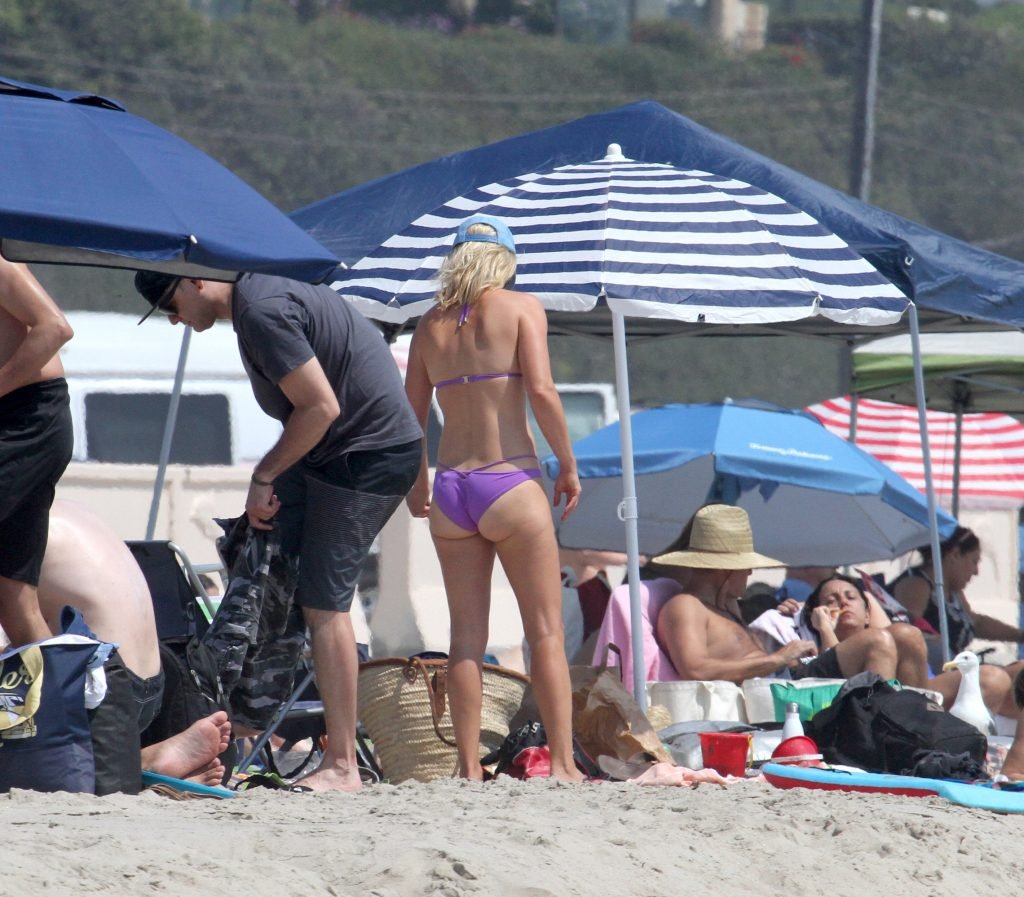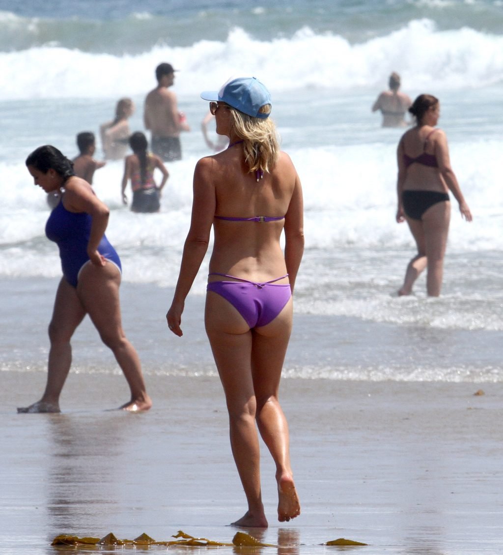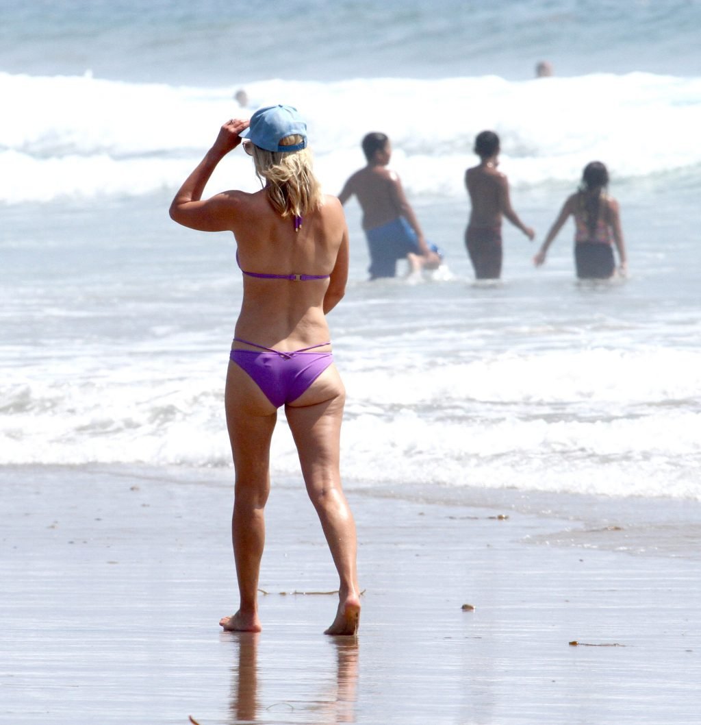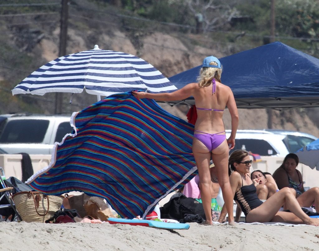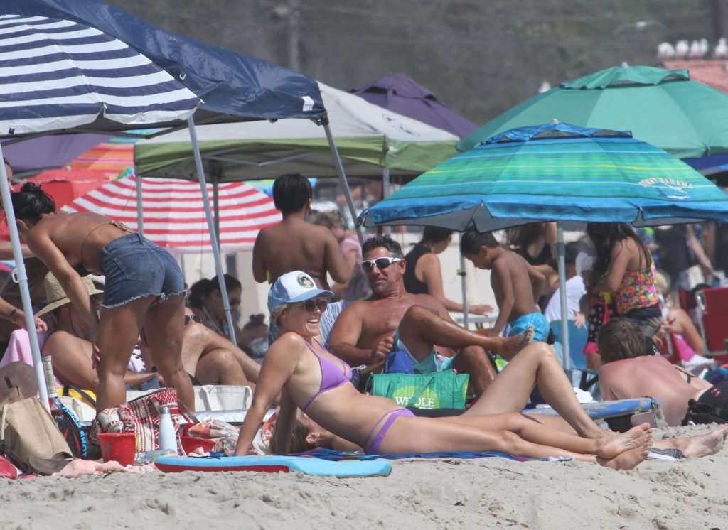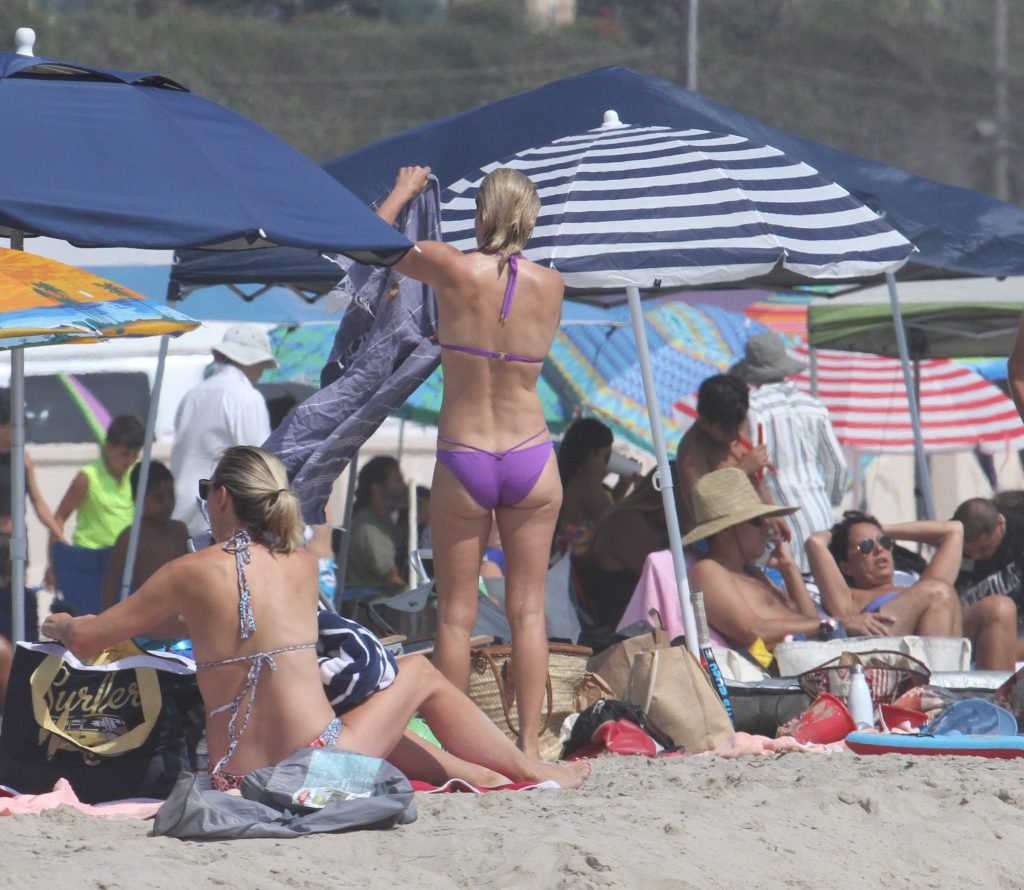 Али Лартер была замечена в бикини, строящей забавные гримасы, когда наносила масло для загара, купалась в океане с детьми и мужем Хейсом МакАртуром на пляже в Малибу, 14.08.2018. Алисон Элизабет (Али) Лартер — американская актриса и бывшая модель. Возраст: 42.