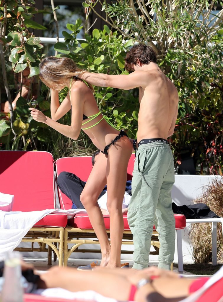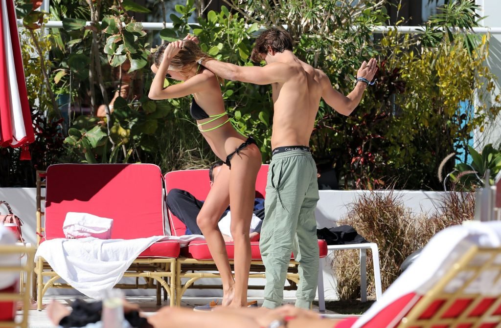 Модель Алина Байкова (28) загорает топлесс у бассейна в Майами-Бич, 12/10/2017.