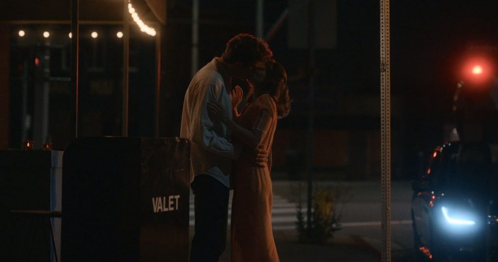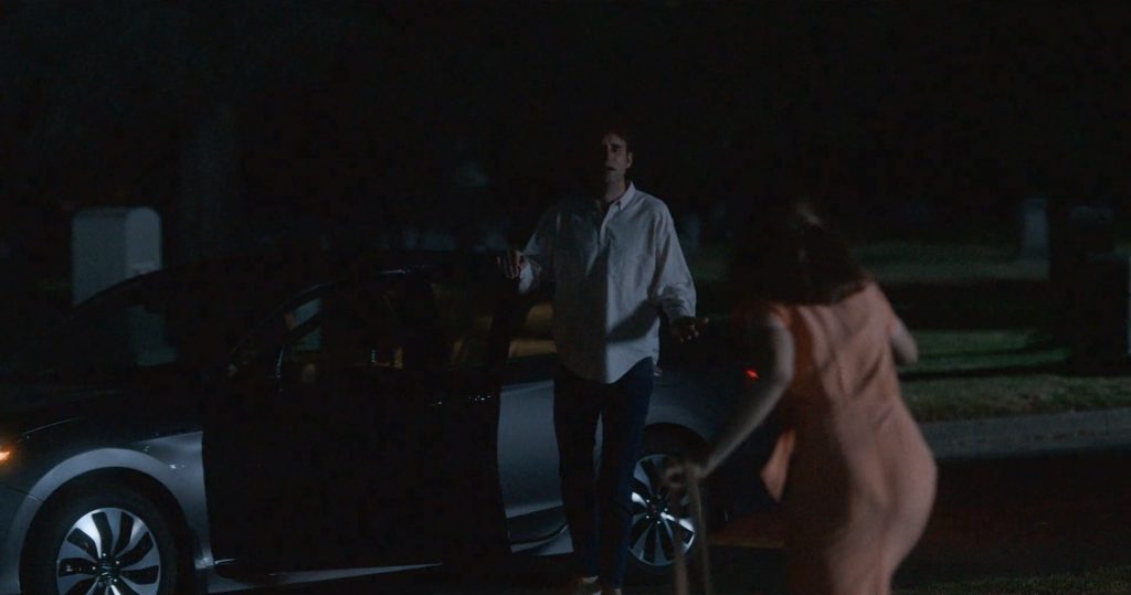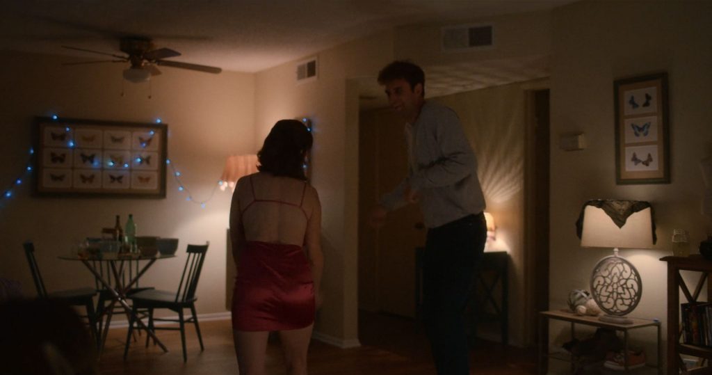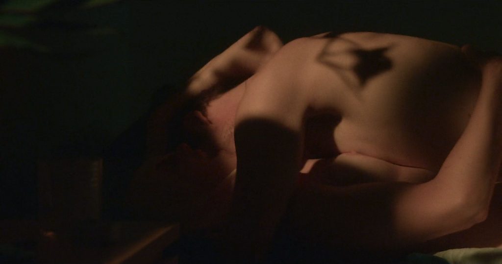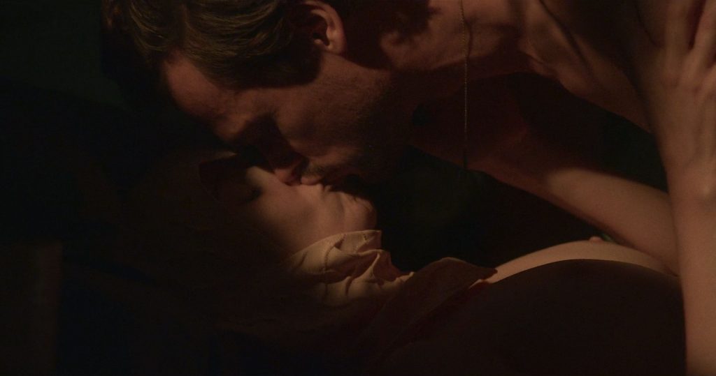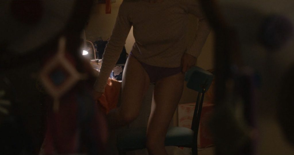 Алисон сидит рядом с мужчиной на кровати, в платье с таким же капюшоном, целует парня, когда он тянется расстегнуть платье и снять его. Вы видите её голую грудь, парень обнимает одну из них, после чего у них происходит секс.