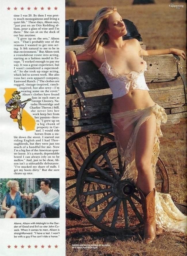 Посмотрите пикантные нюдовые и сексуальные фото/скриншоты Алисон Иствуд. Алисон Иствуд, родившаяся 22 мая 1972 года, — американская актриса, кинорежиссёр, фотомодель и дизайнер.