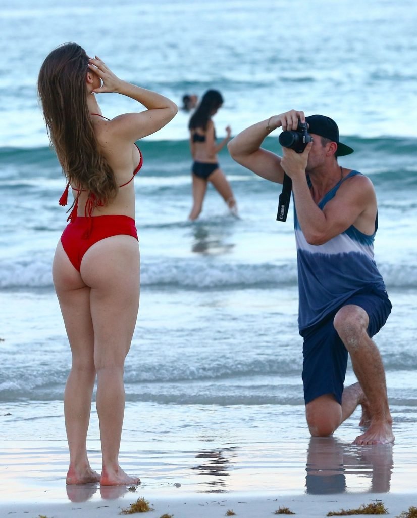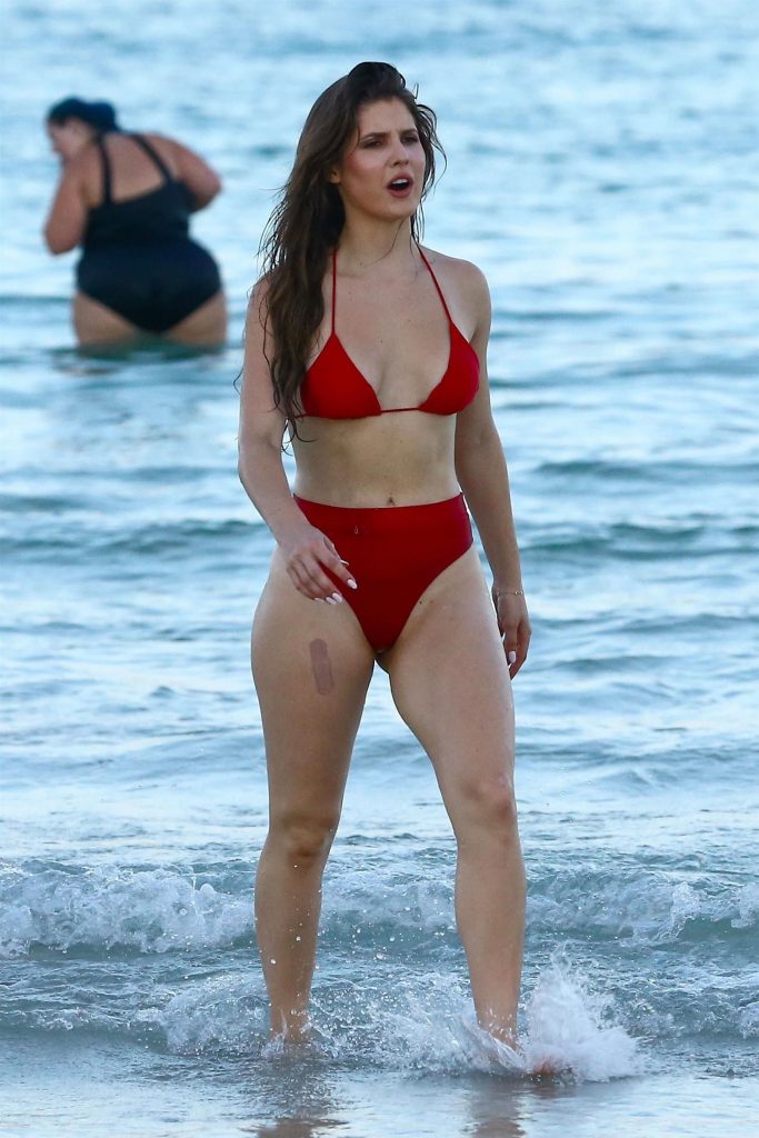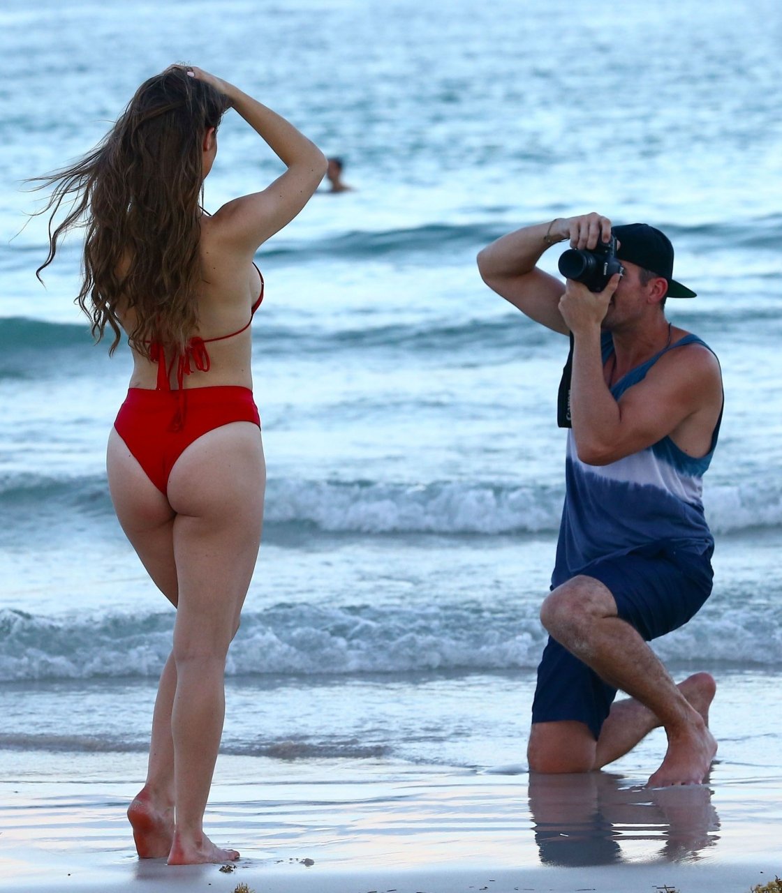 Модель и актриса Аманда Черни демонстрирует своё сексуальное тело в красном бикини во время фотосессии на пляже в Майами, 27.07.2017.