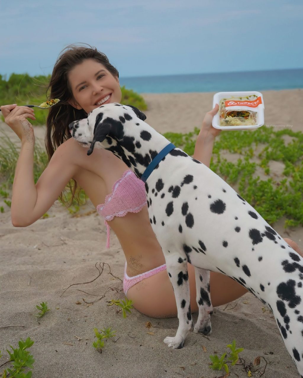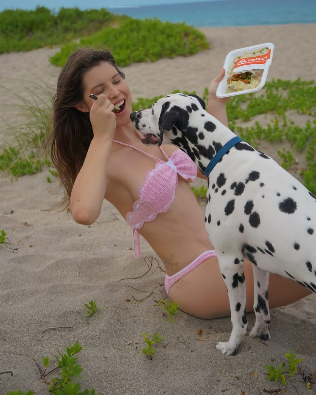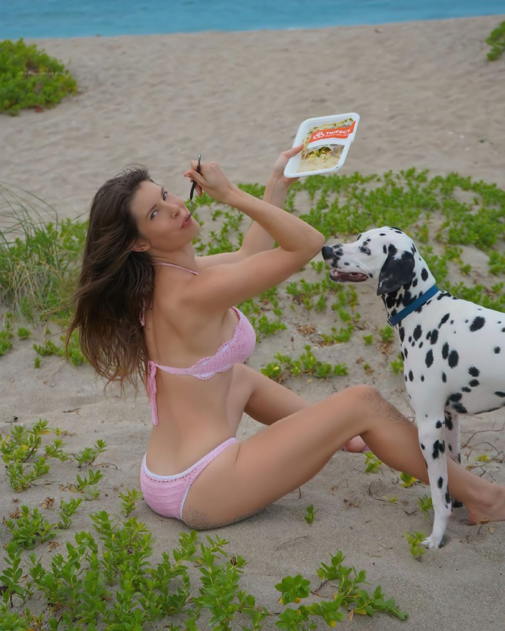 Amanda Cerny наслаждается днем с собакой на пляже. Модель демонстрирует свою красивую попу и стройную талию, позируя в розовом бикини для нового снимка в социальных сетях (май 2021).