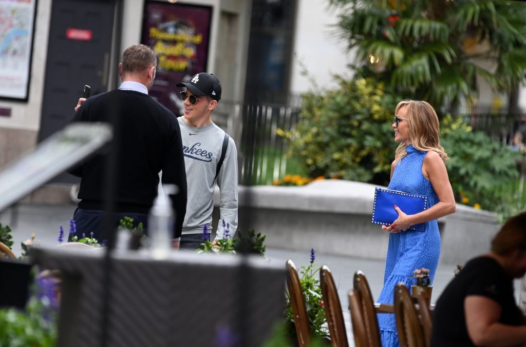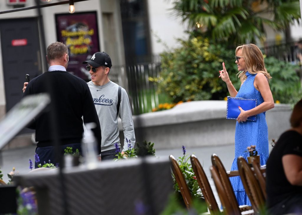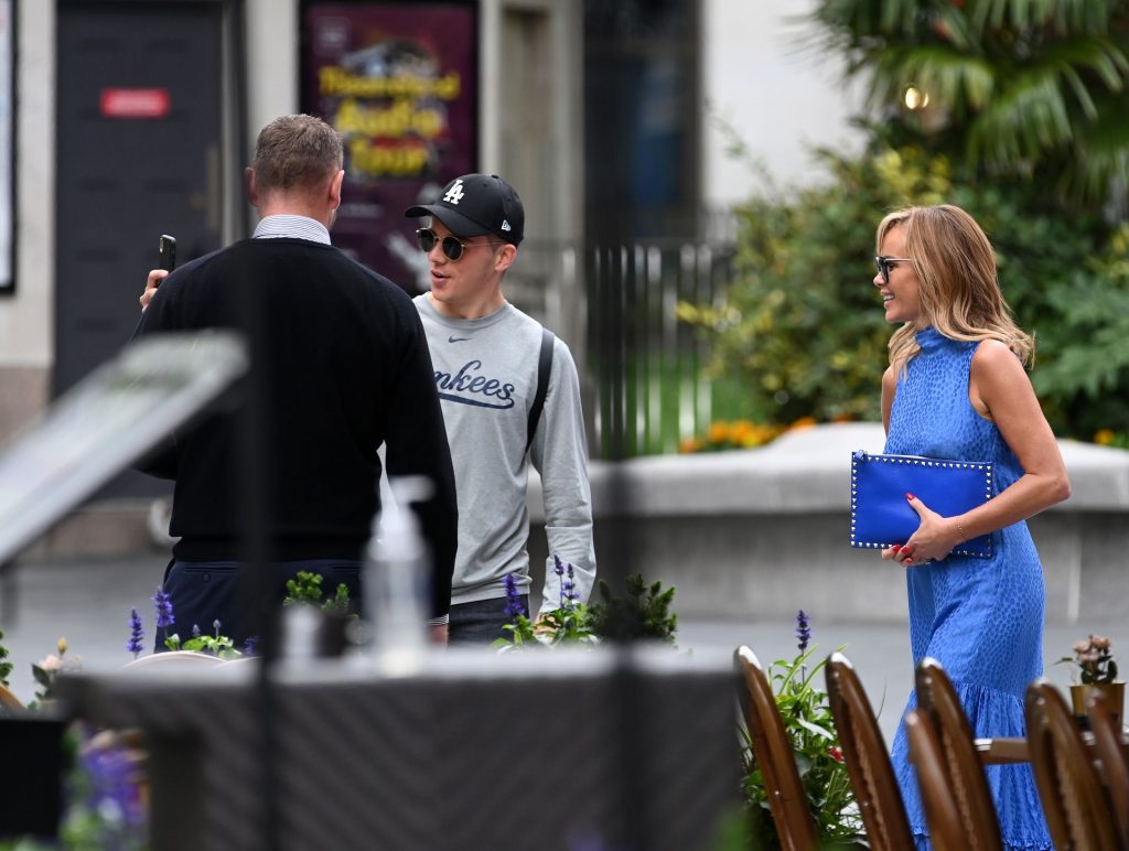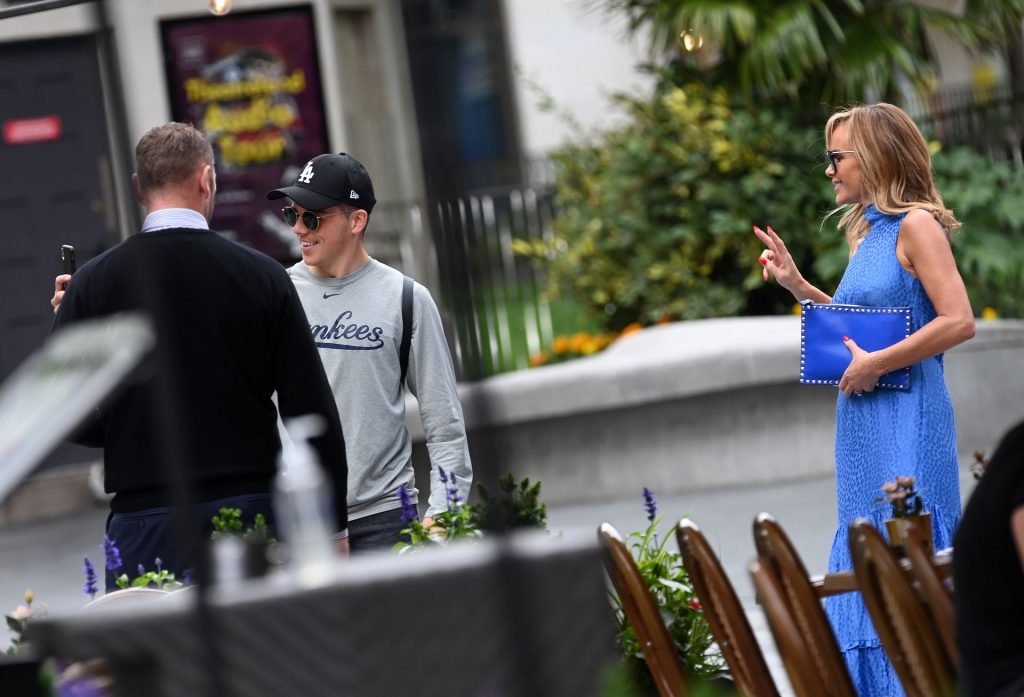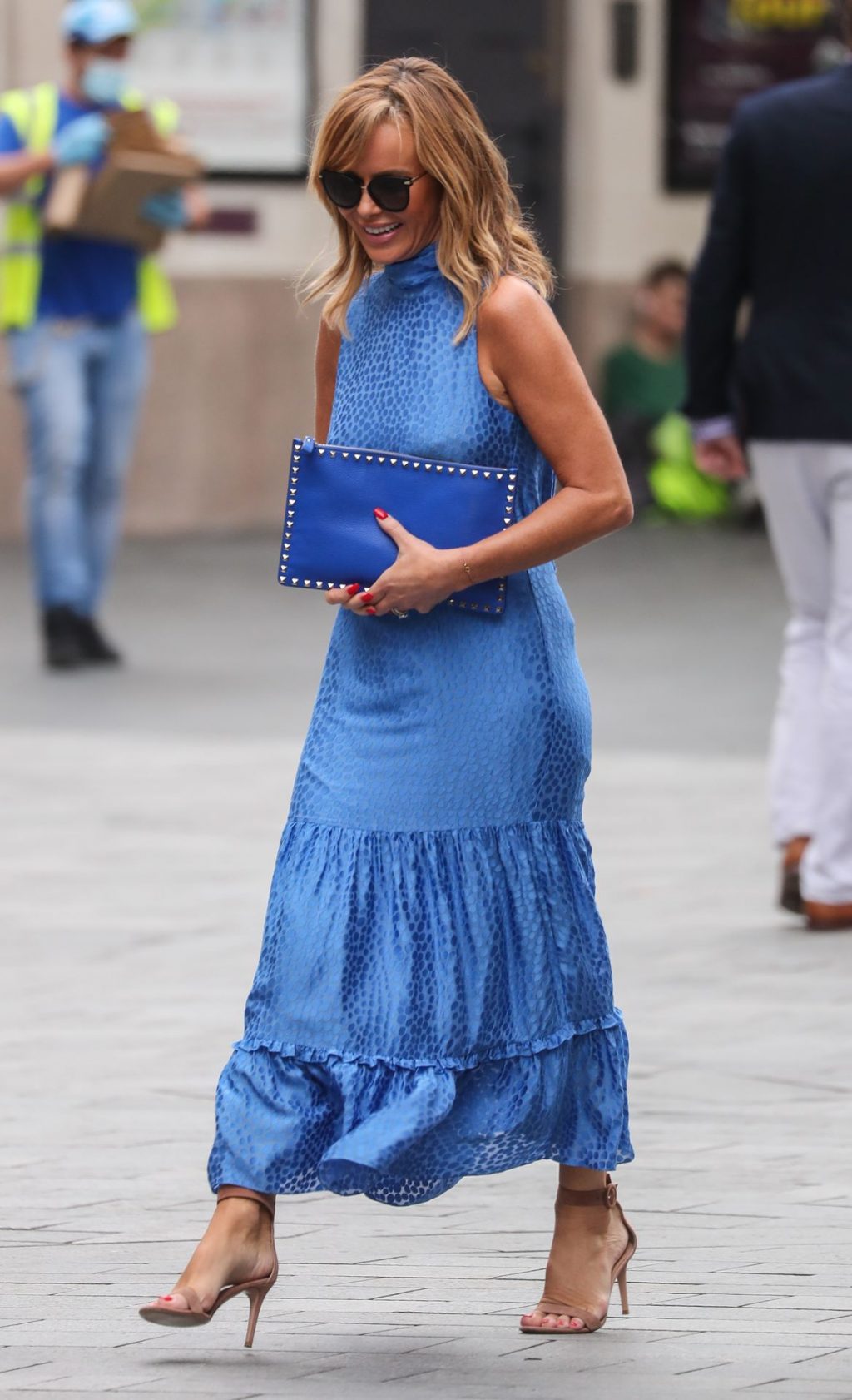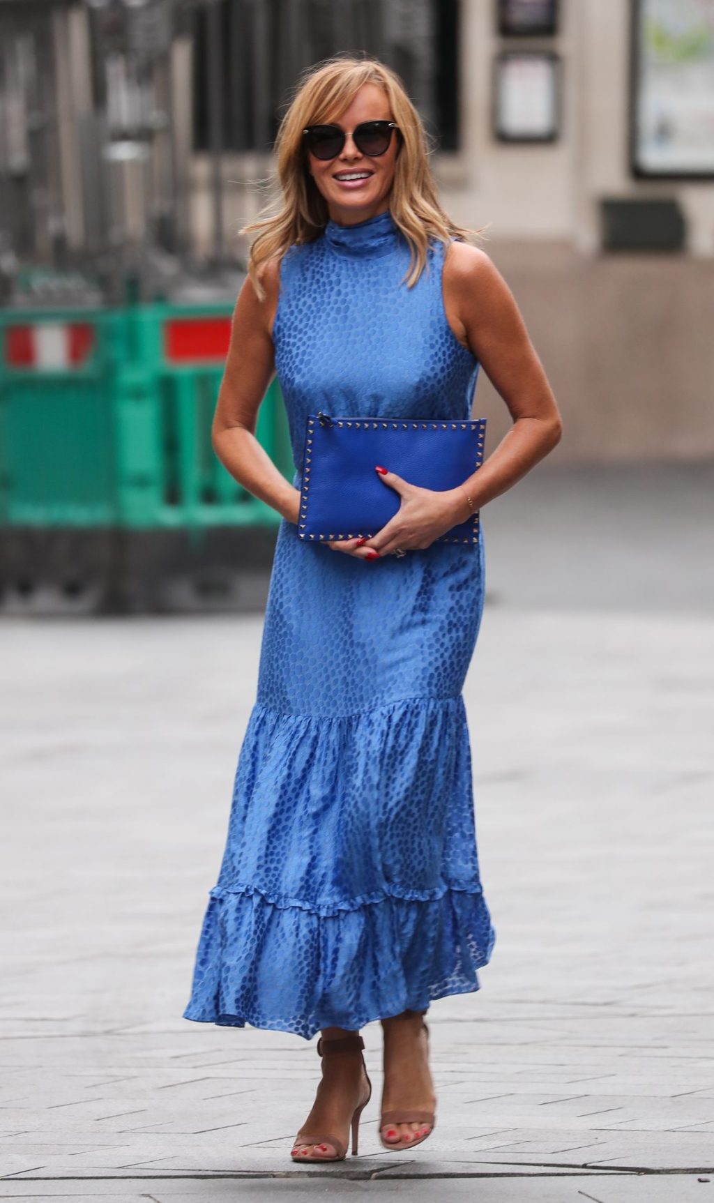 Британская телеведущая и радиоведущая Аманда Холден покидает шоу Heart Breakfast в Лондоне, 16.07.2020, в синем платье без рукавов.