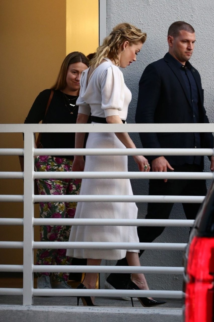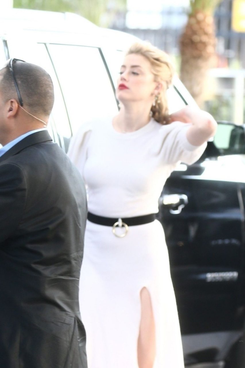 Длинноногая Эмбер Херд демонстрирует белое платье с высоким разрезом, стилизованное Карлой Уэлч, покидая интервью в штаб-квартире Univision в Майами, 14.12.2018. Эмбер выглядит великолепно в классическом платье, направляясь к своей машине после выхода из здания вместе с командой.
