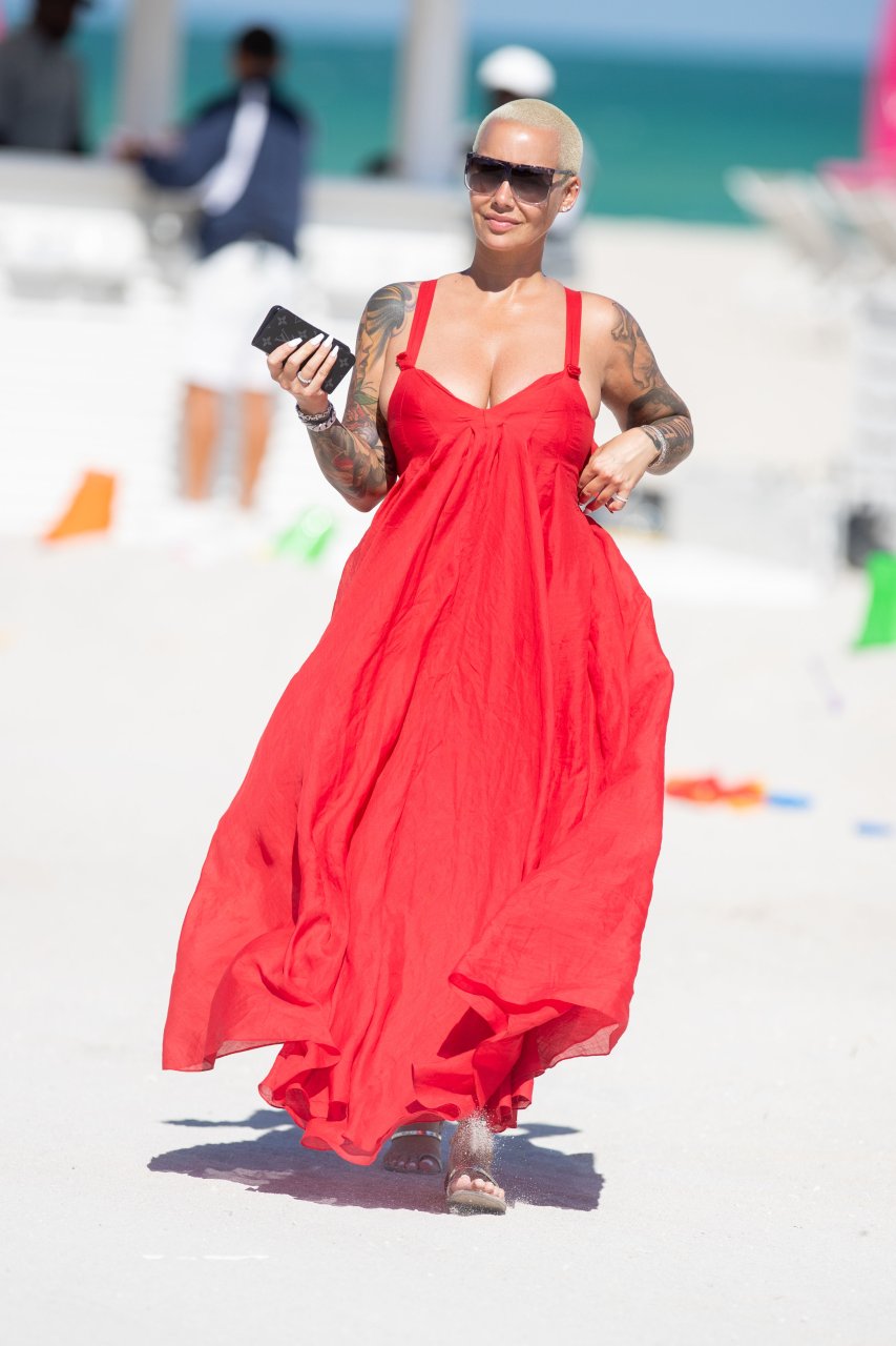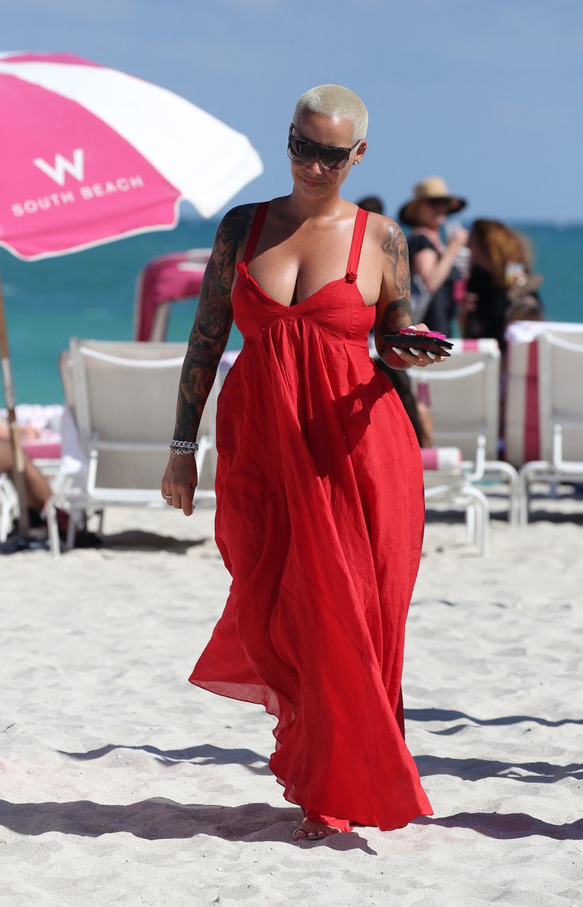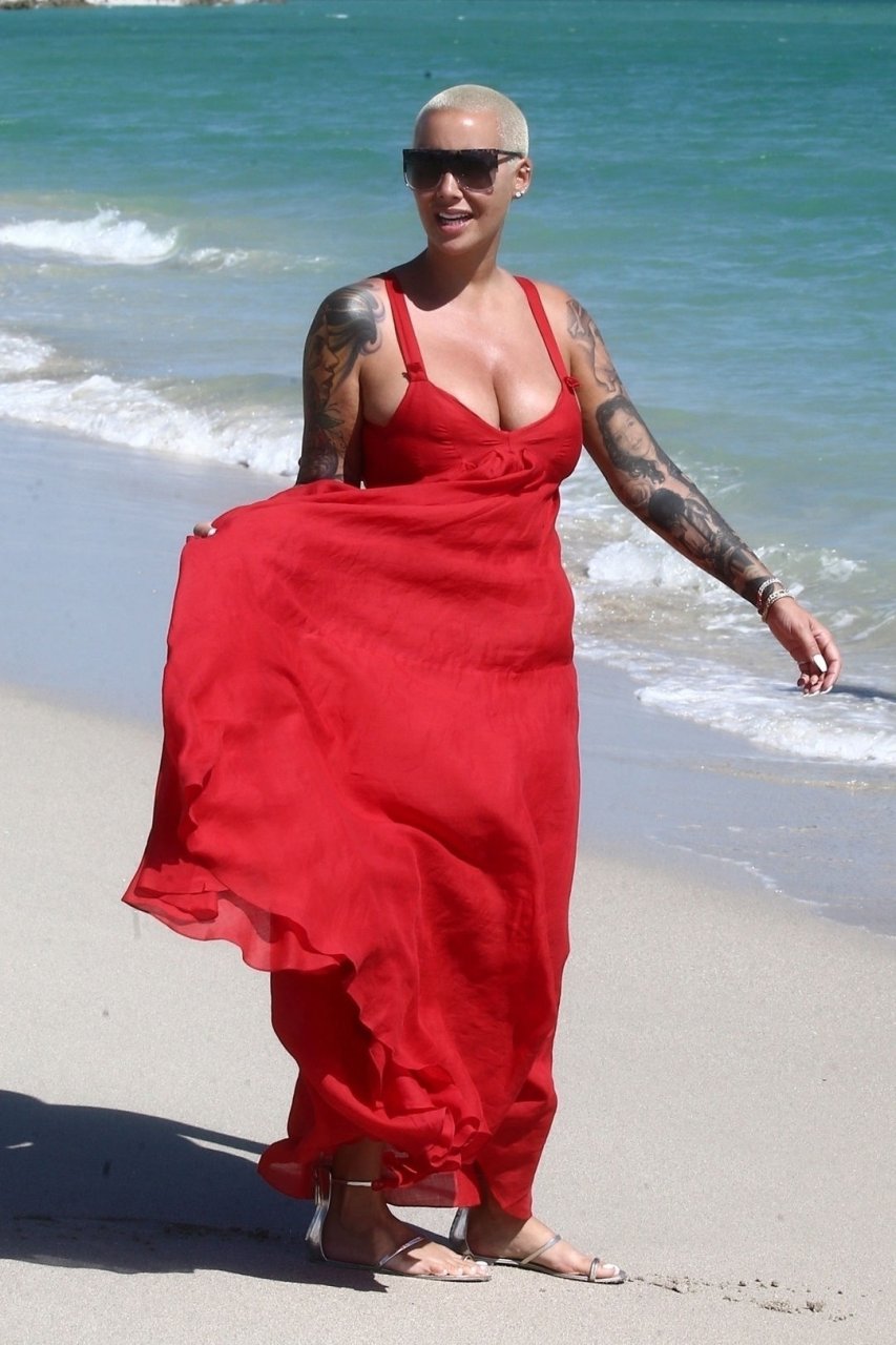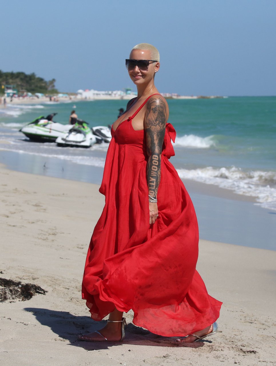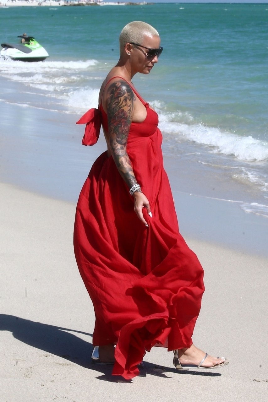 Татуированная американская актриса и модель Amber Rose отдыхает на пляже в красном платье, а затем переодевается в черный купальник в Майами, 29.10.2018.