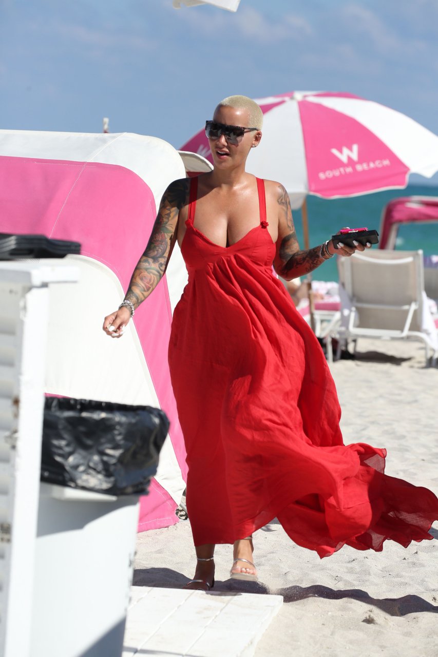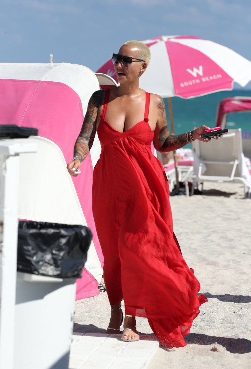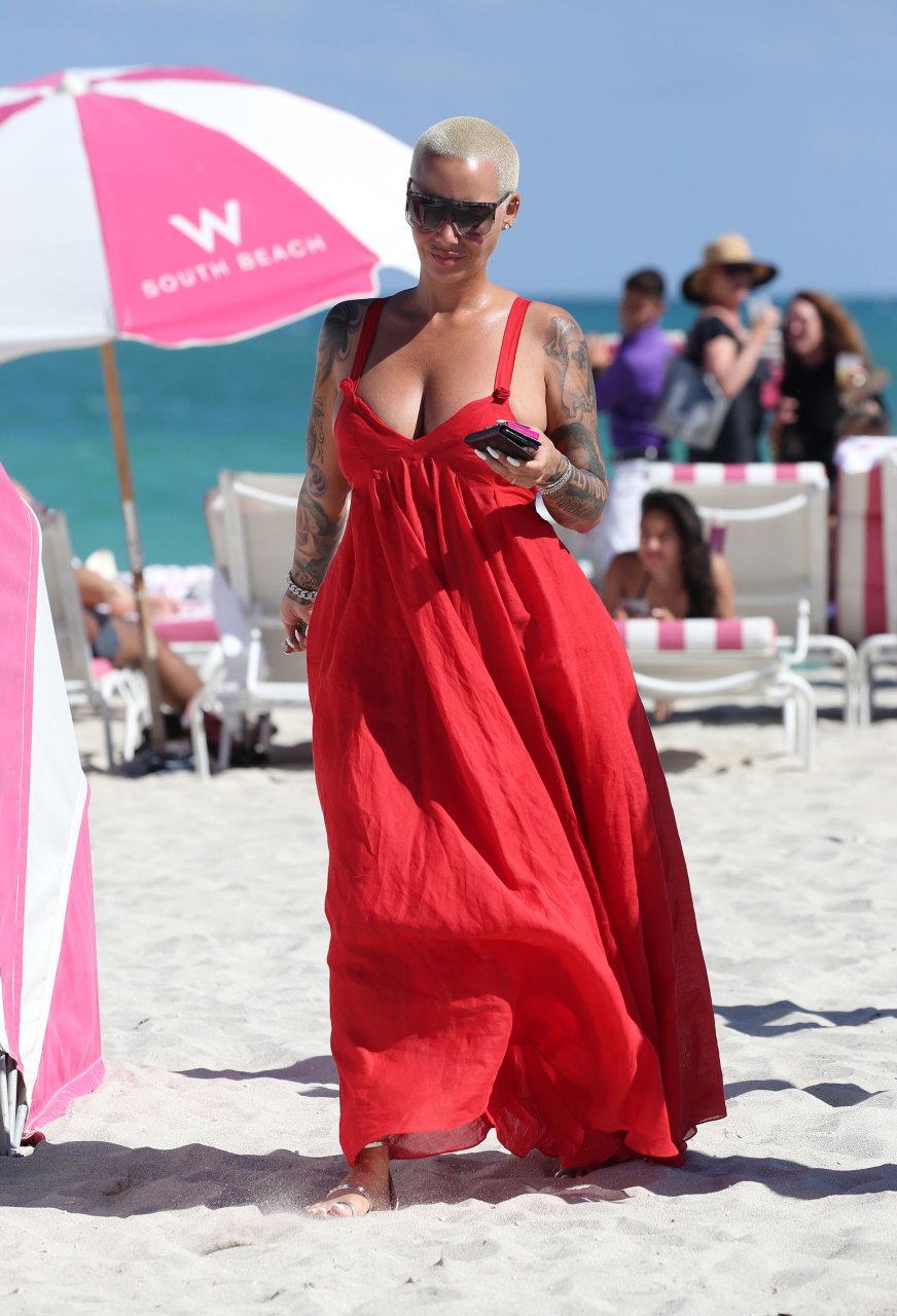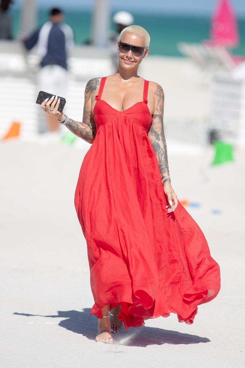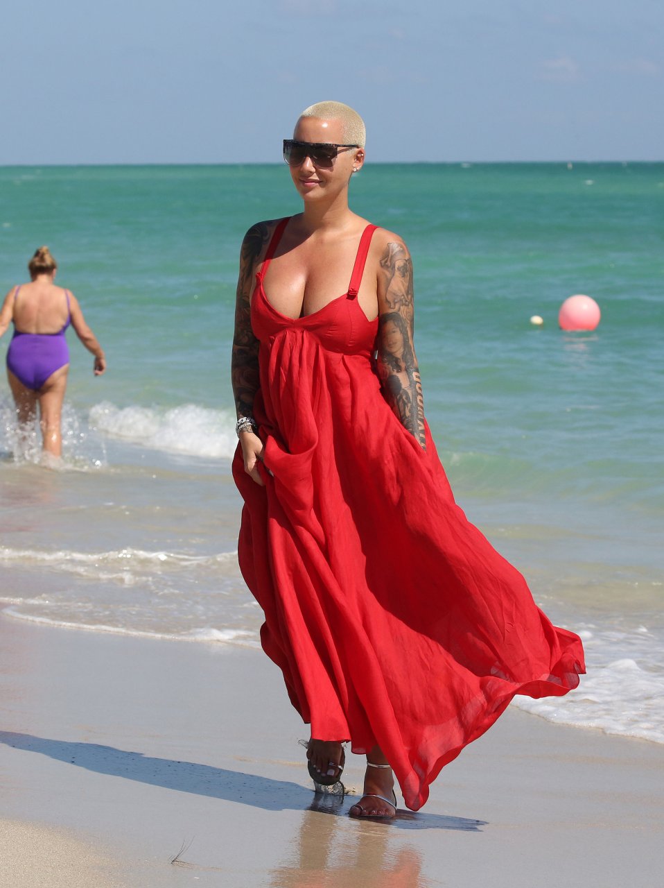 Татуированная американская актриса и модель Amber Rose отдыхает на пляже в красном платье, а затем переодевается в черный купальник в Майами, 29.10.2018.