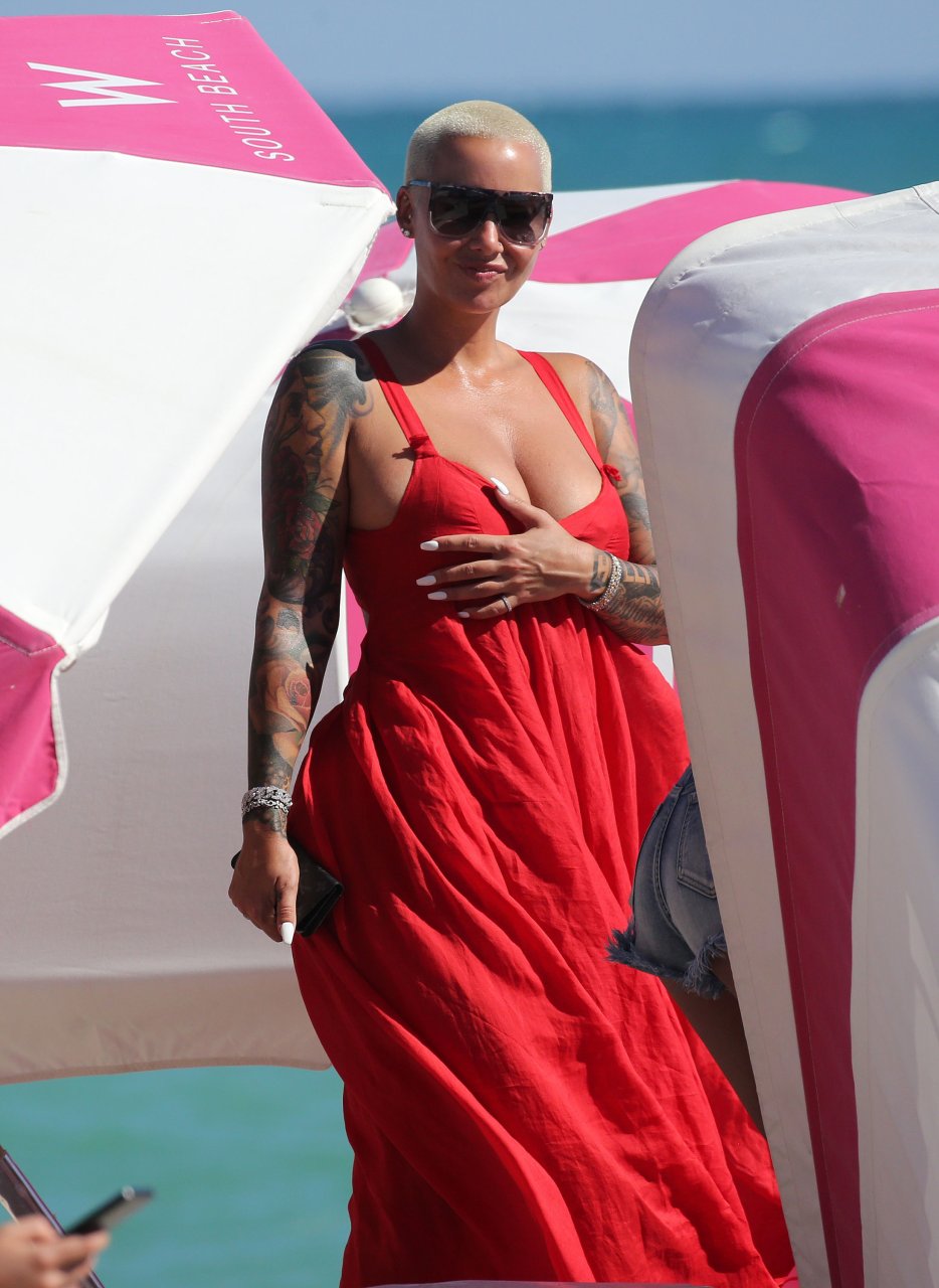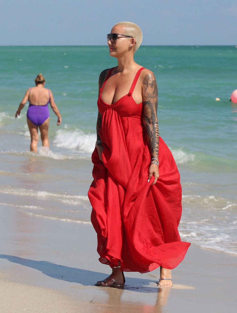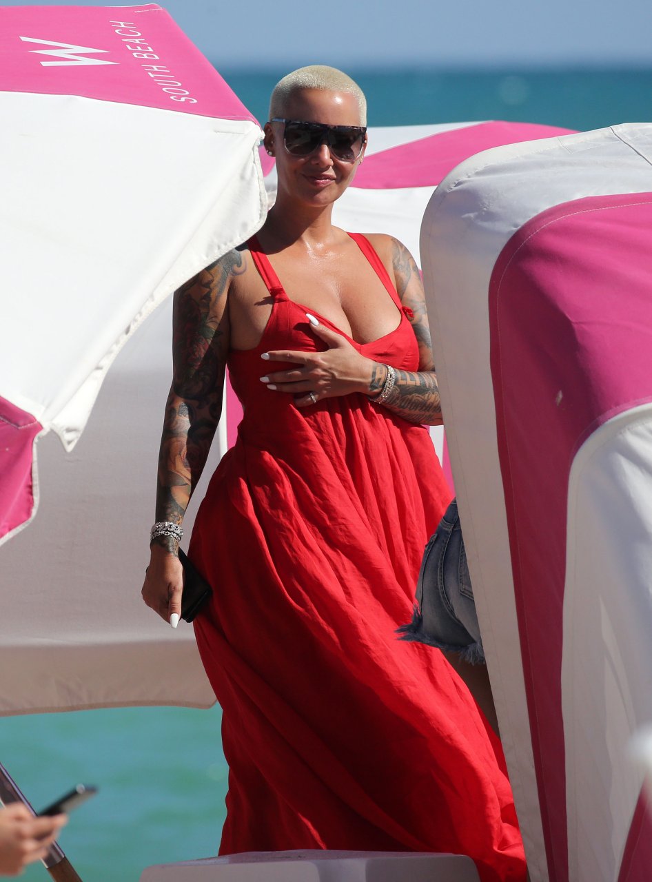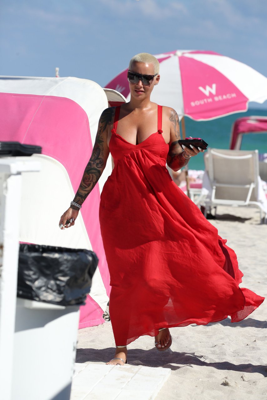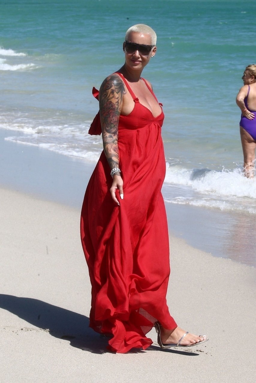 Татуированная американская актриса и модель Amber Rose отдыхает на пляже в красном платье, а затем переодевается в черный купальник в Майами, 29.10.2018.