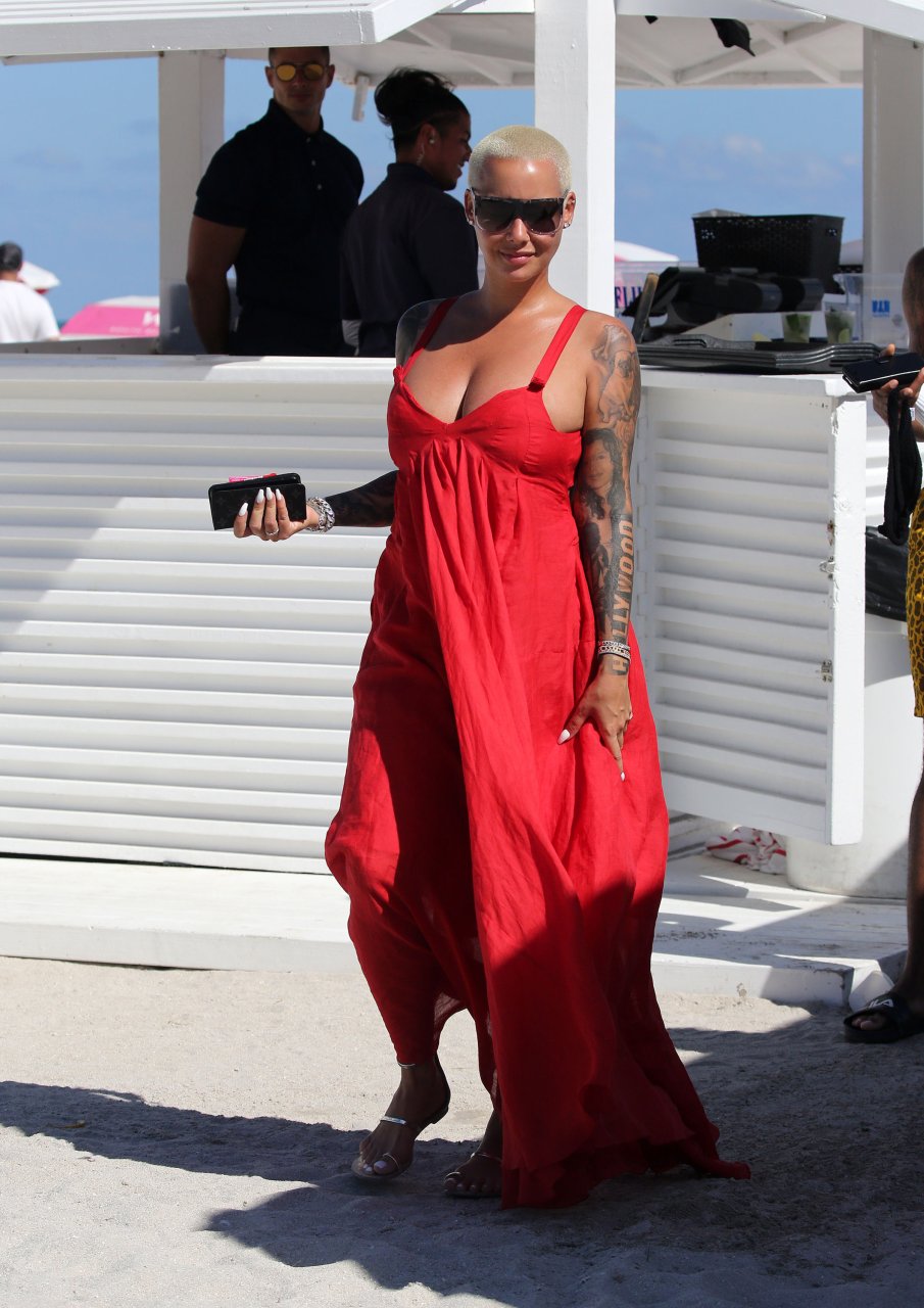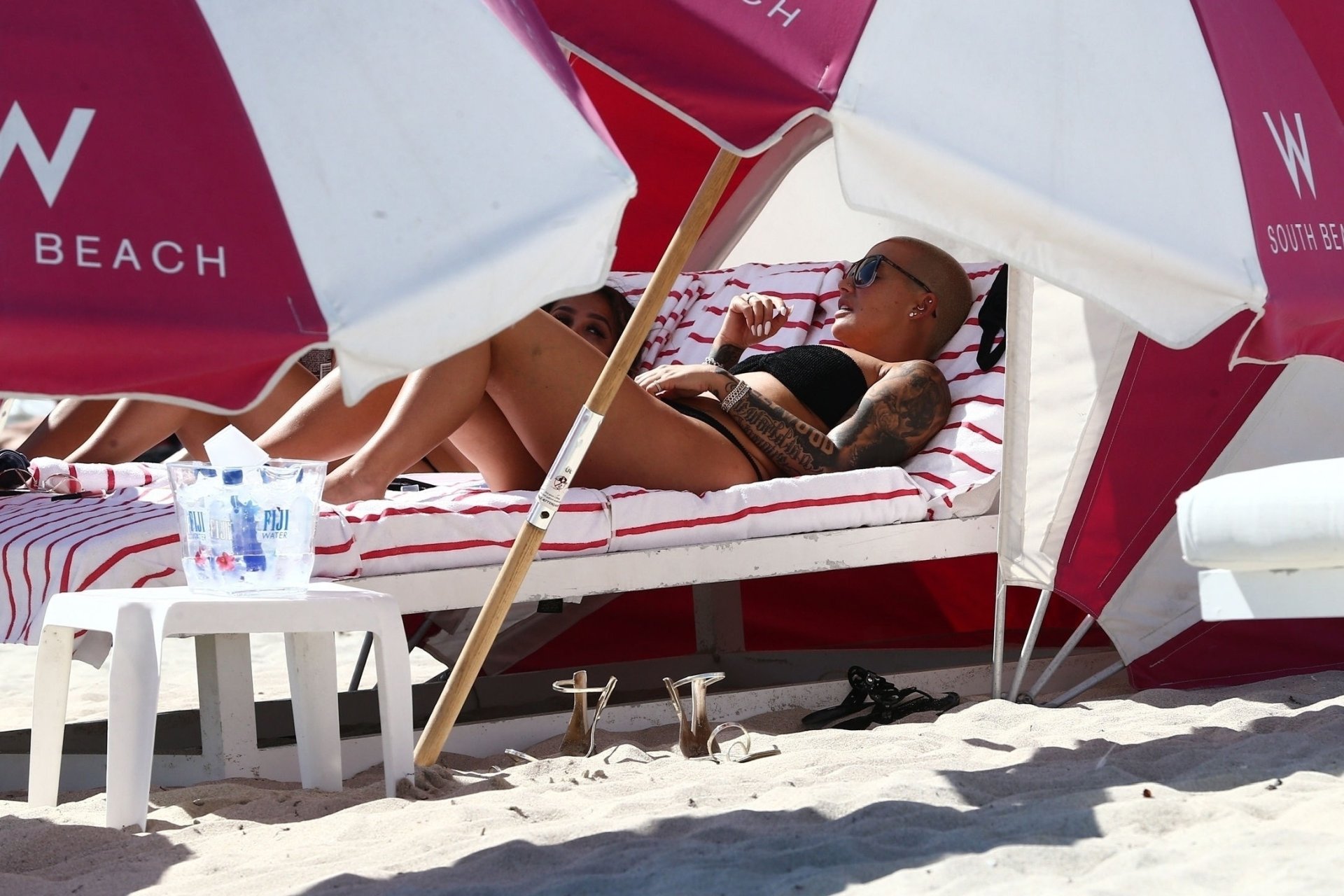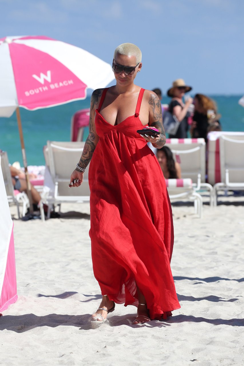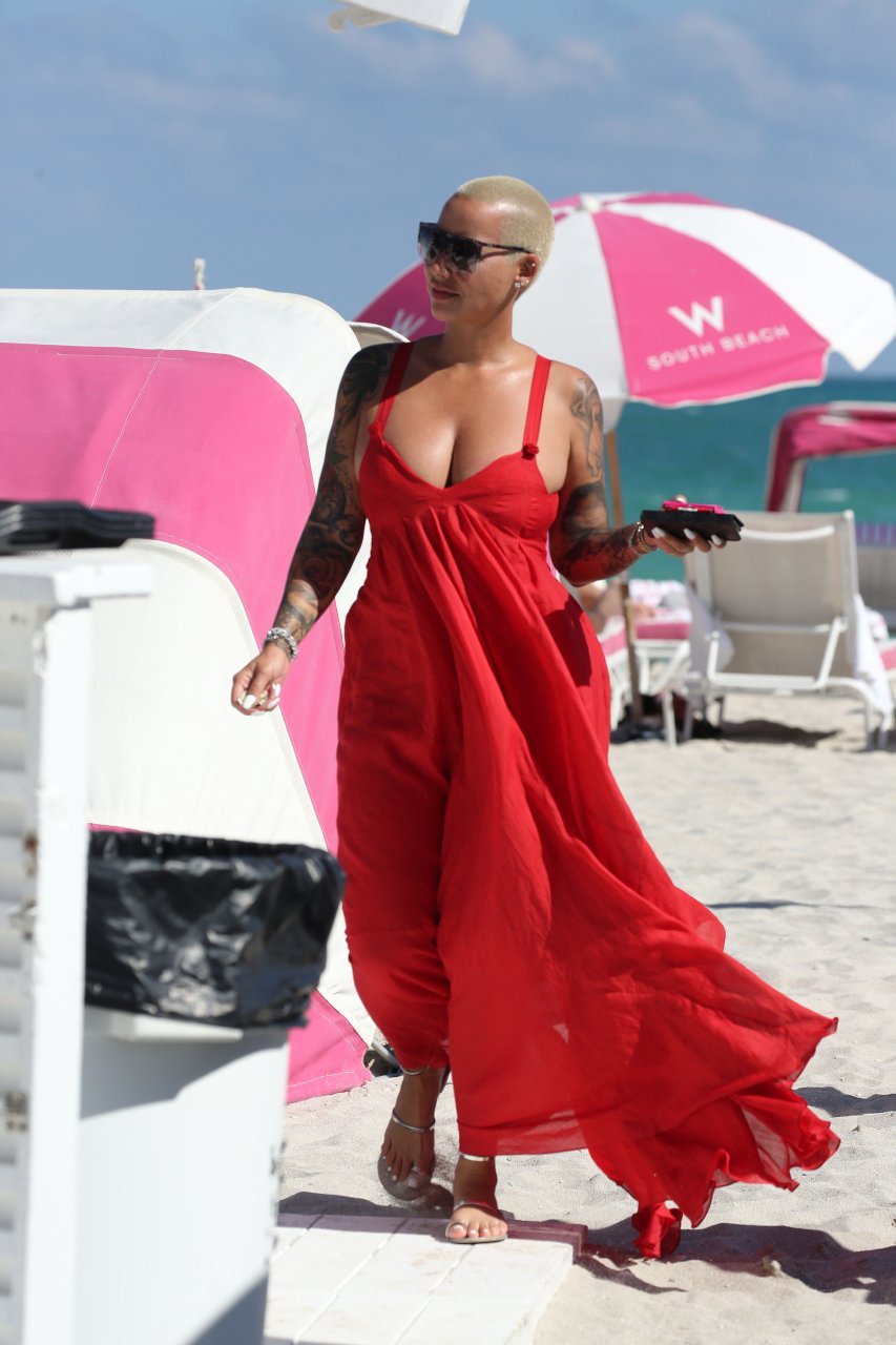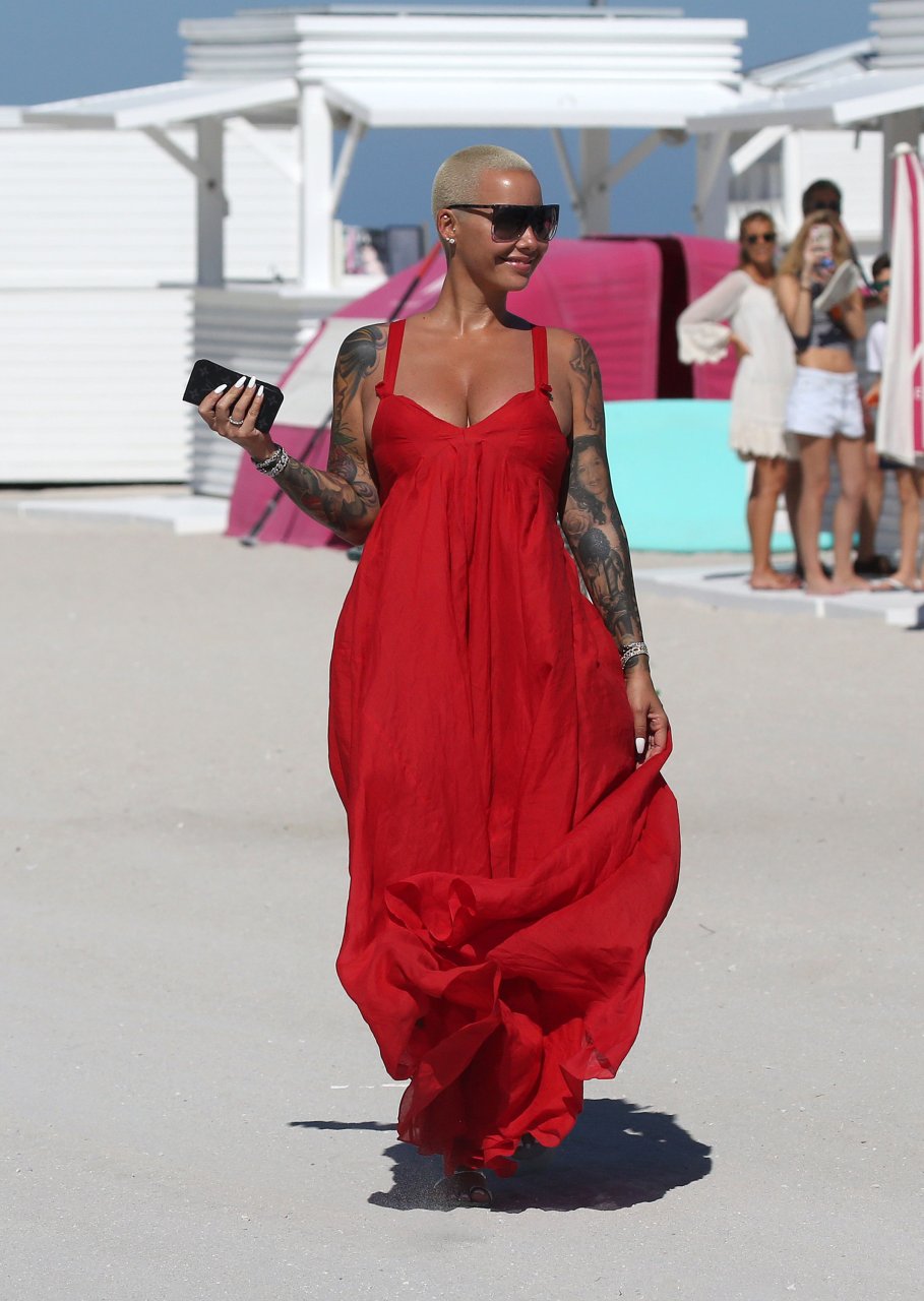 Татуированная американская актриса и модель Amber Rose отдыхает на пляже в красном платье, а затем переодевается в черный купальник в Майами, 29.10.2018.