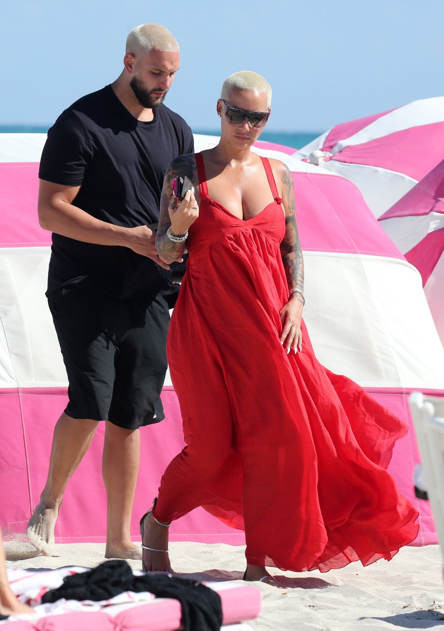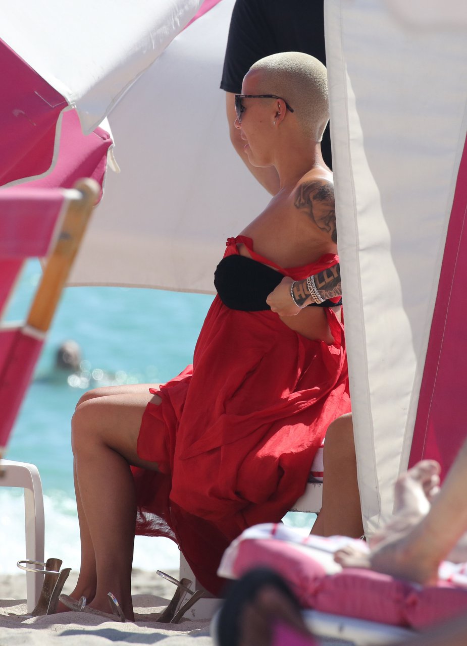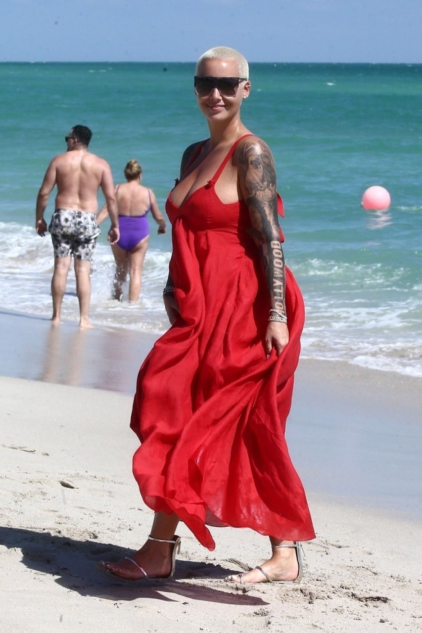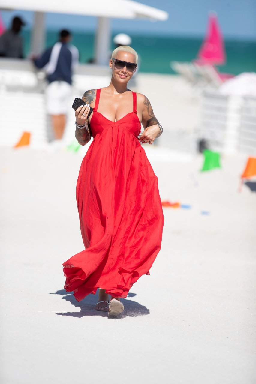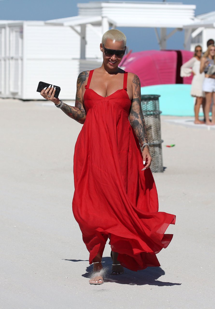 Татуированная американская актриса и модель Amber Rose отдыхает на пляже в красном платье, а затем переодевается в черный купальник в Майами, 29.10.2018.