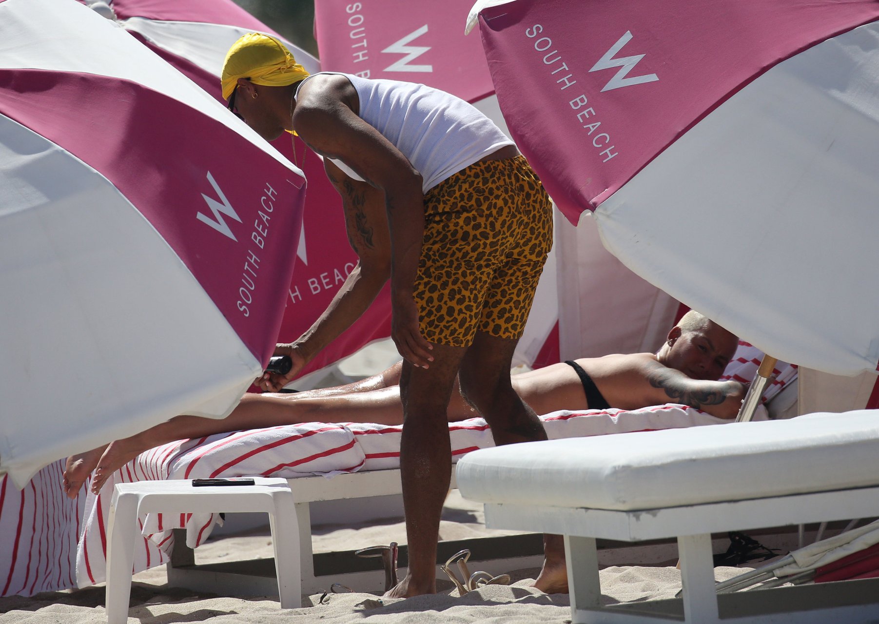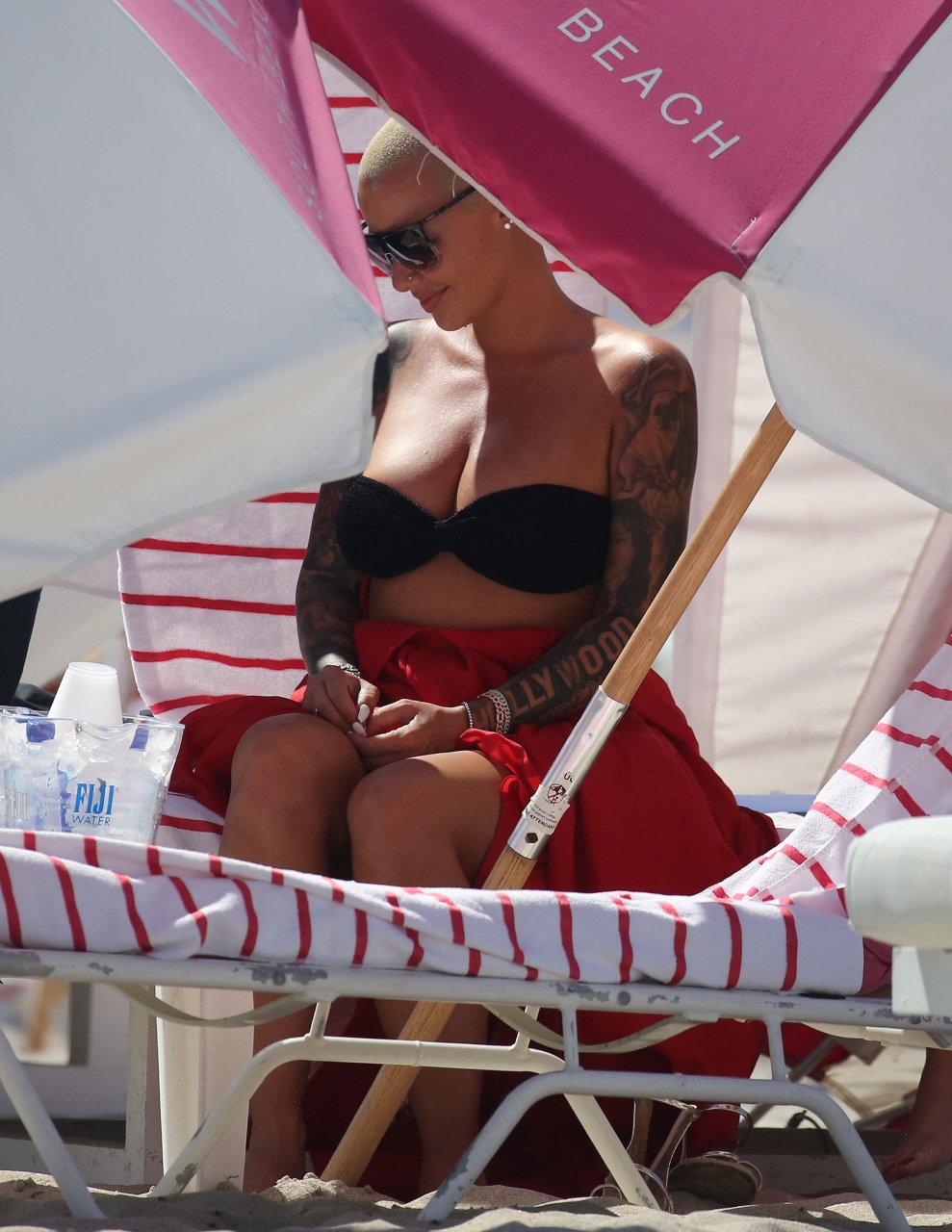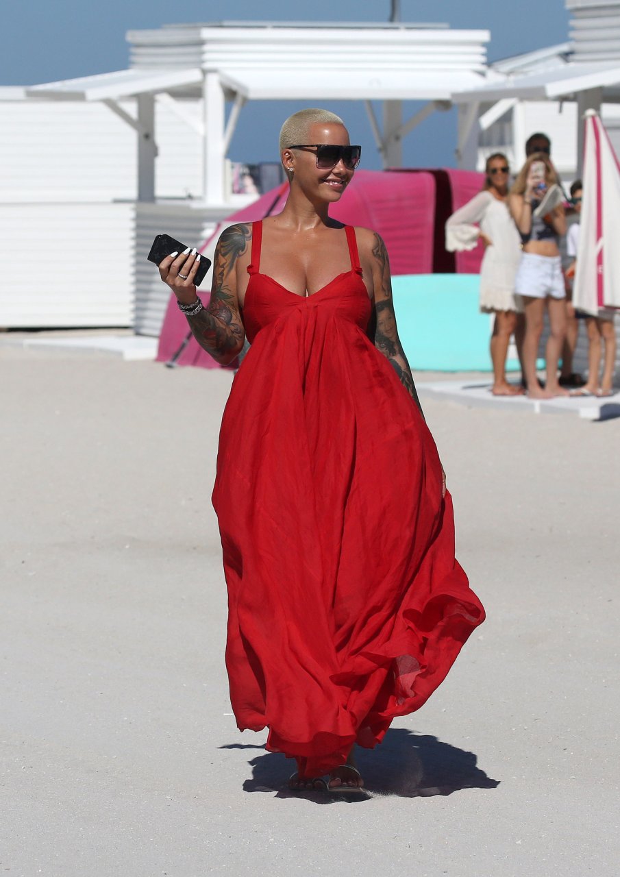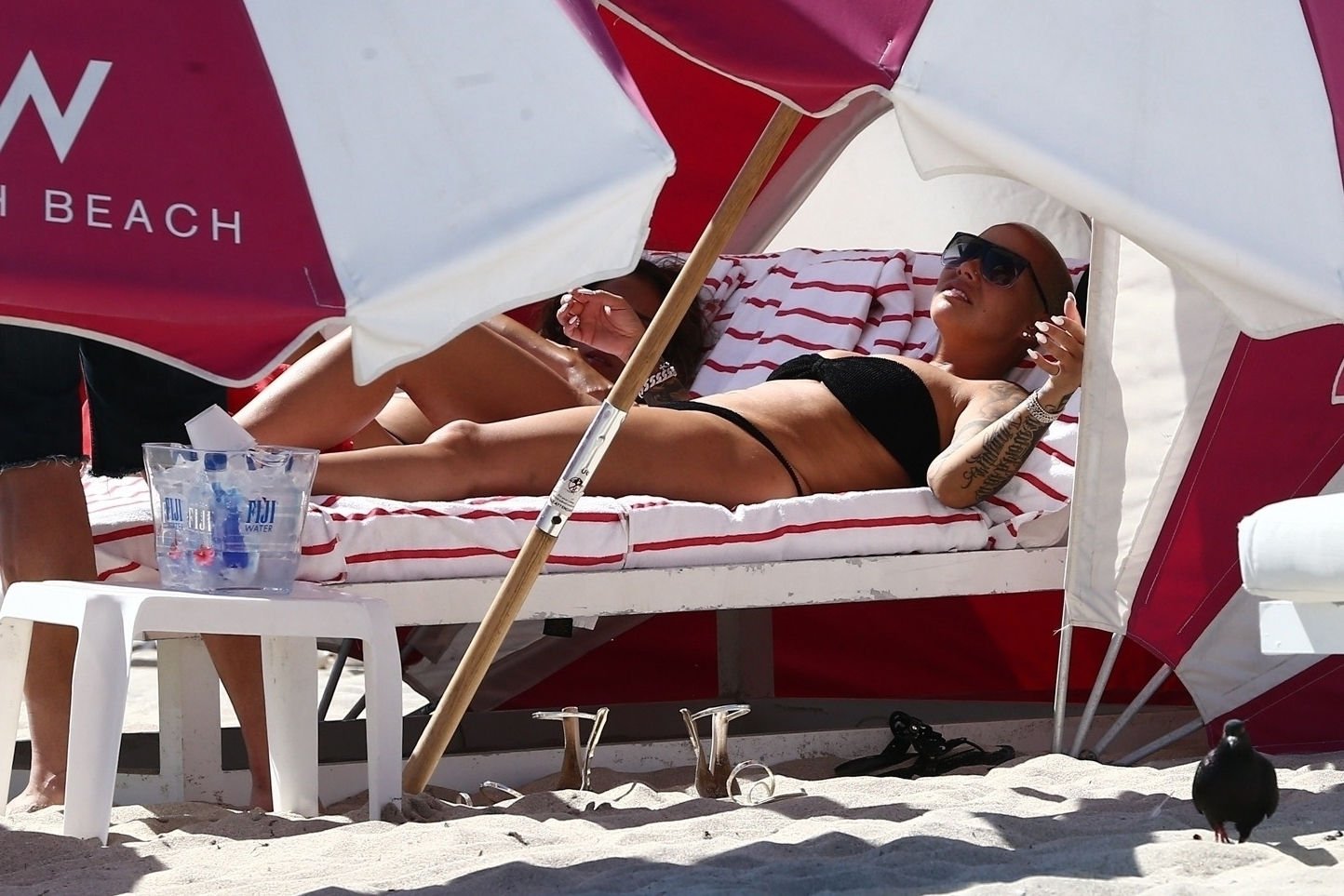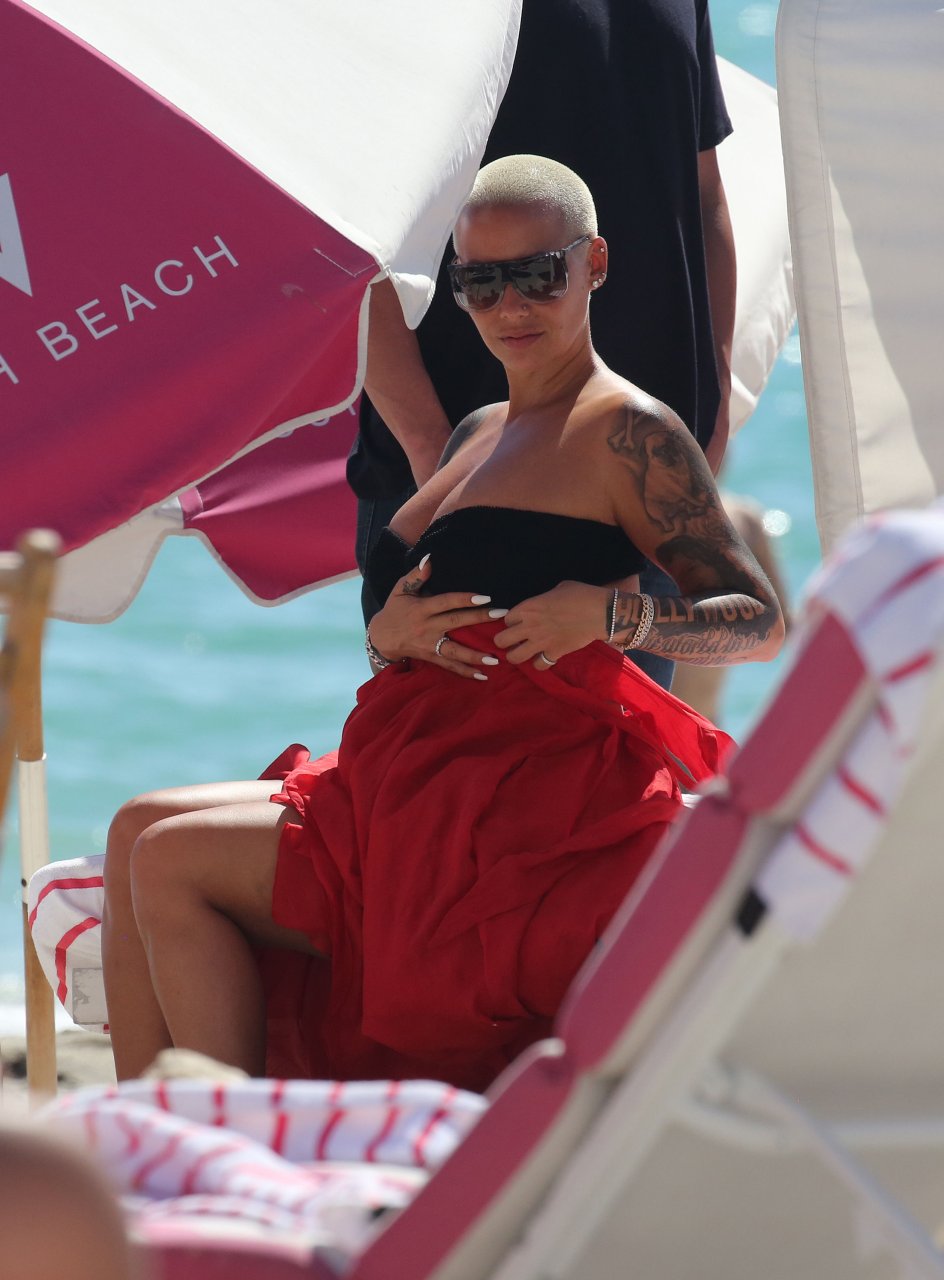 Татуированная американская актриса и модель Amber Rose отдыхает на пляже в красном платье, а затем переодевается в черный купальник в Майами, 29.10.2018.