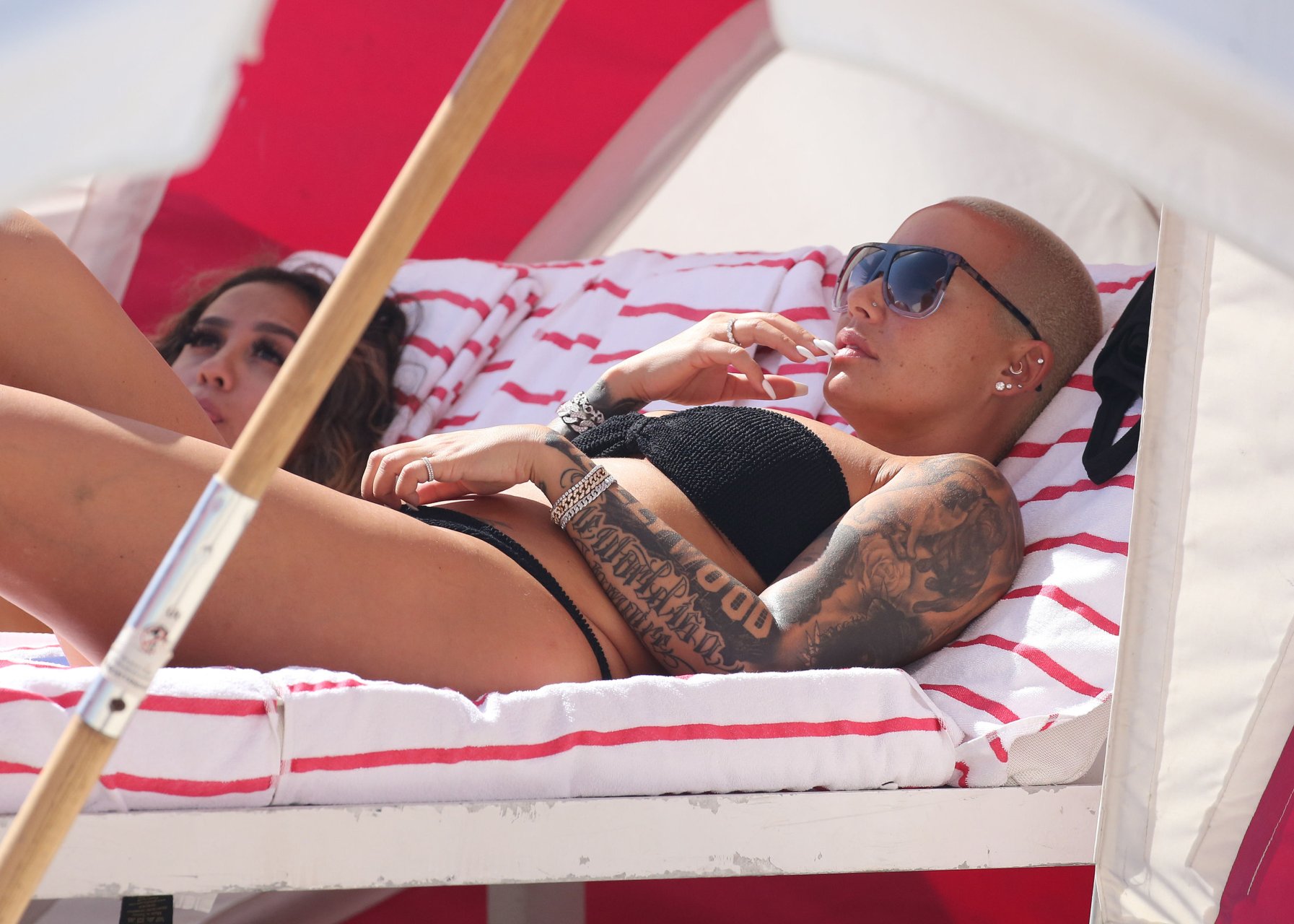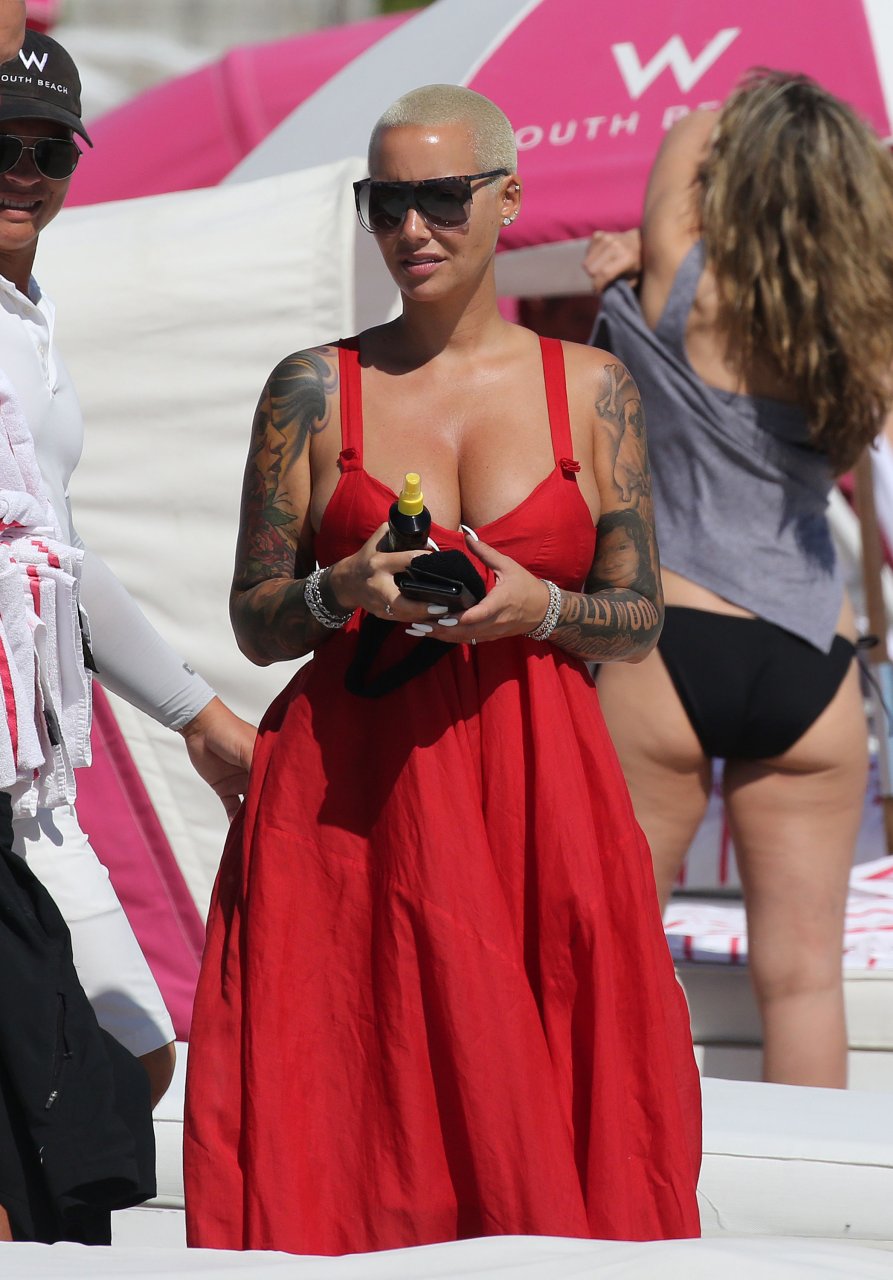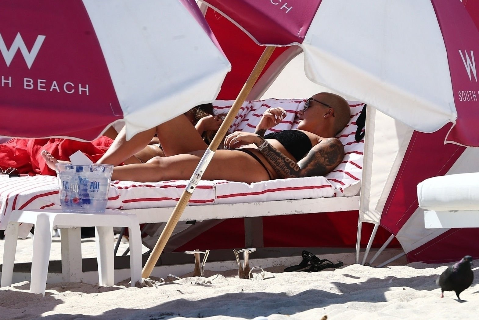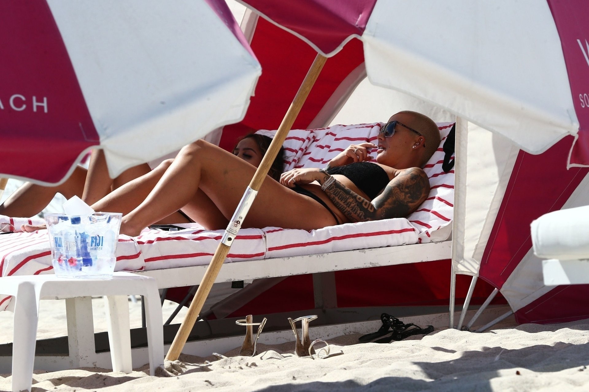 Татуированная американская актриса и модель Amber Rose отдыхает на пляже в красном платье, а затем переодевается в черный купальник в Майами, 29.10.2018.