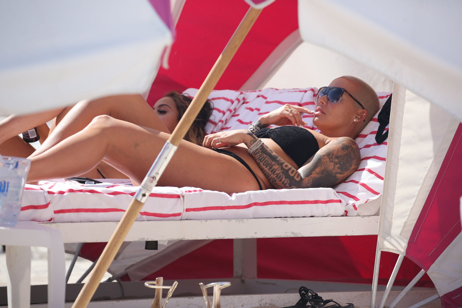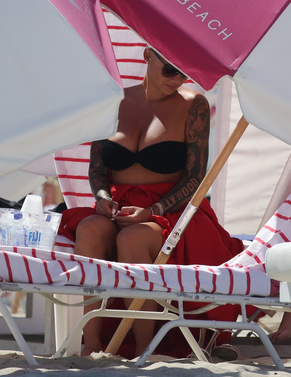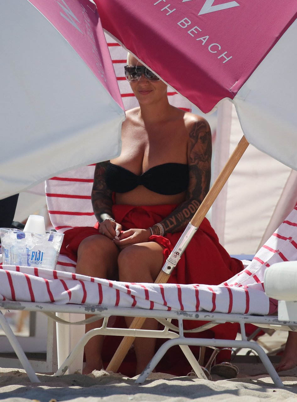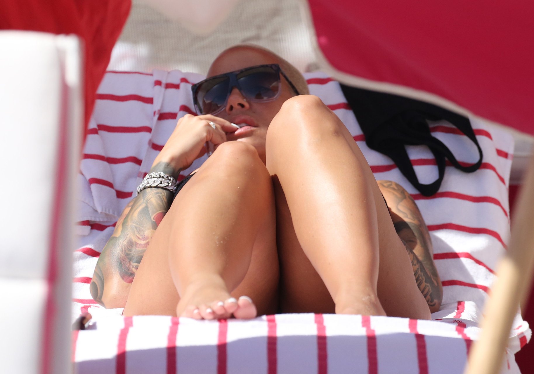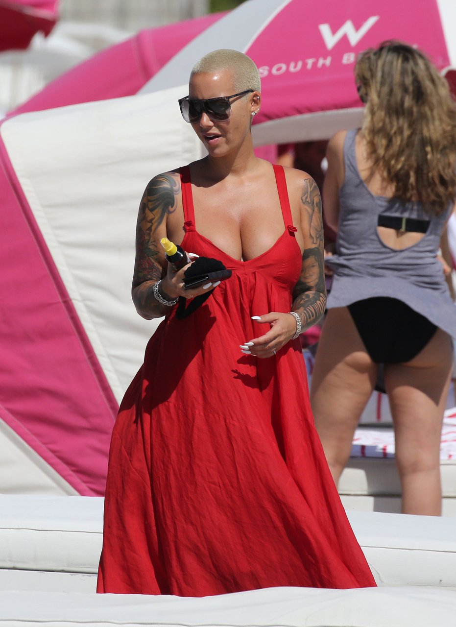 Татуированная американская актриса и модель Amber Rose отдыхает на пляже в красном платье, а затем переодевается в черный купальник в Майами, 29.10.2018.