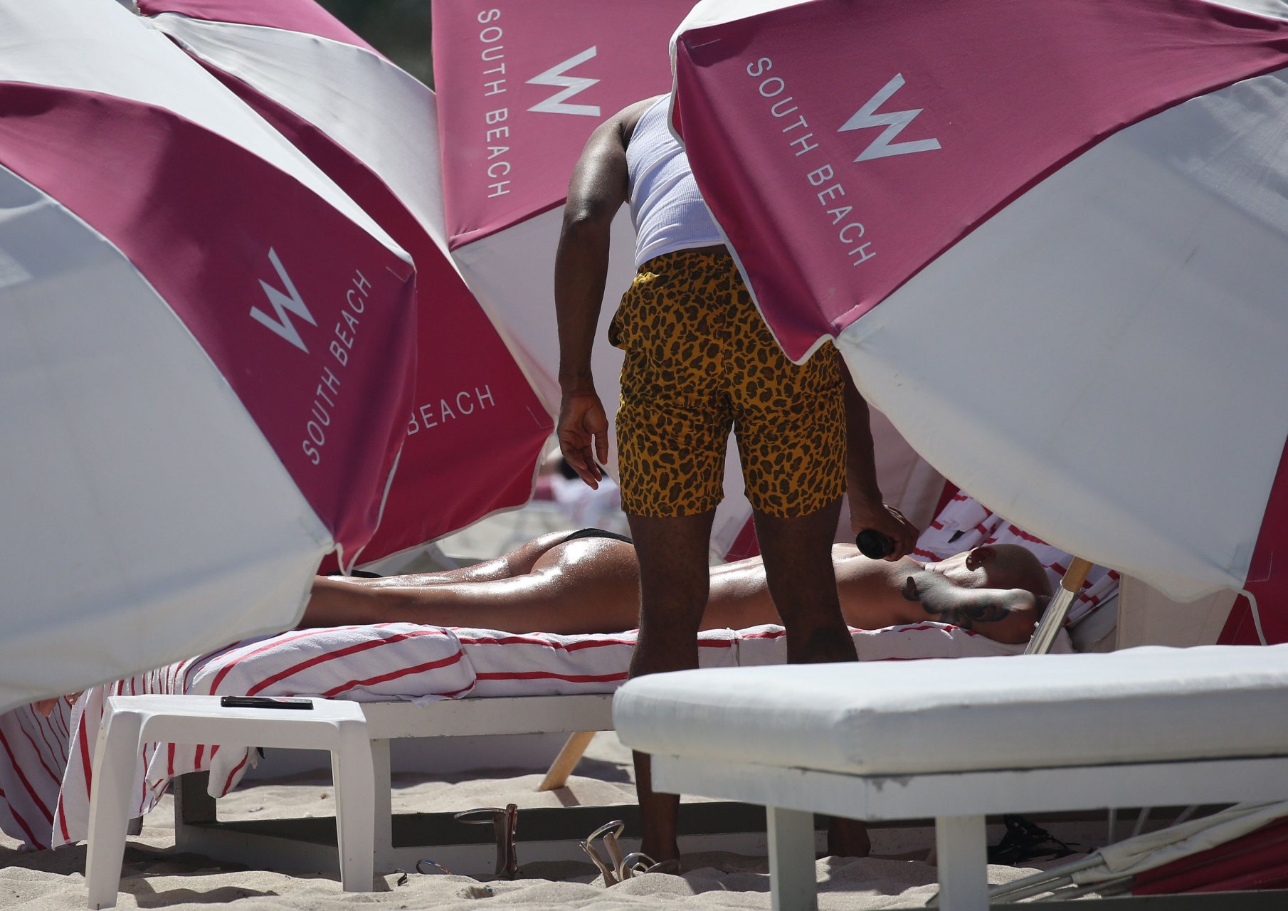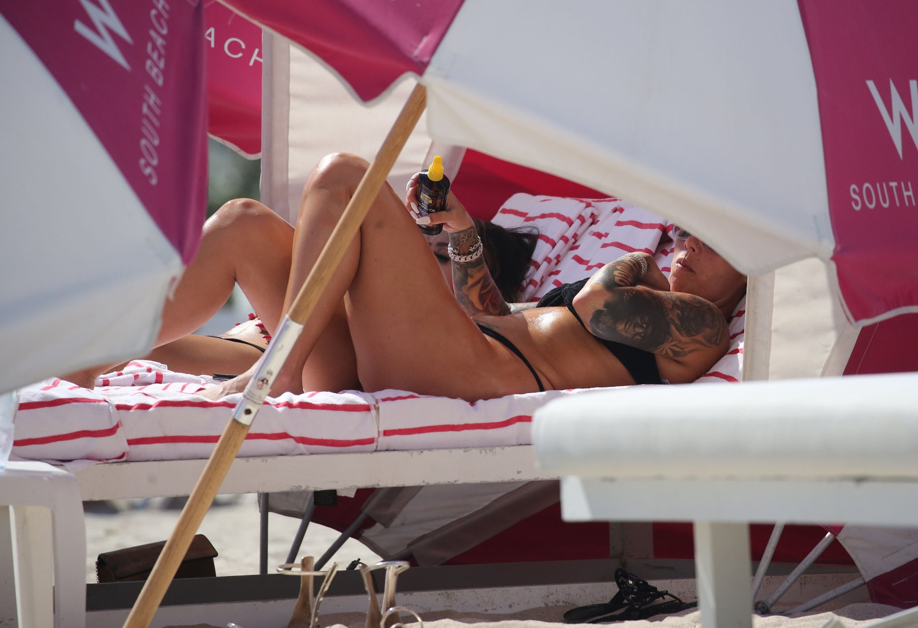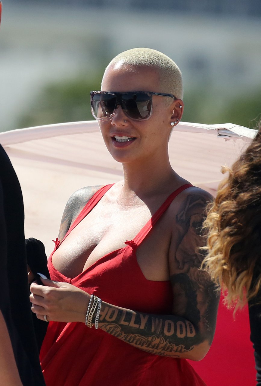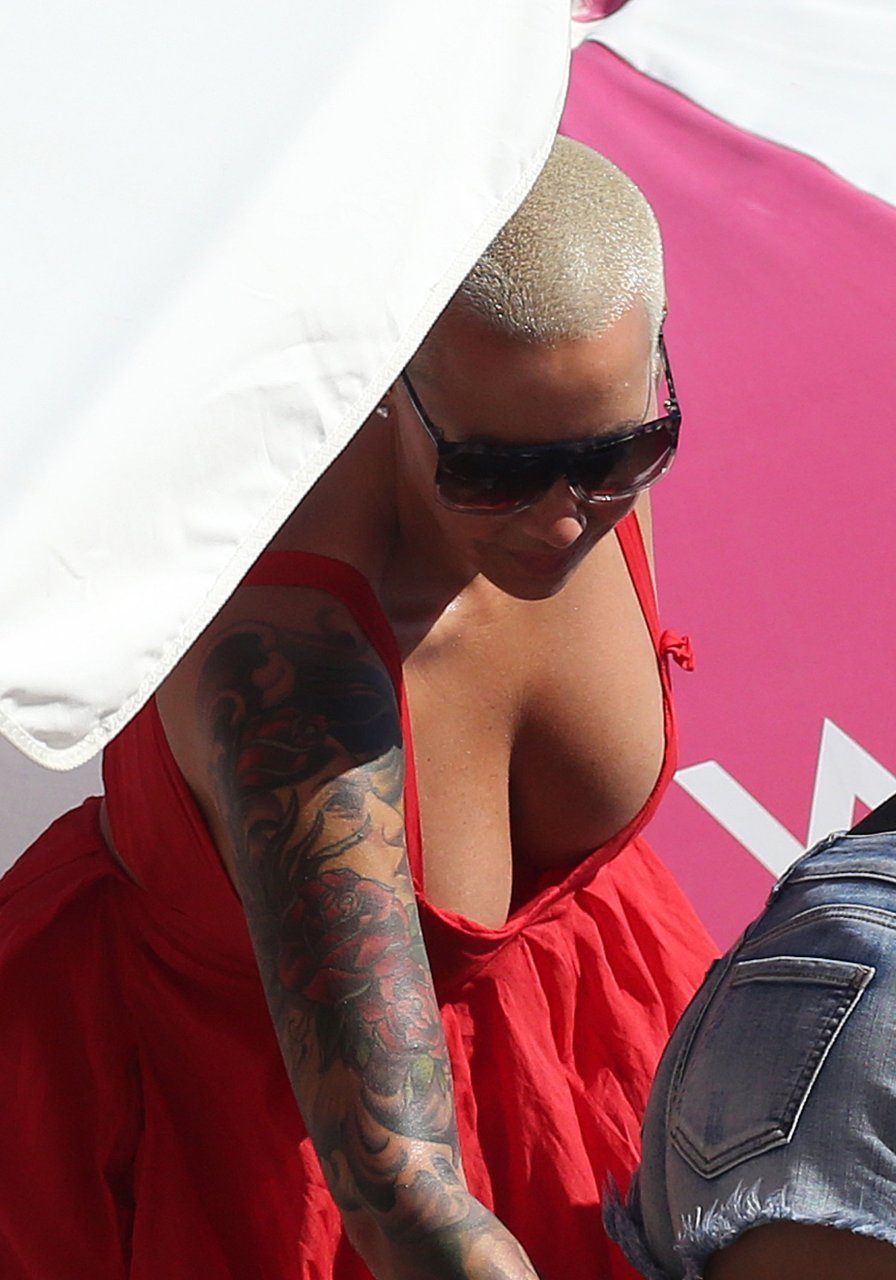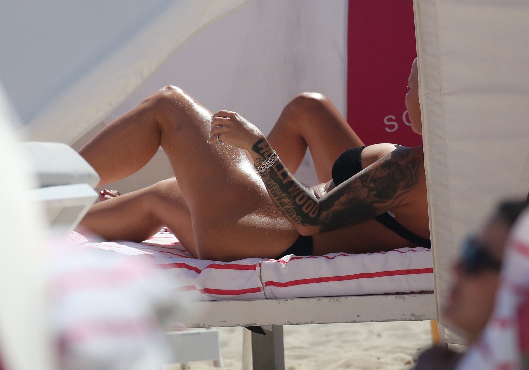 Татуированная американская актриса и модель Amber Rose отдыхает на пляже в красном платье, а затем переодевается в черный купальник в Майами, 29.10.2018.
