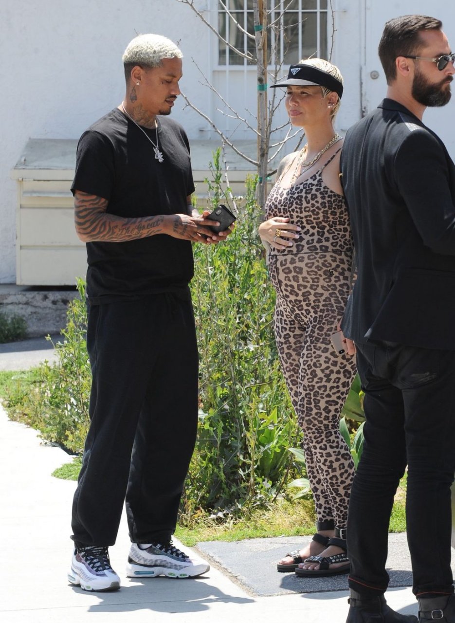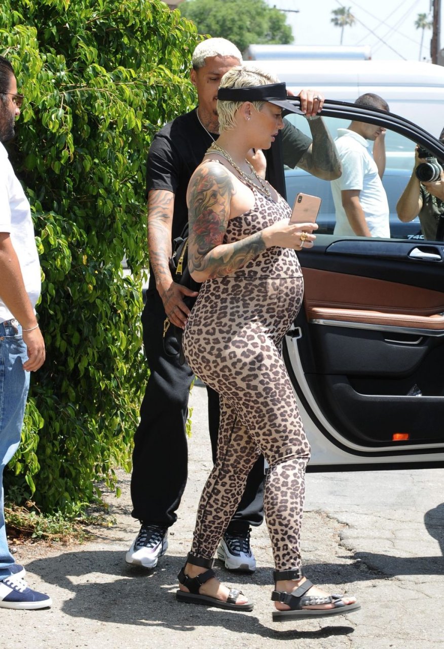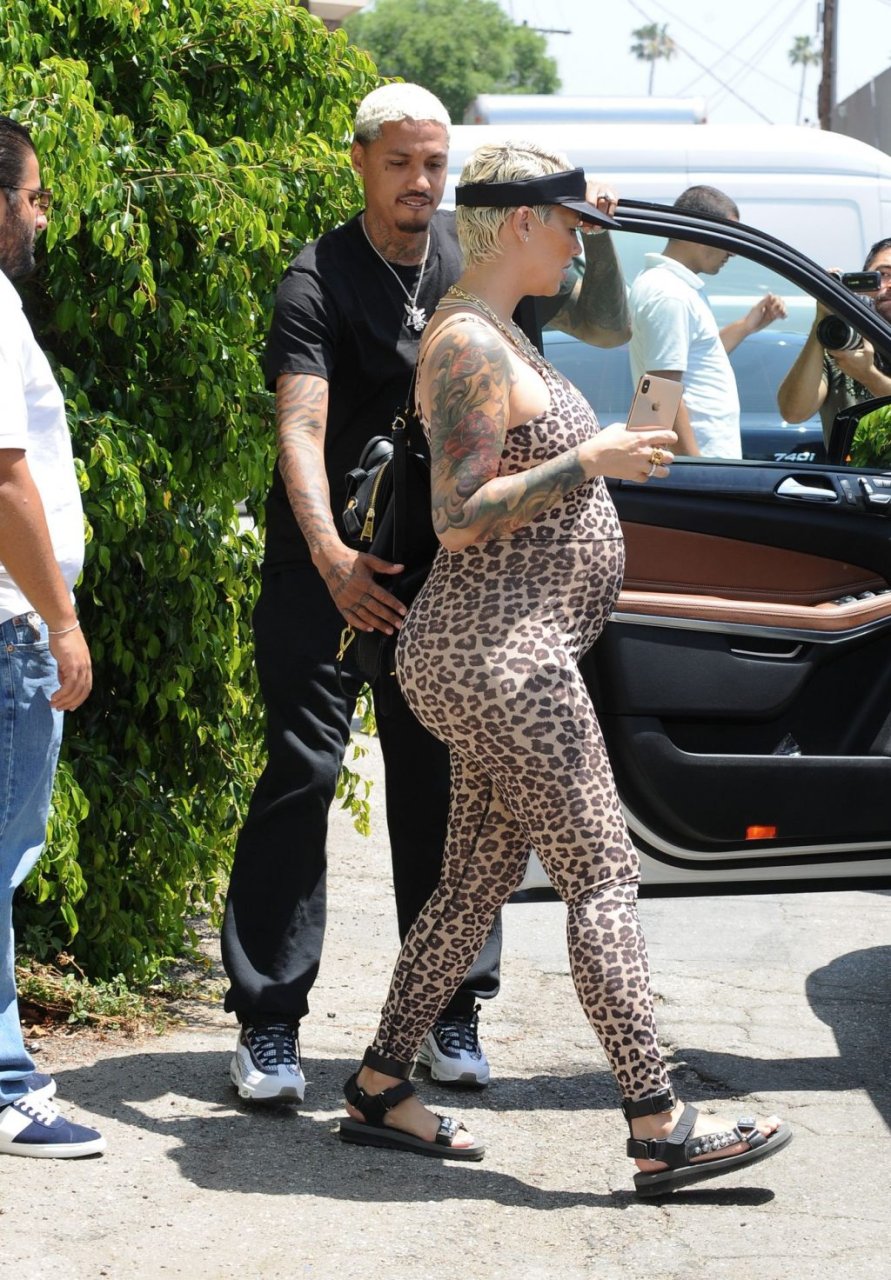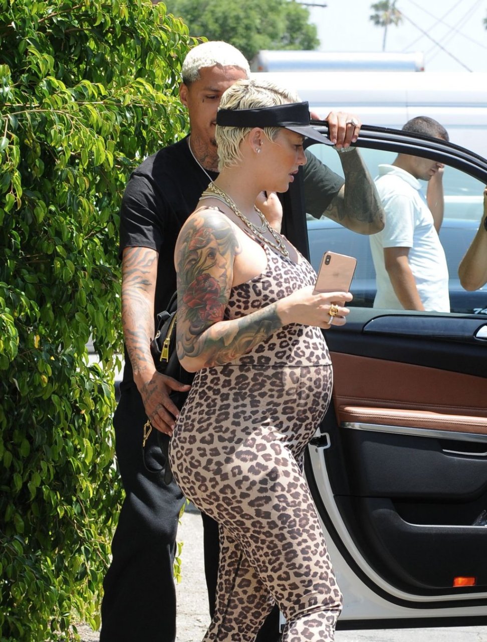 Эмбер Роуз демонстрирует растущий животик в леопардовых колготках во время деловой встречи с партнерами и бойфрендом Александром Эдвардсом в французском ресторане Petit Trois в Шерман-Оукс, 03.05.2019. Новый возлюбленный Эмбер Александр не мог оторвать от нее рук, пока они ждали свою машину у парковщика.