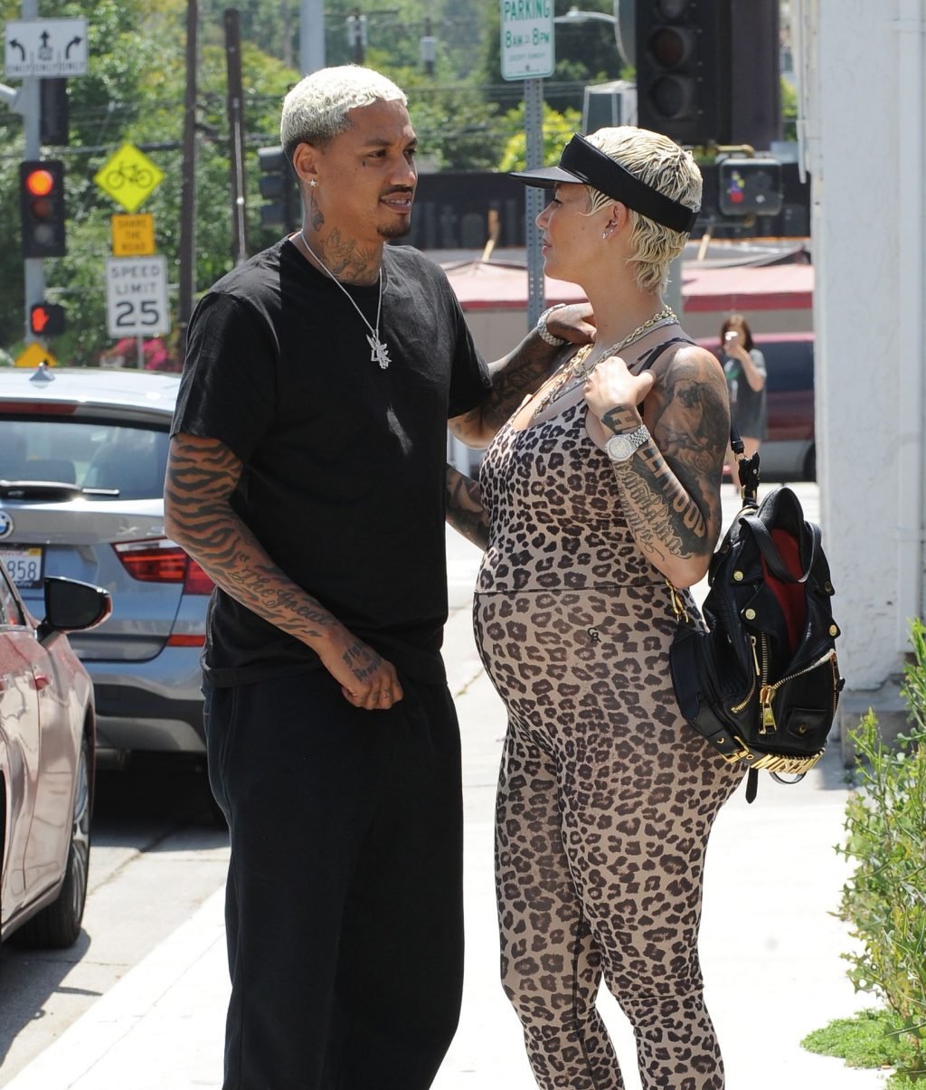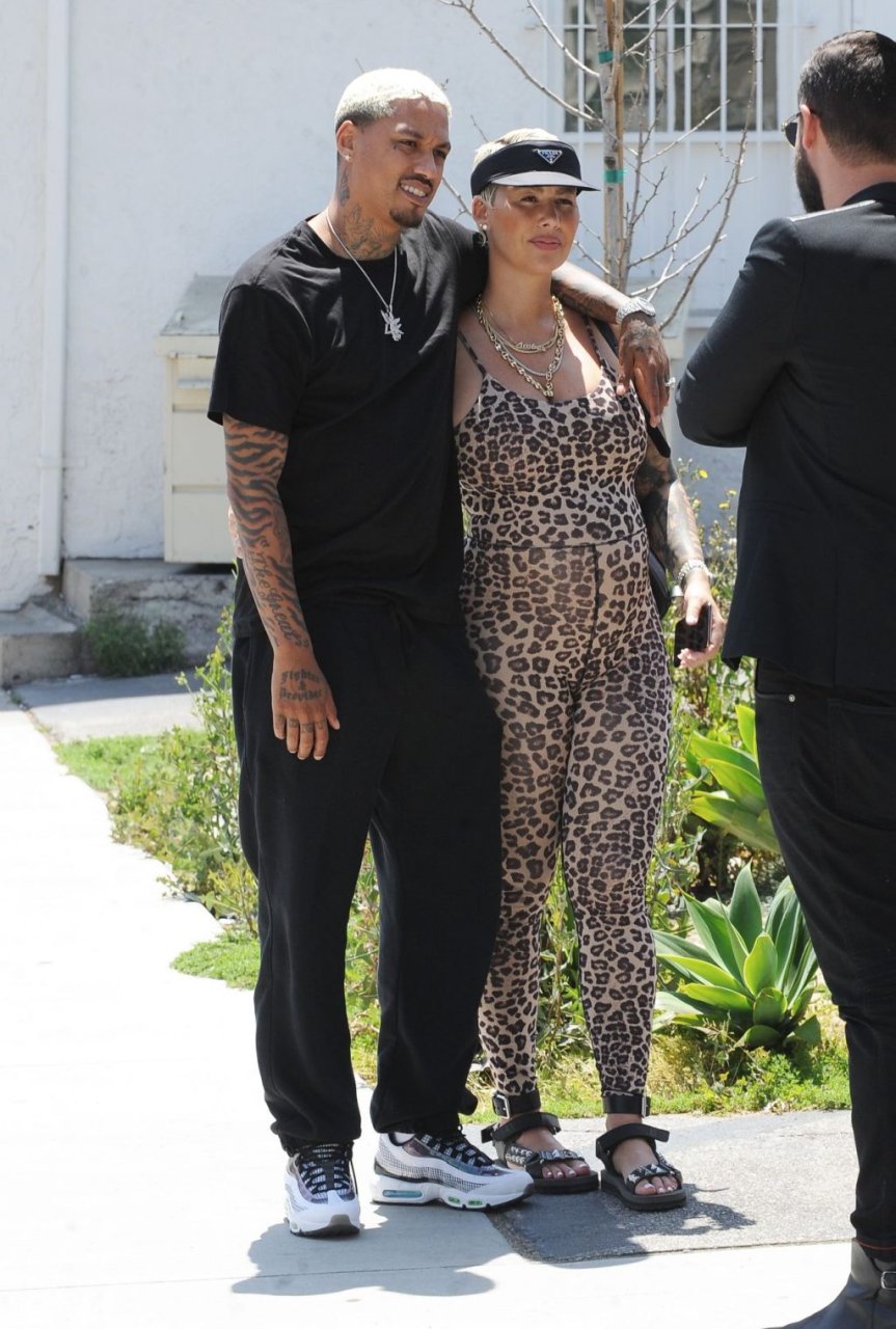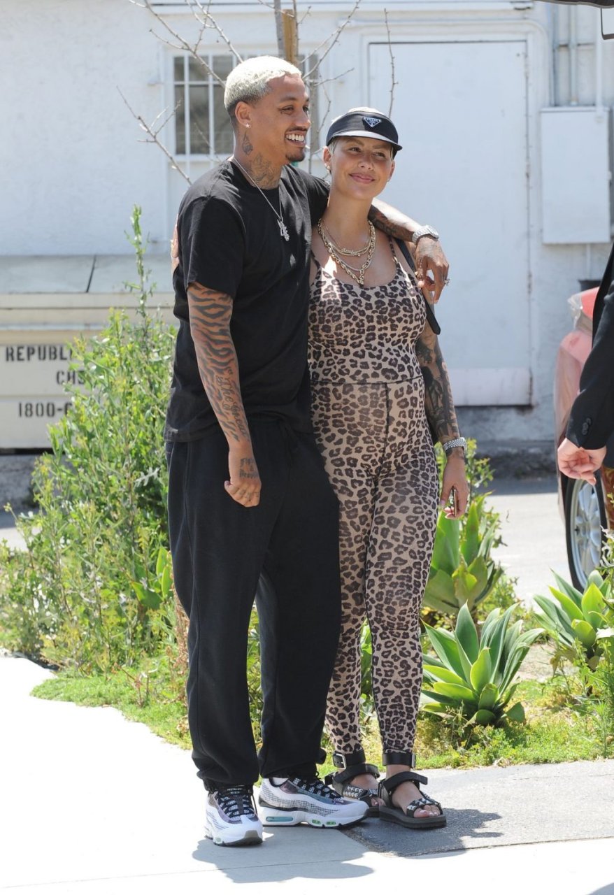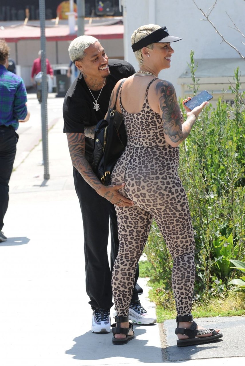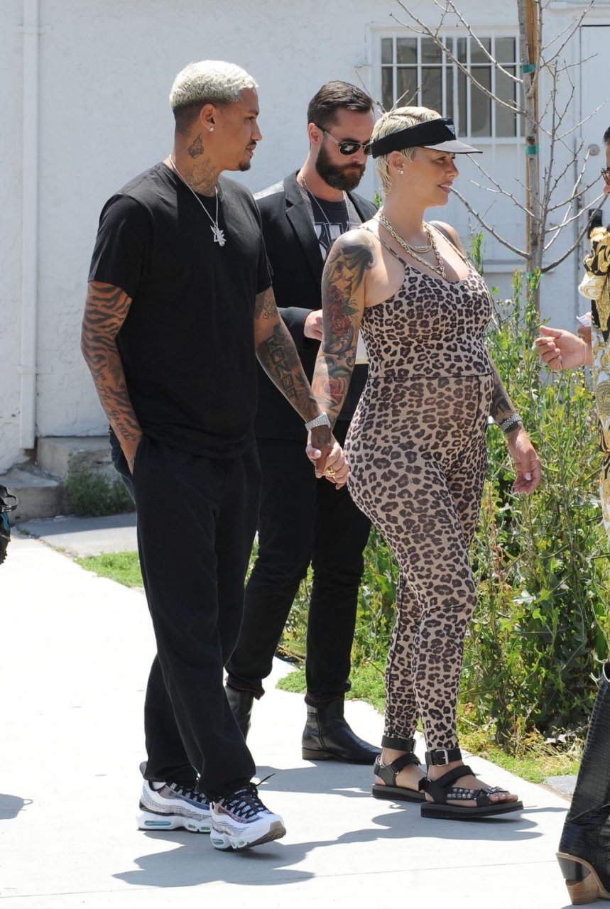 Эмбер Роуз демонстрирует растущий животик в леопардовых колготках во время деловой встречи с партнерами и бойфрендом Александром Эдвардсом в французском ресторане Petit Trois в Шерман-Оукс, 03.05.2019. Новый возлюбленный Эмбер Александр не мог оторвать от нее рук, пока они ждали свою машину у парковщика.