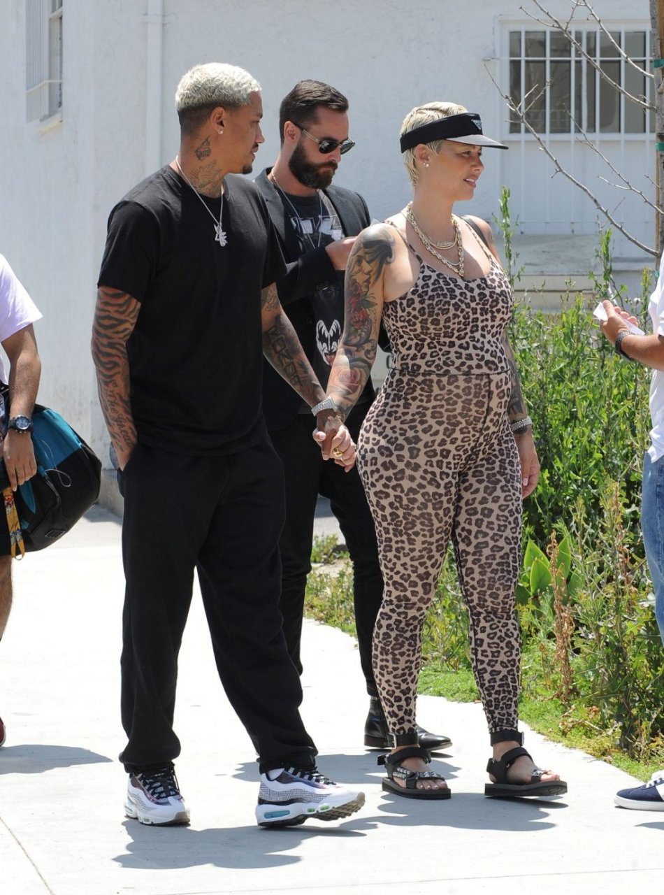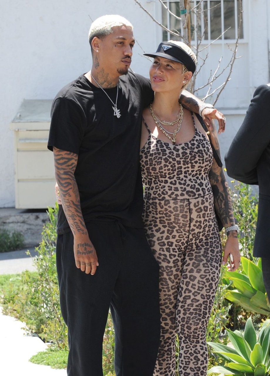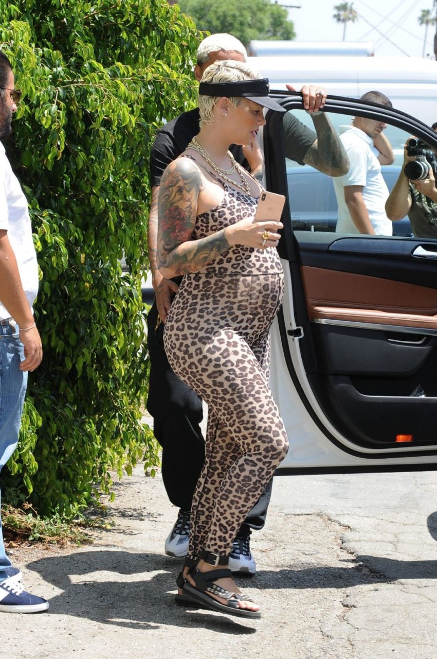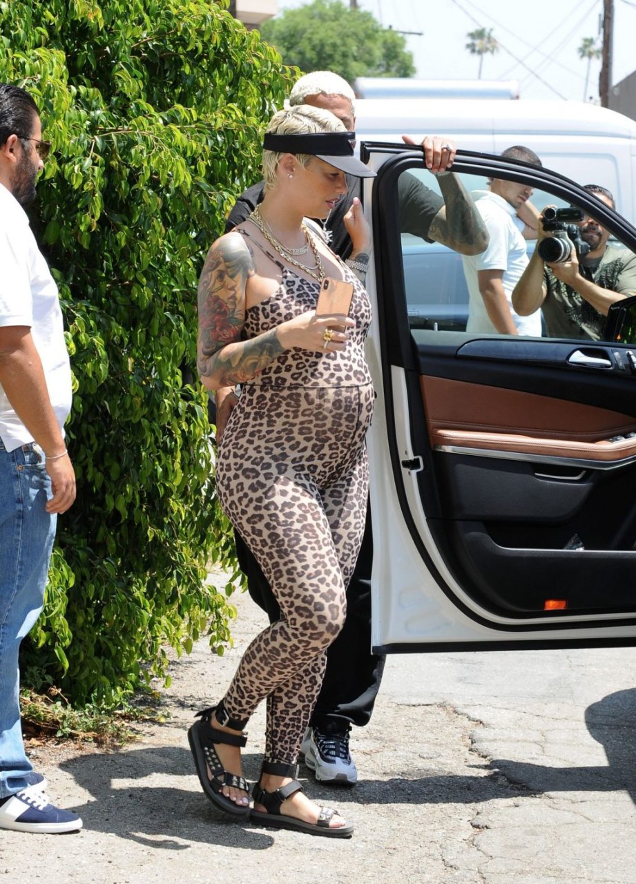 Эмбер Роуз демонстрирует растущий животик в леопардовых колготках во время деловой встречи с партнерами и бойфрендом Александром Эдвардсом в французском ресторане Petit Trois в Шерман-Оукс, 03.05.2019. Новый возлюбленный Эмбер Александр не мог оторвать от нее рук, пока они ждали свою машину у парковщика.
