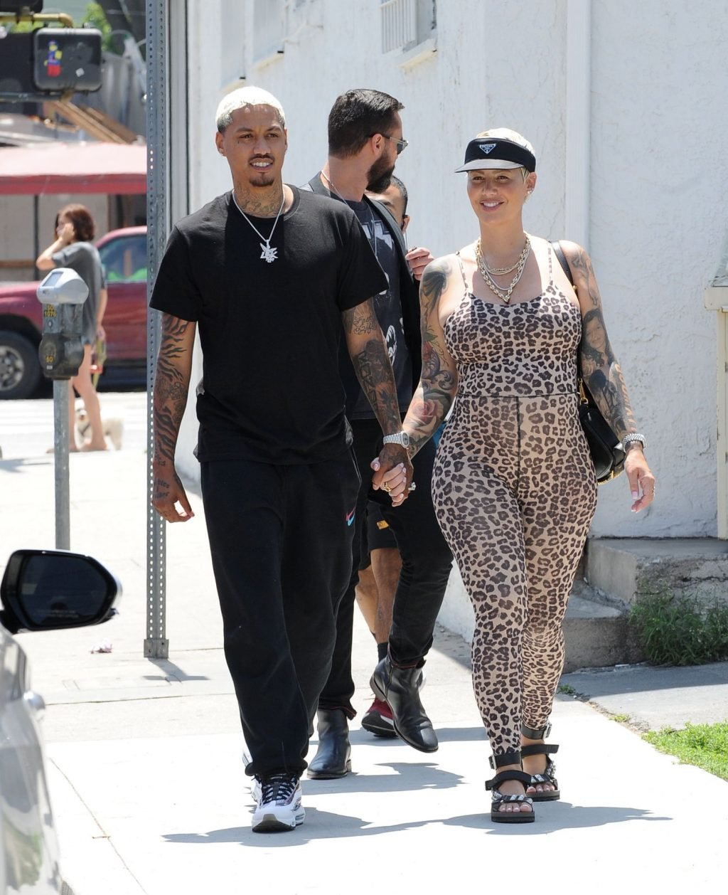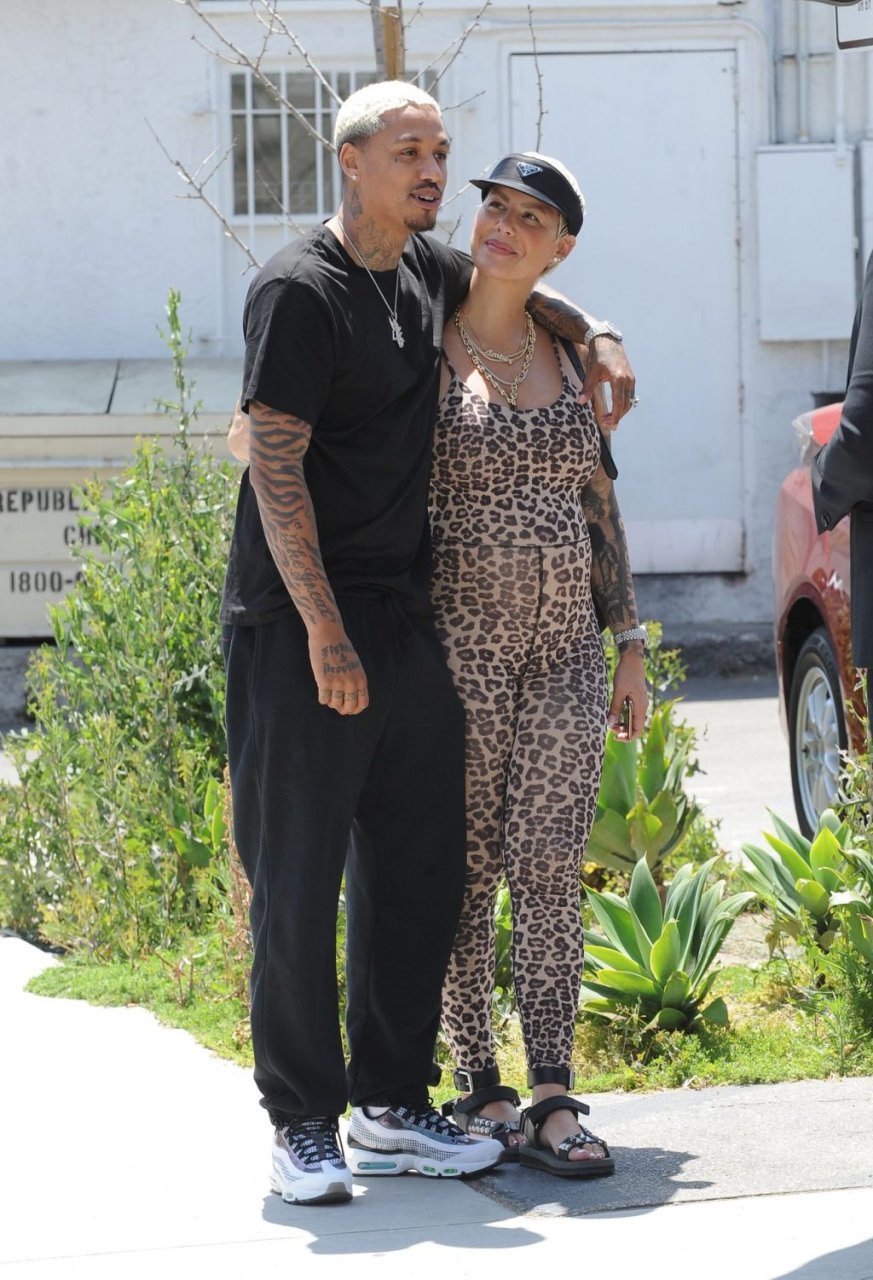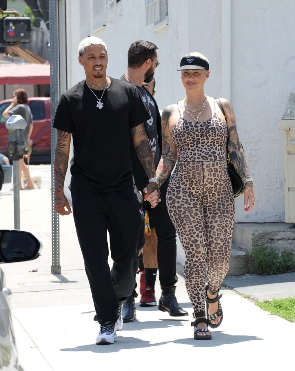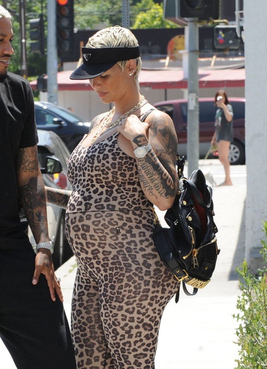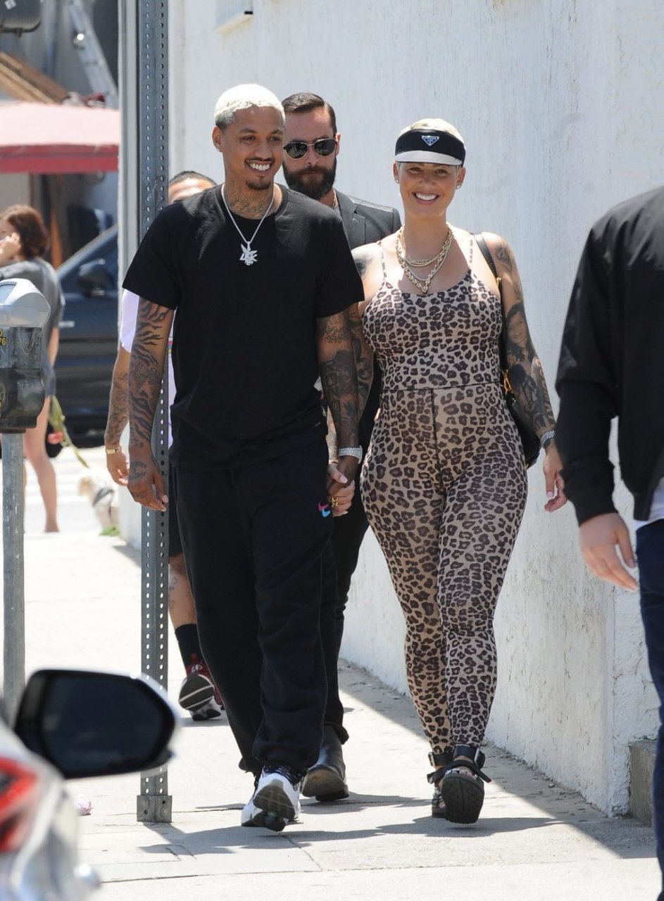Эмбер Роуз демонстрирует растущий животик в леопардовых колготках во время деловой встречи с партнерами и бойфрендом Александром Эдвардсом в французском ресторане Petit Trois в Шерман-Оукс, 03.05.2019. Новый возлюбленный Эмбер Александр не мог оторвать от нее рук, пока они ждали свою машину у парковщика.