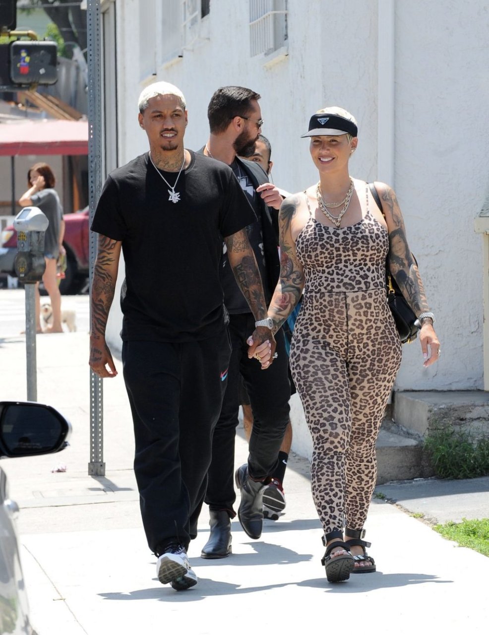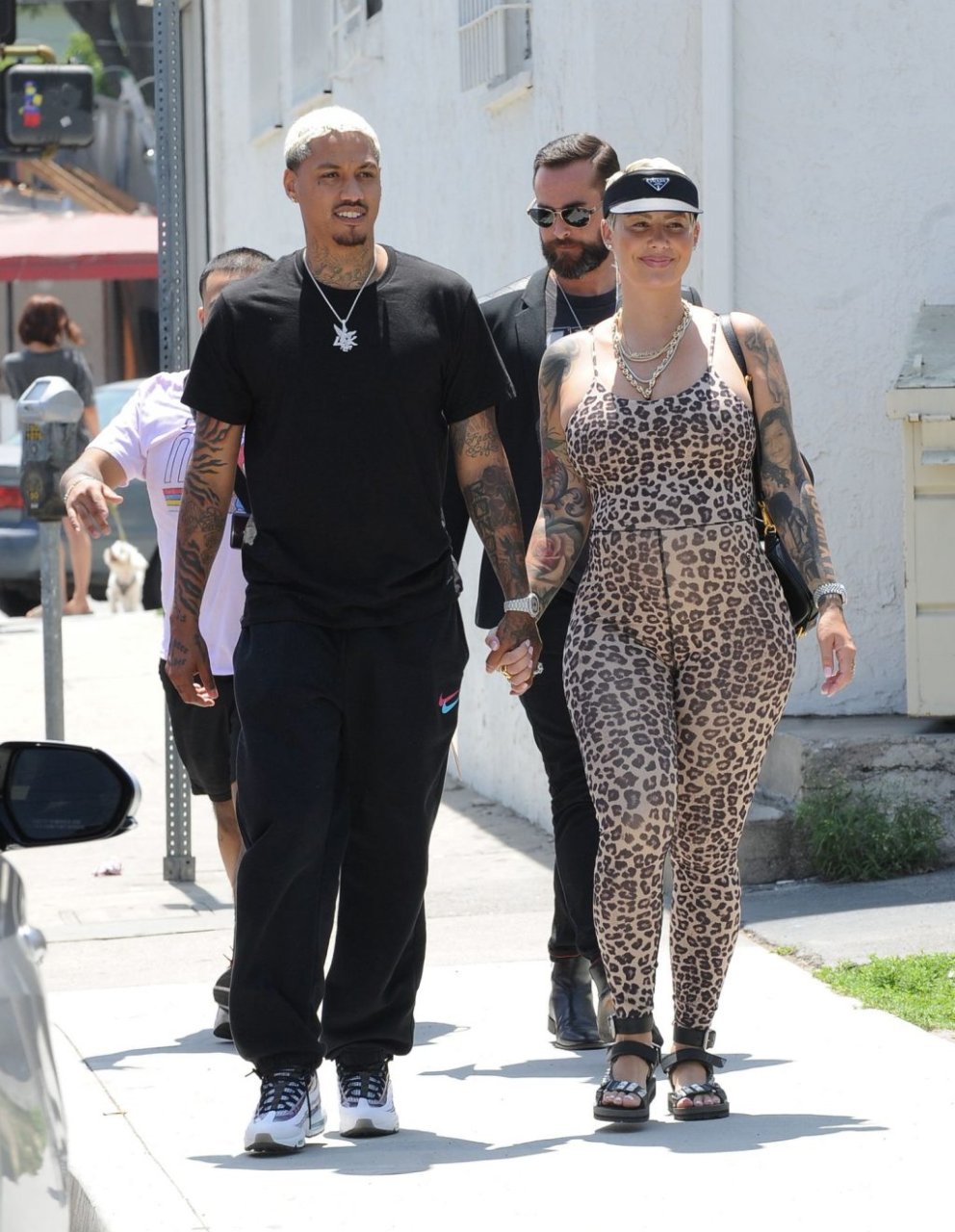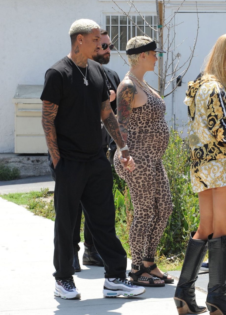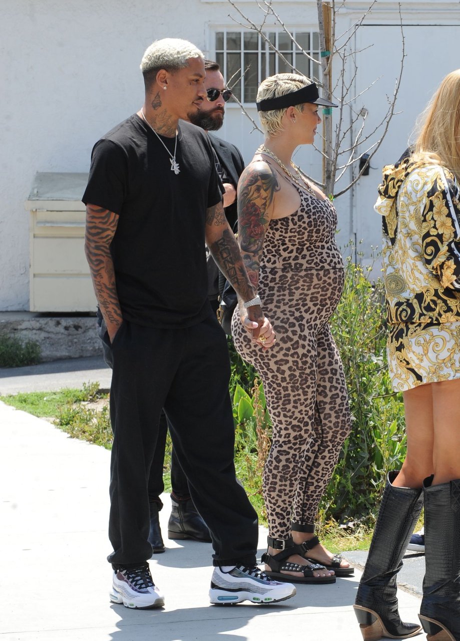 Эмбер Роуз демонстрирует растущий животик в леопардовых колготках во время деловой встречи с партнерами и бойфрендом Александром Эдвардсом в французском ресторане Petit Trois в Шерман-Оукс, 03.05.2019. Новый возлюбленный Эмбер Александр не мог оторвать от нее рук, пока они ждали свою машину у парковщика.