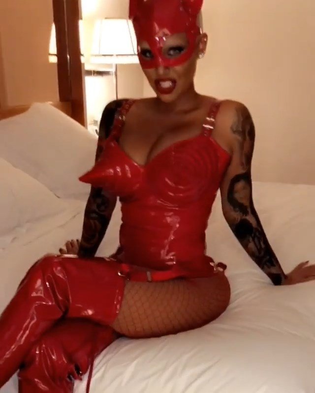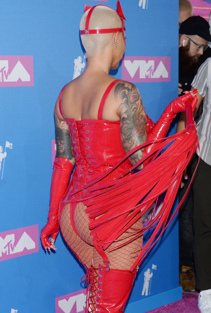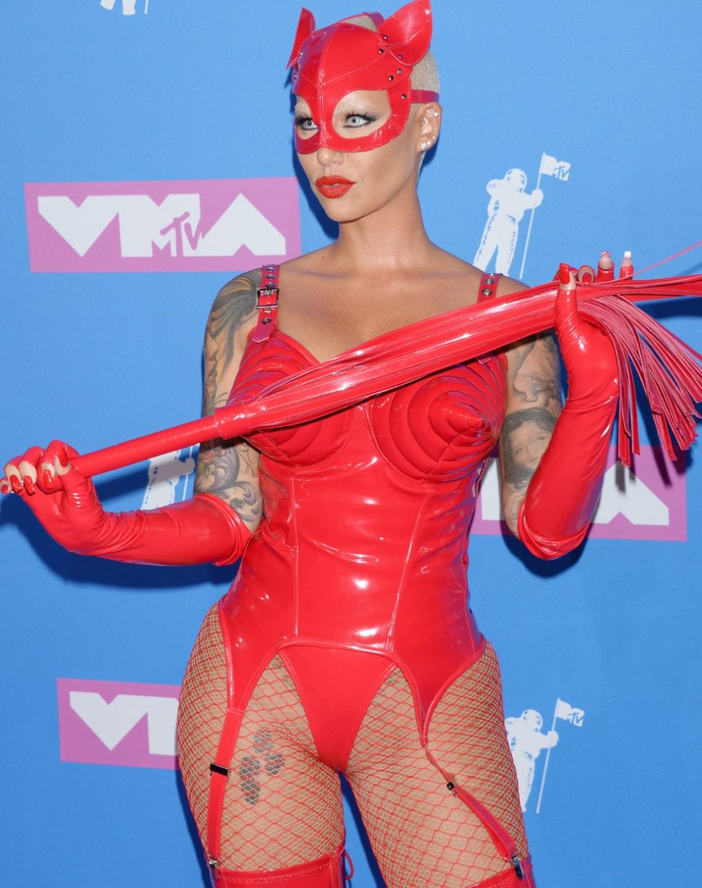 Amber Rose присутствует на церемонии MTV Video Music Awards 2018 в Нью-Йорке, 20.08.2018. Amber удивила гостей нарядом из красного латекса в стиле BDSM. 34-летняя актриса и модель почти сбрита наголо и постоянно меняет цвет волос. Иногда она выглядит как героиня фэнтезийного фильма.