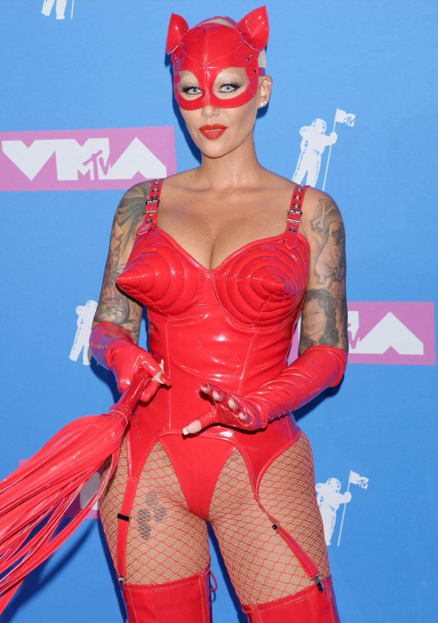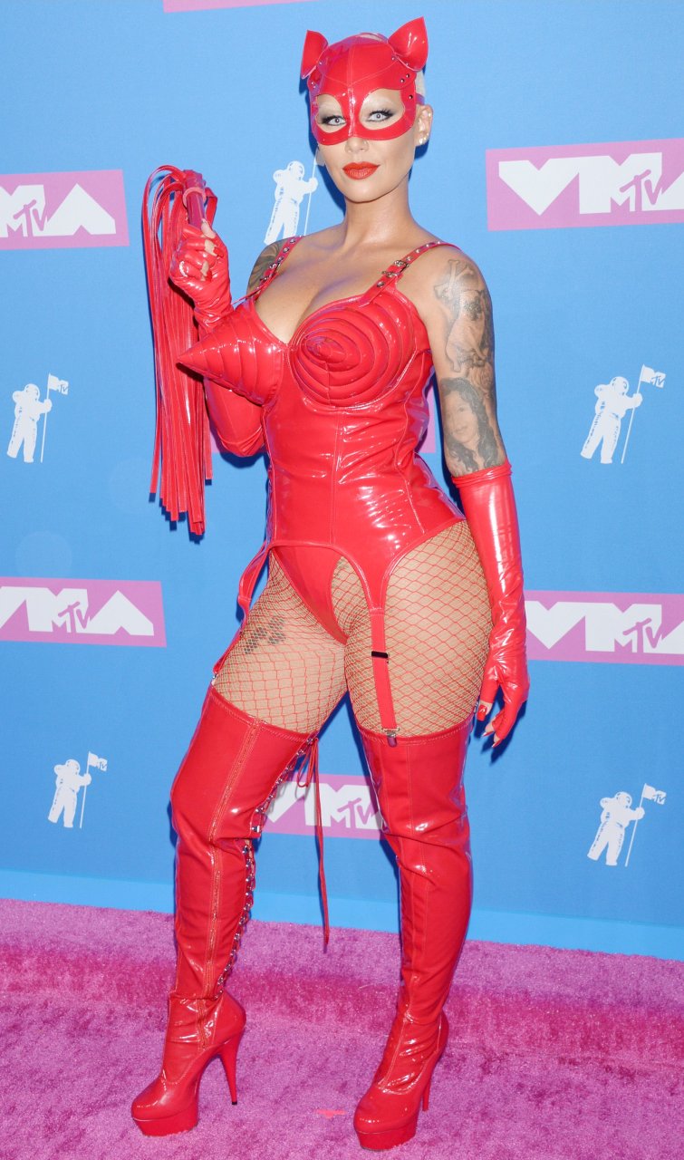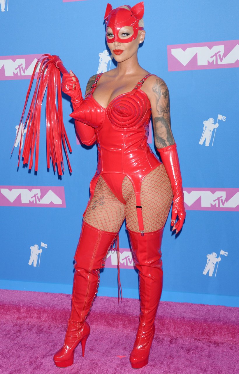 Amber Rose присутствует на церемонии MTV Video Music Awards 2018 в Нью-Йорке, 20.08.2018. Amber удивила гостей нарядом из красного латекса в стиле BDSM. 34-летняя актриса и модель почти сбрита наголо и постоянно меняет цвет волос. Иногда она выглядит как героиня фэнтезийного фильма.