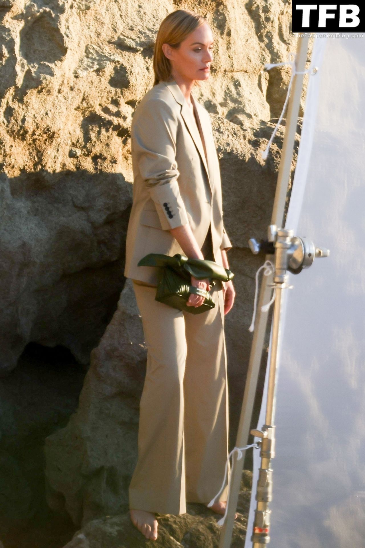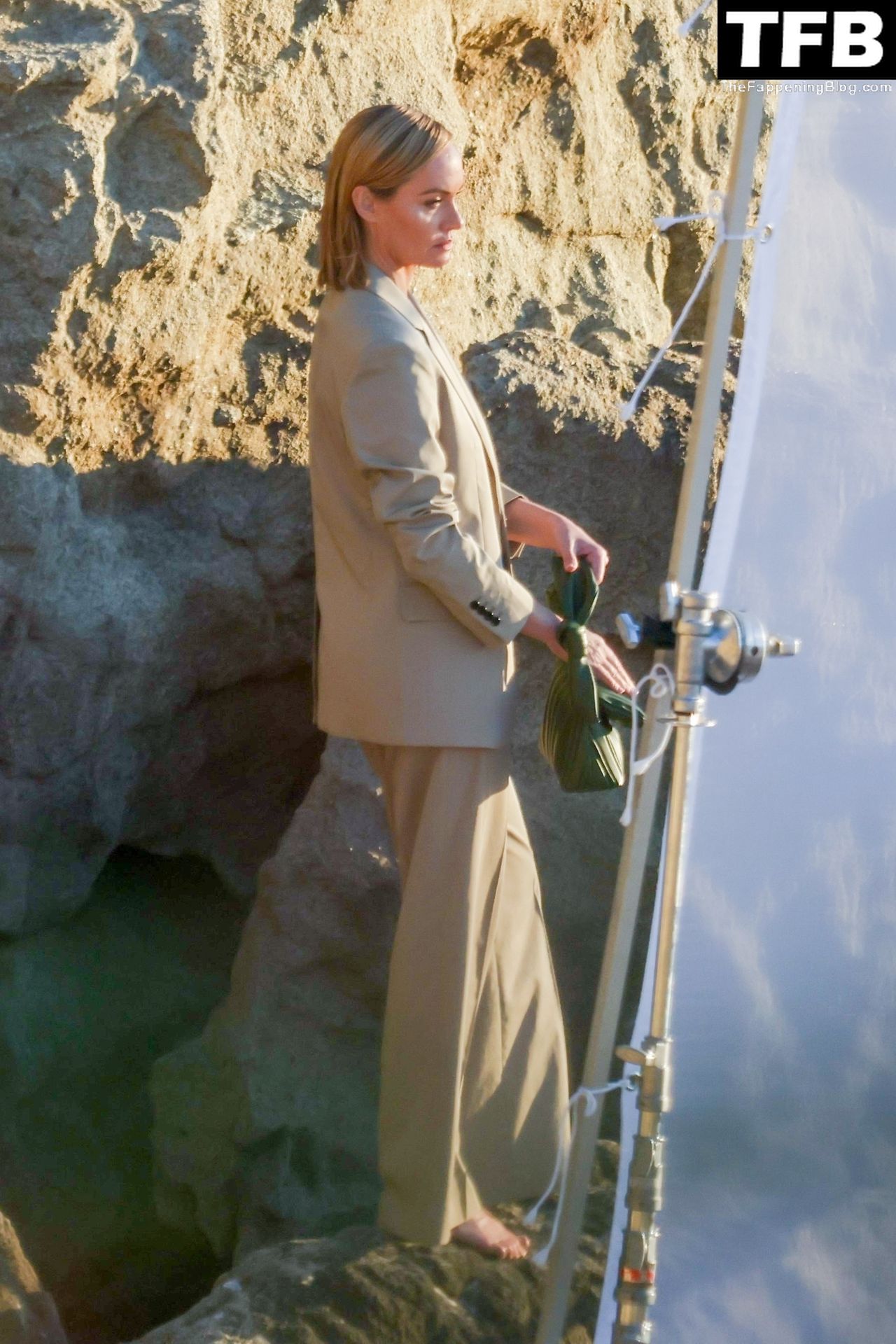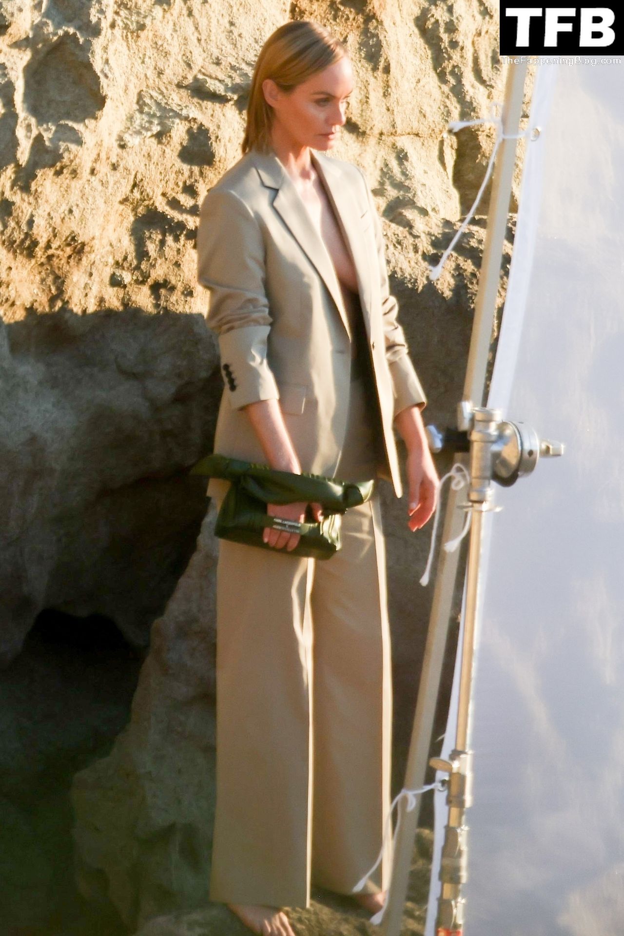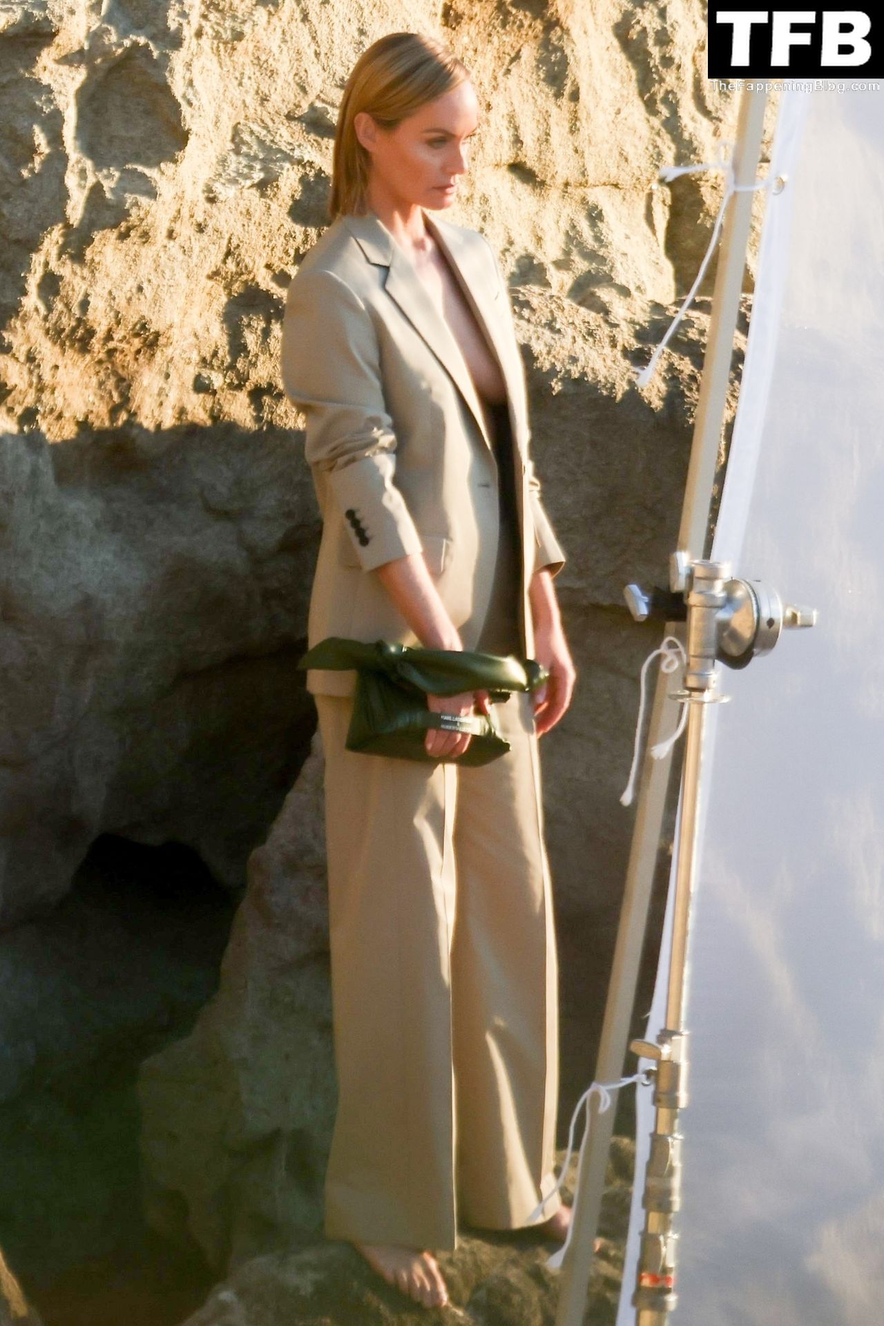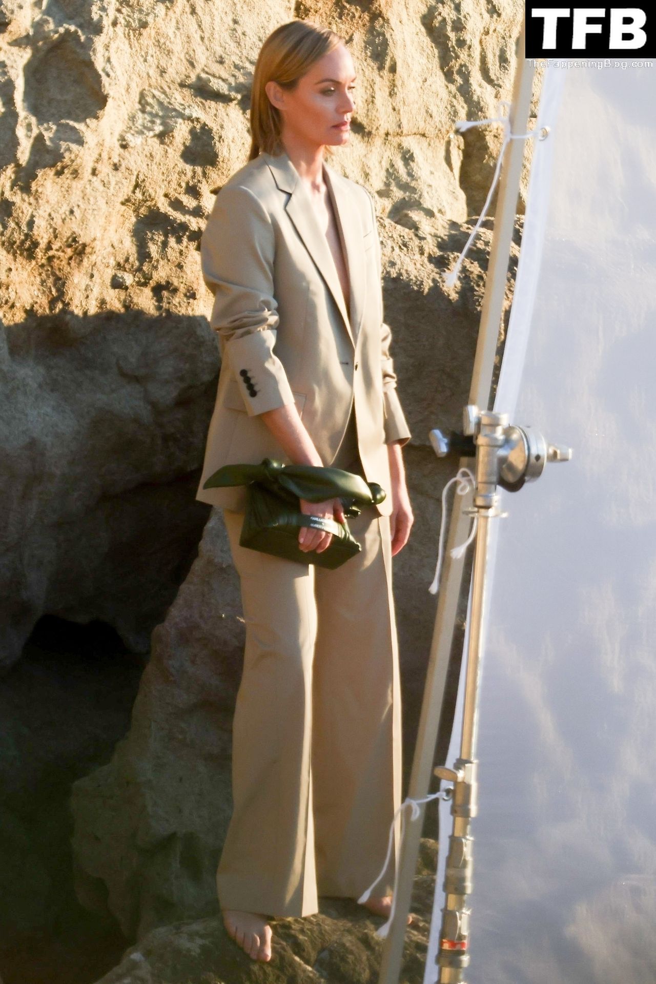 Американская модель Эмбер Валлетта позирует топлес во время сексуальной модной фотосессии в золотой час на пляже в Малибу, 02/09/2022.