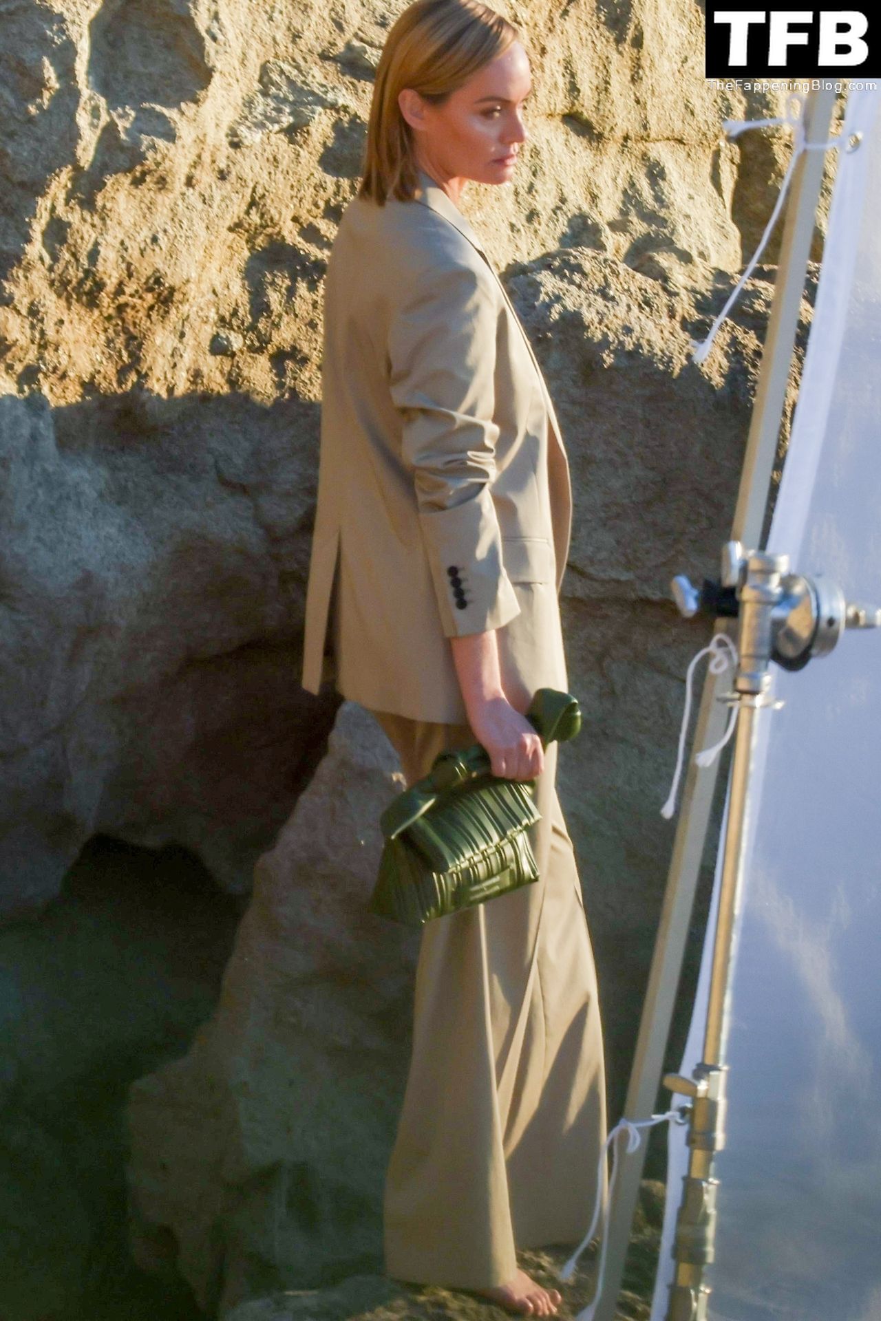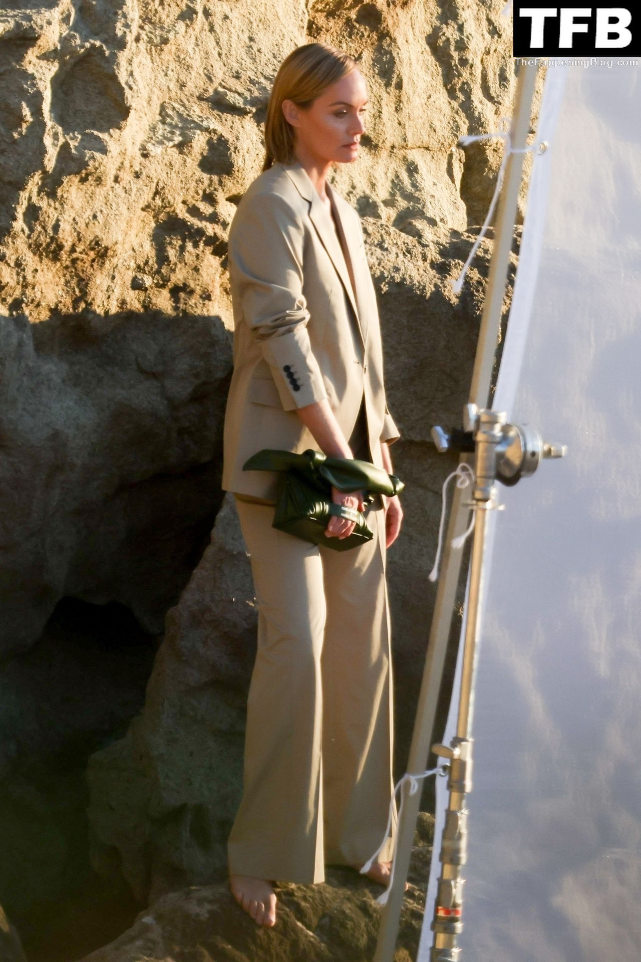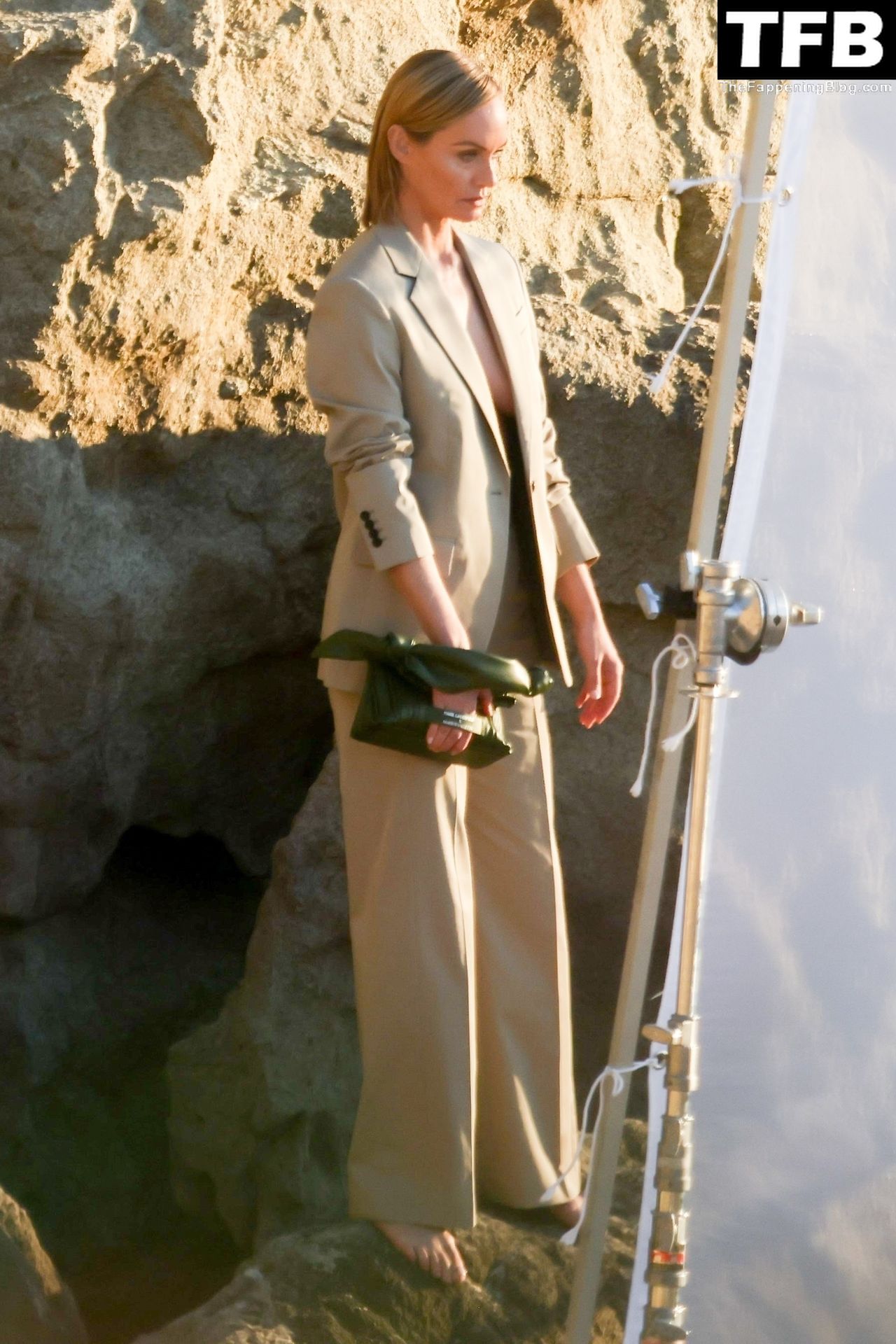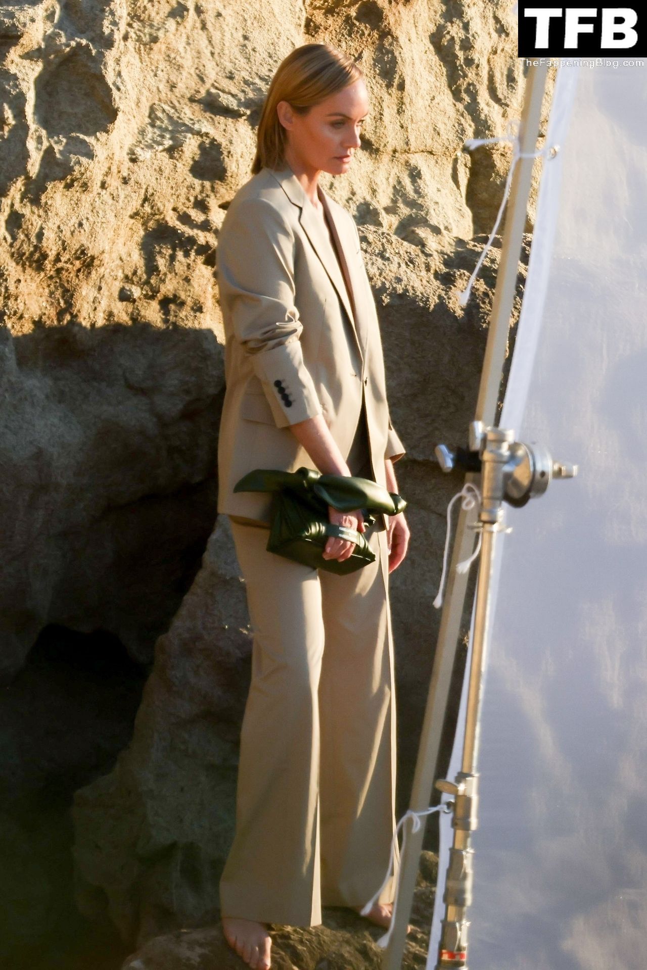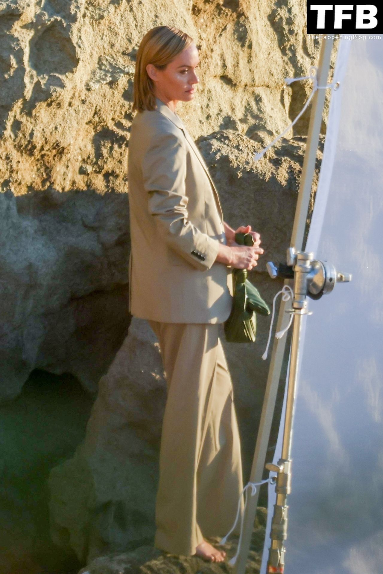 Американская модель Эмбер Валлетта позирует топлес во время сексуальной модной фотосессии в золотой час на пляже в Малибу, 02/09/2022.