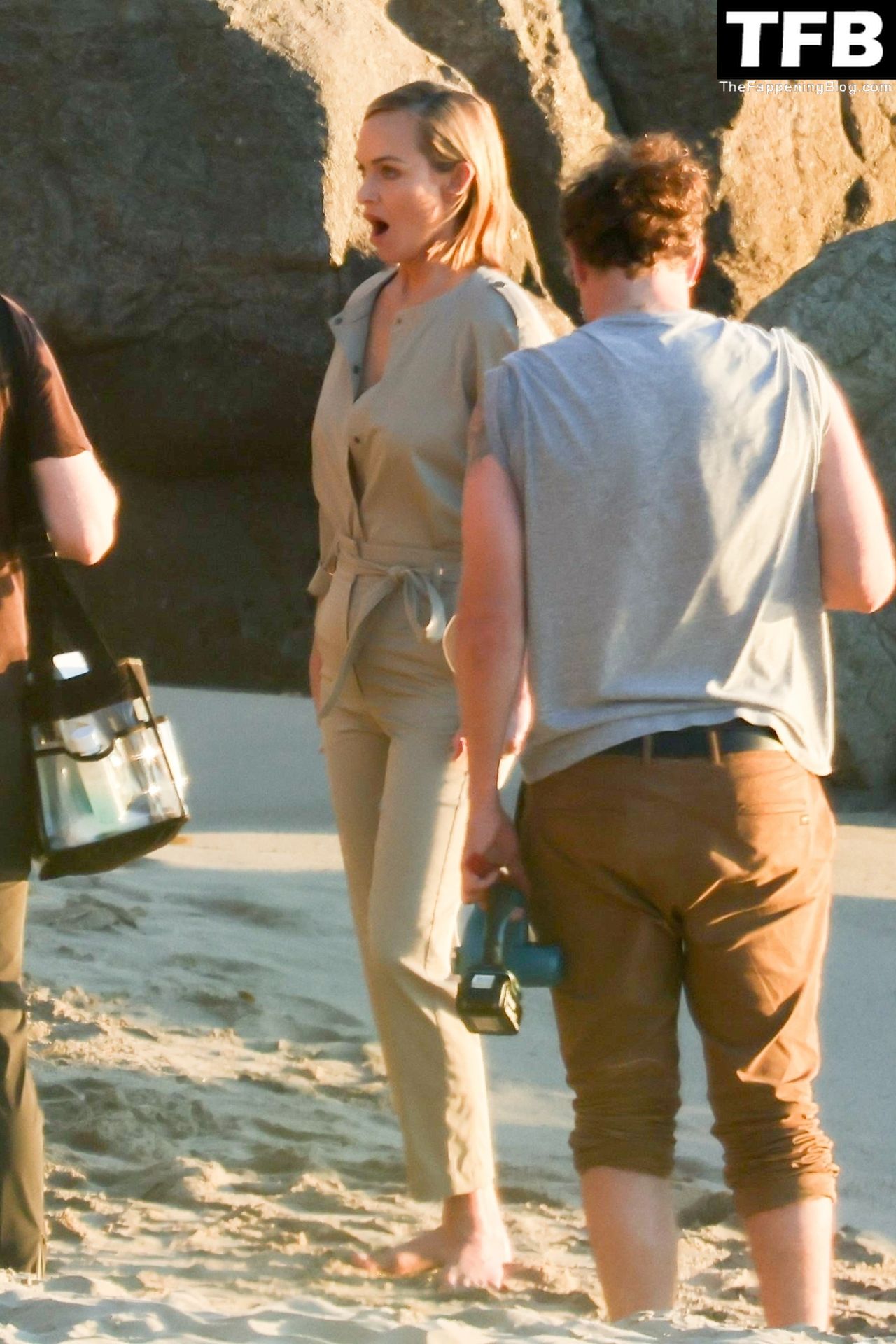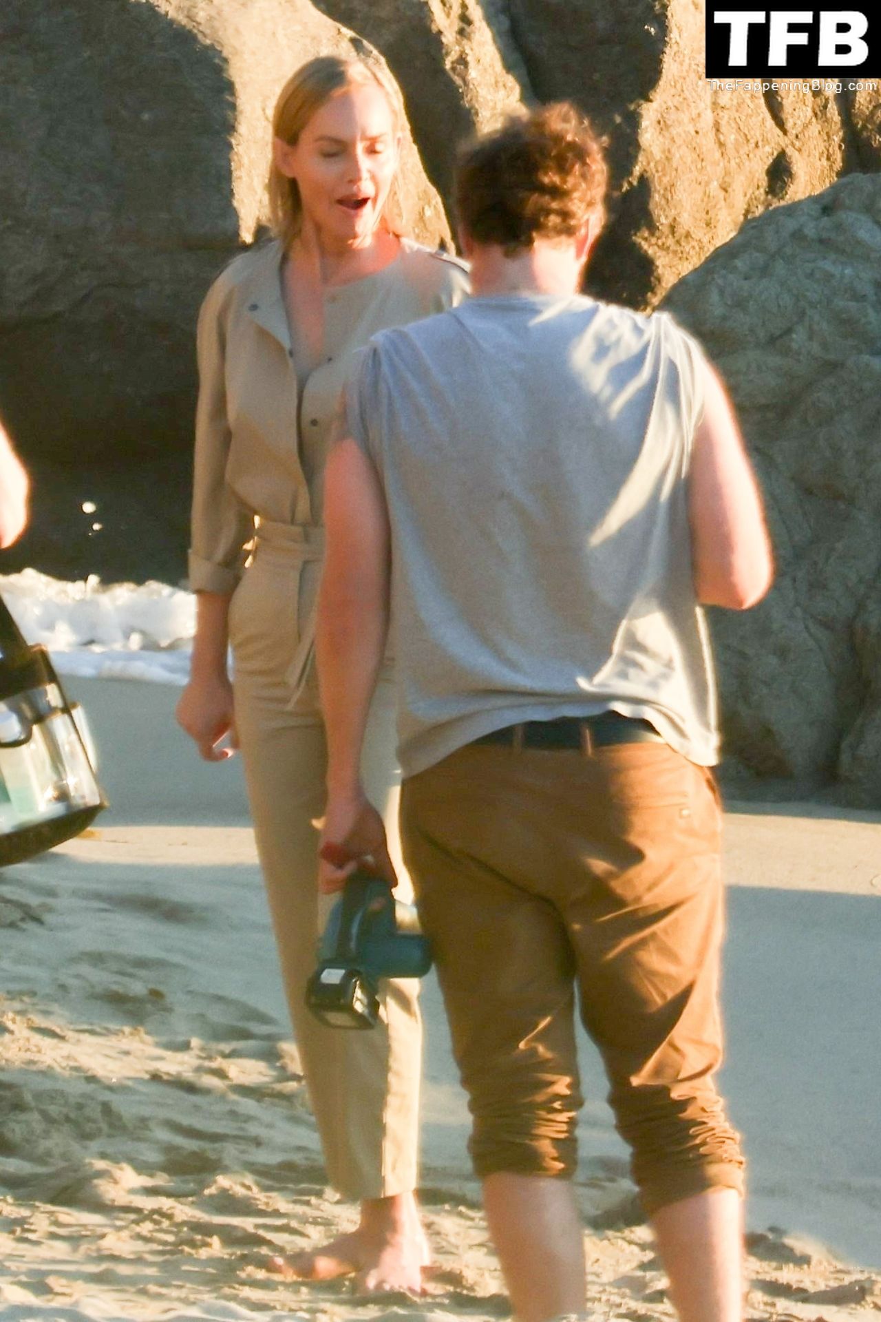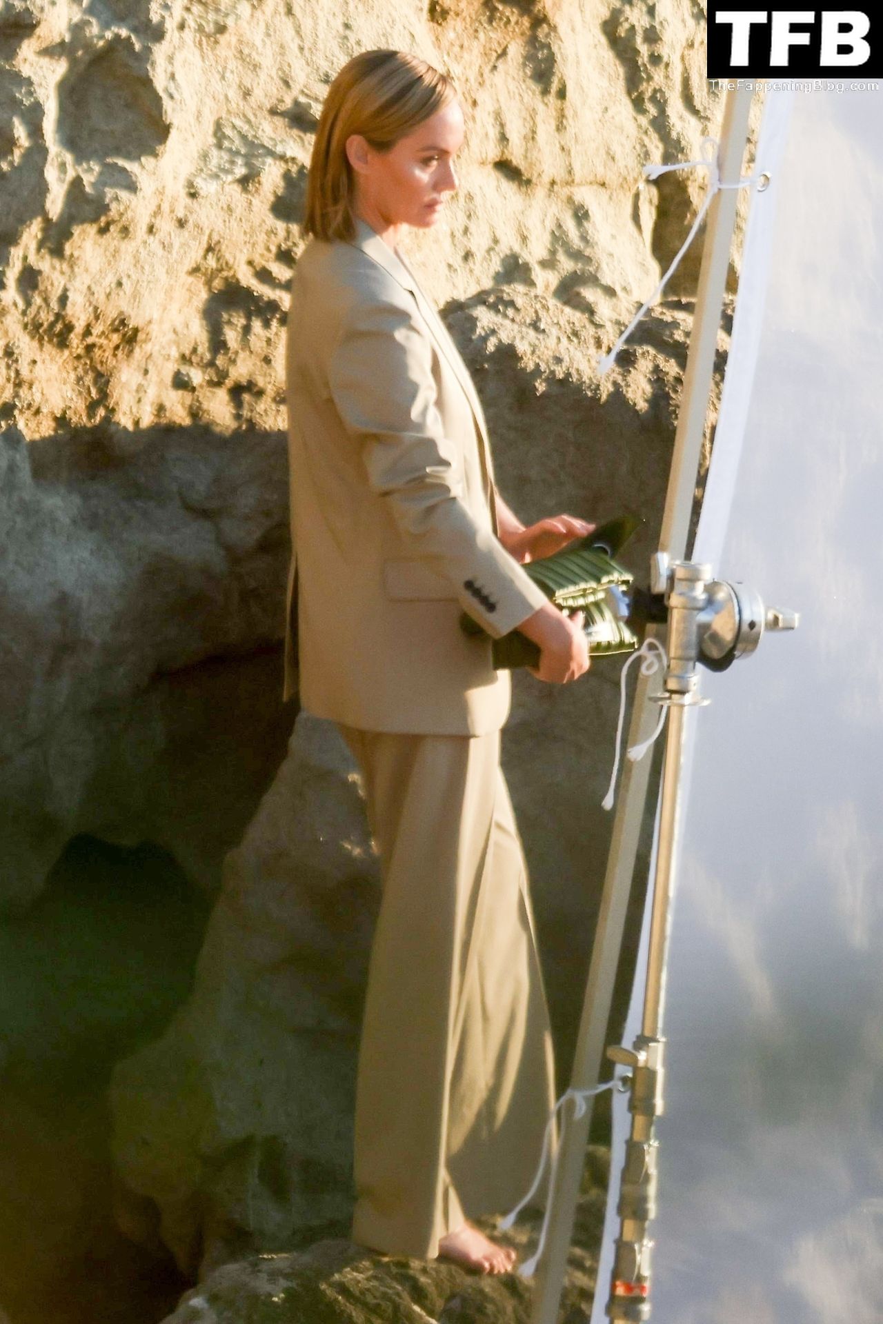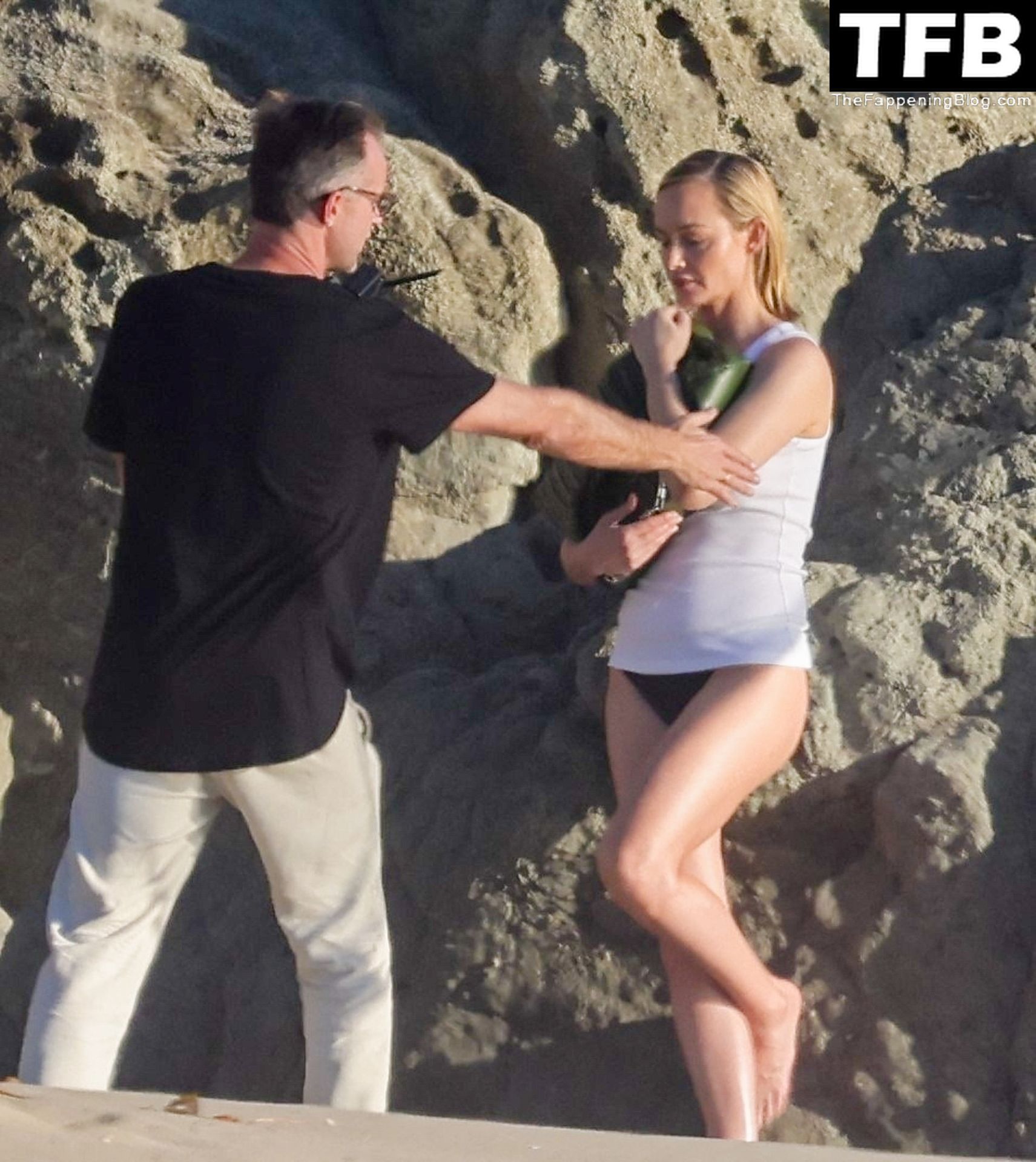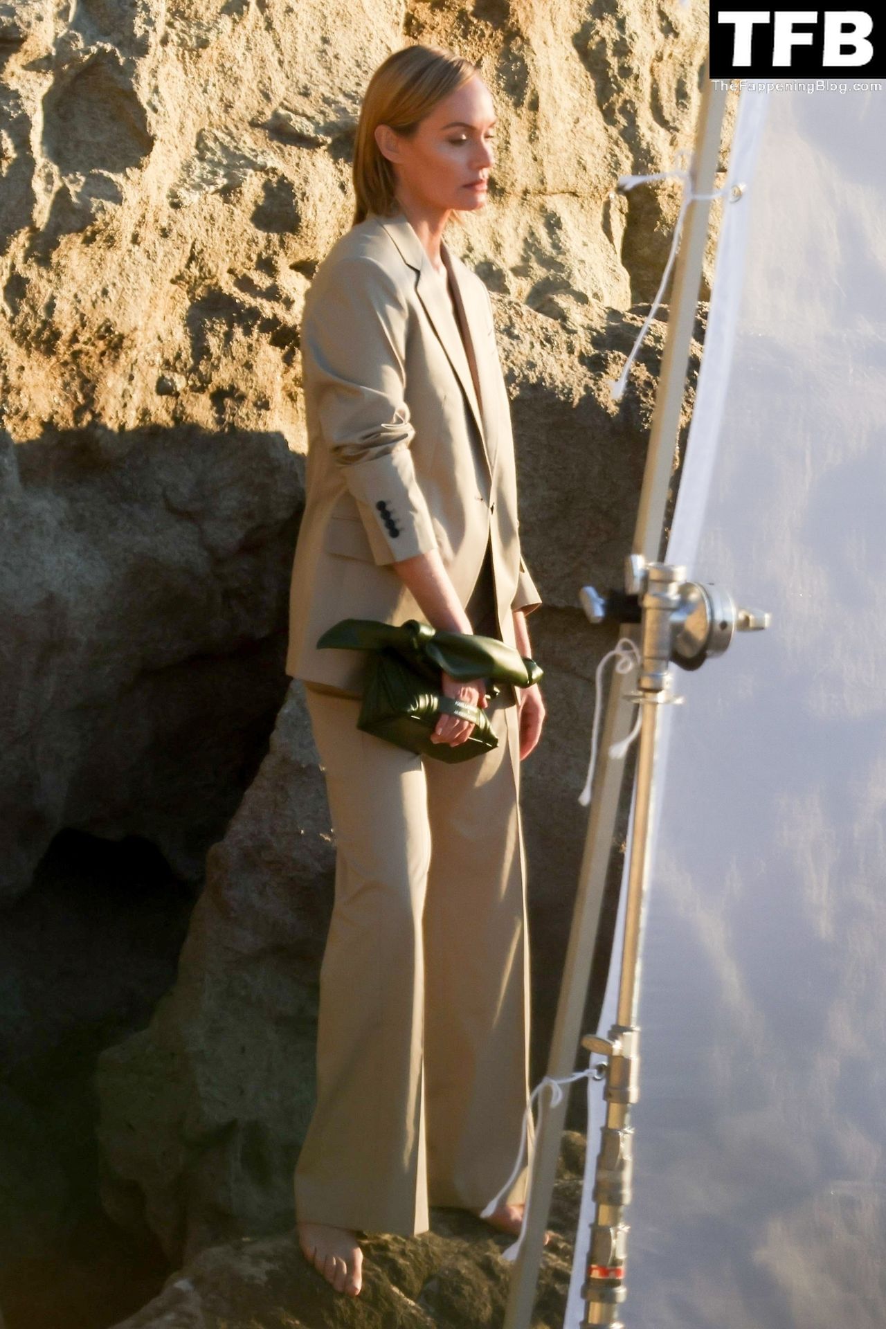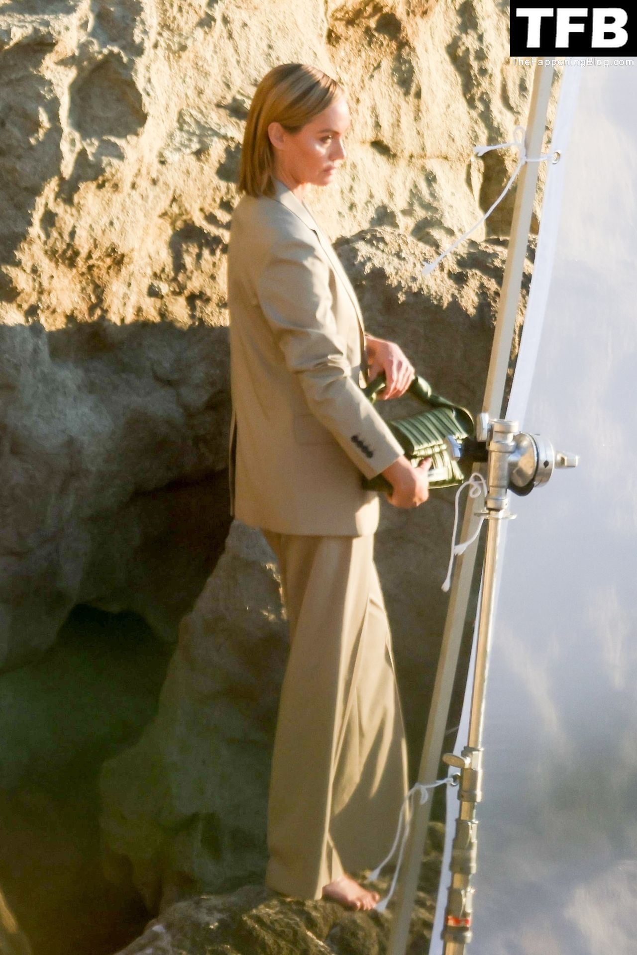 Американская модель Эмбер Валлетта позирует топлес во время сексуальной модной фотосессии в золотой час на пляже в Малибу, 02/09/2022.