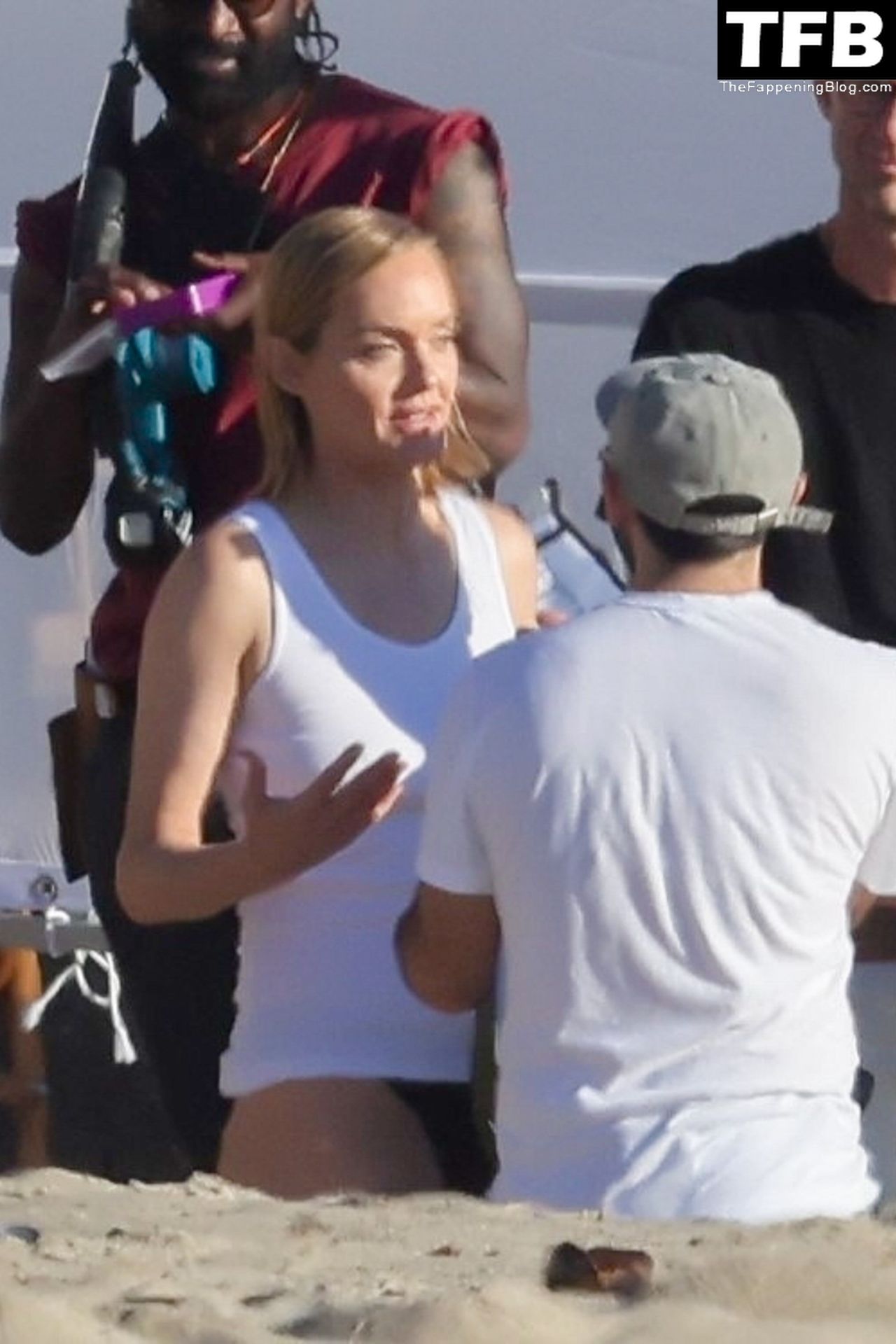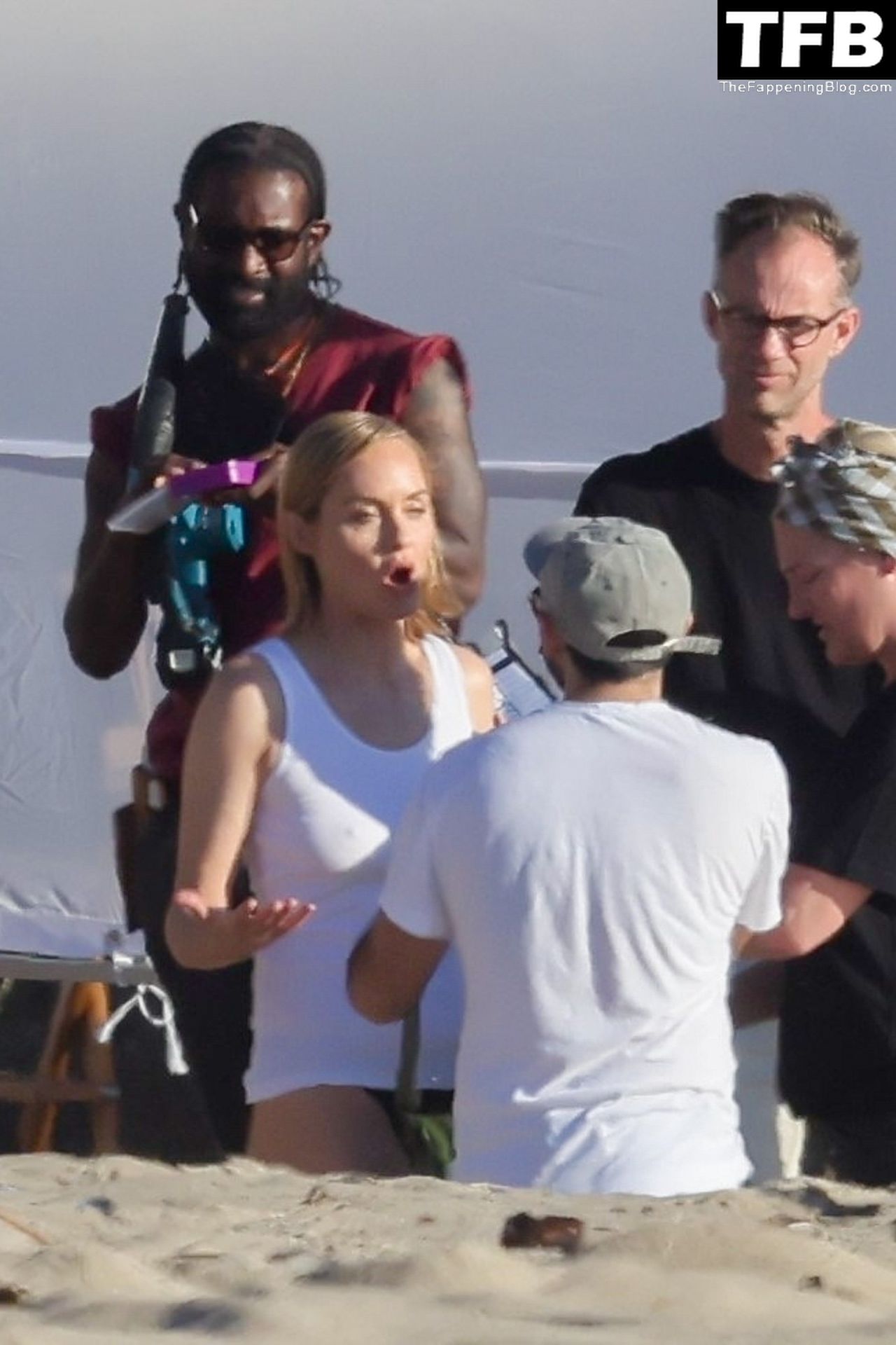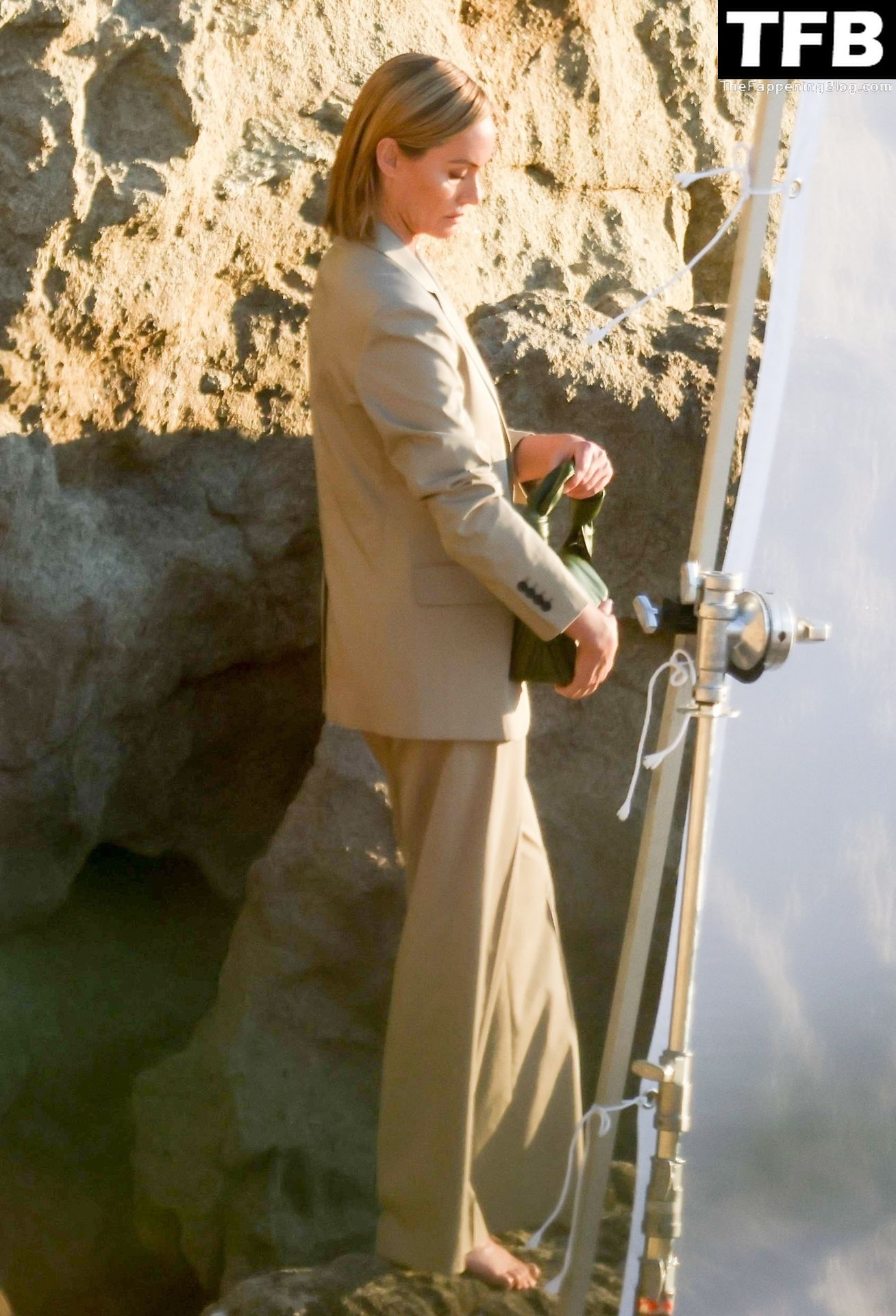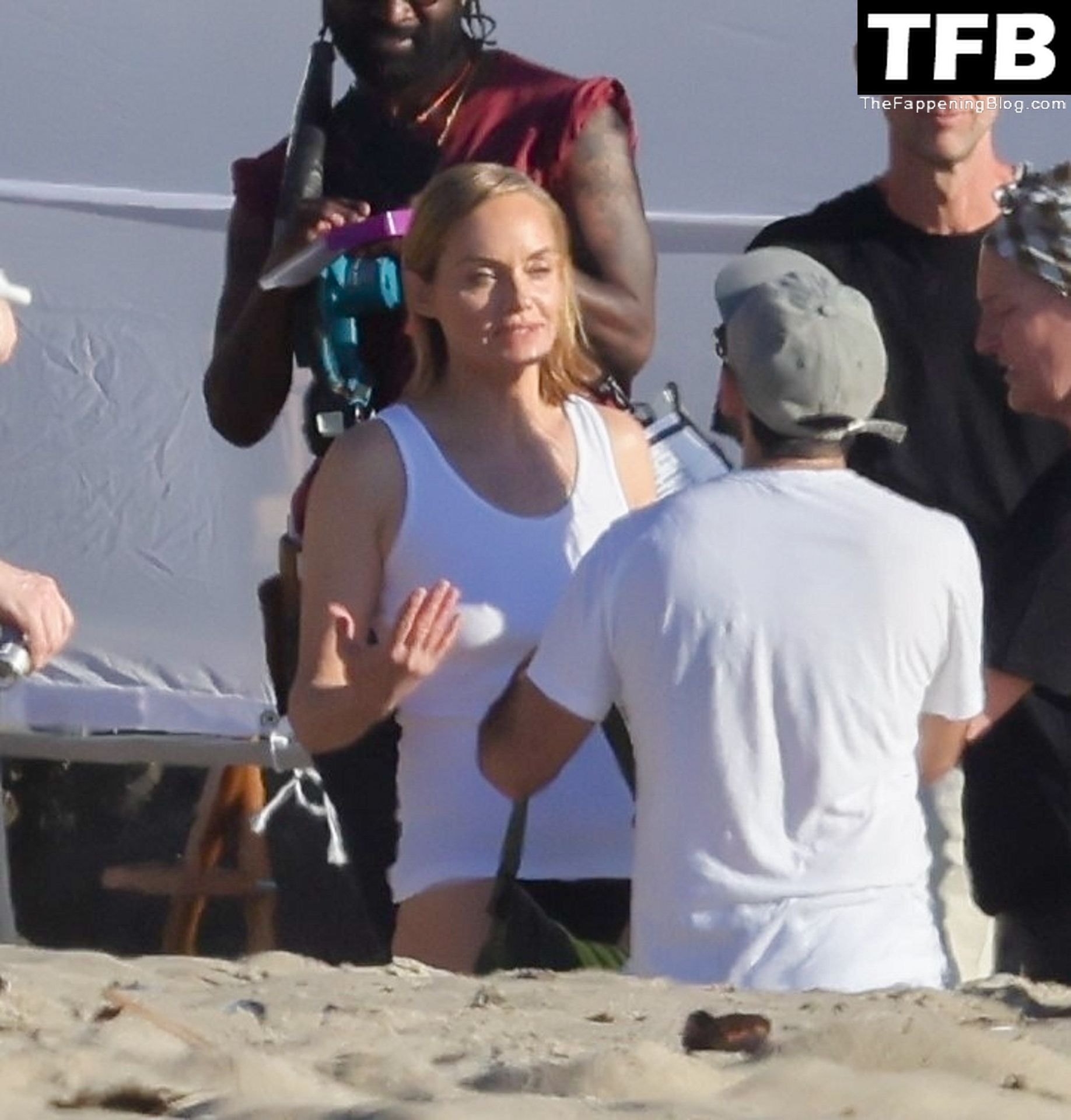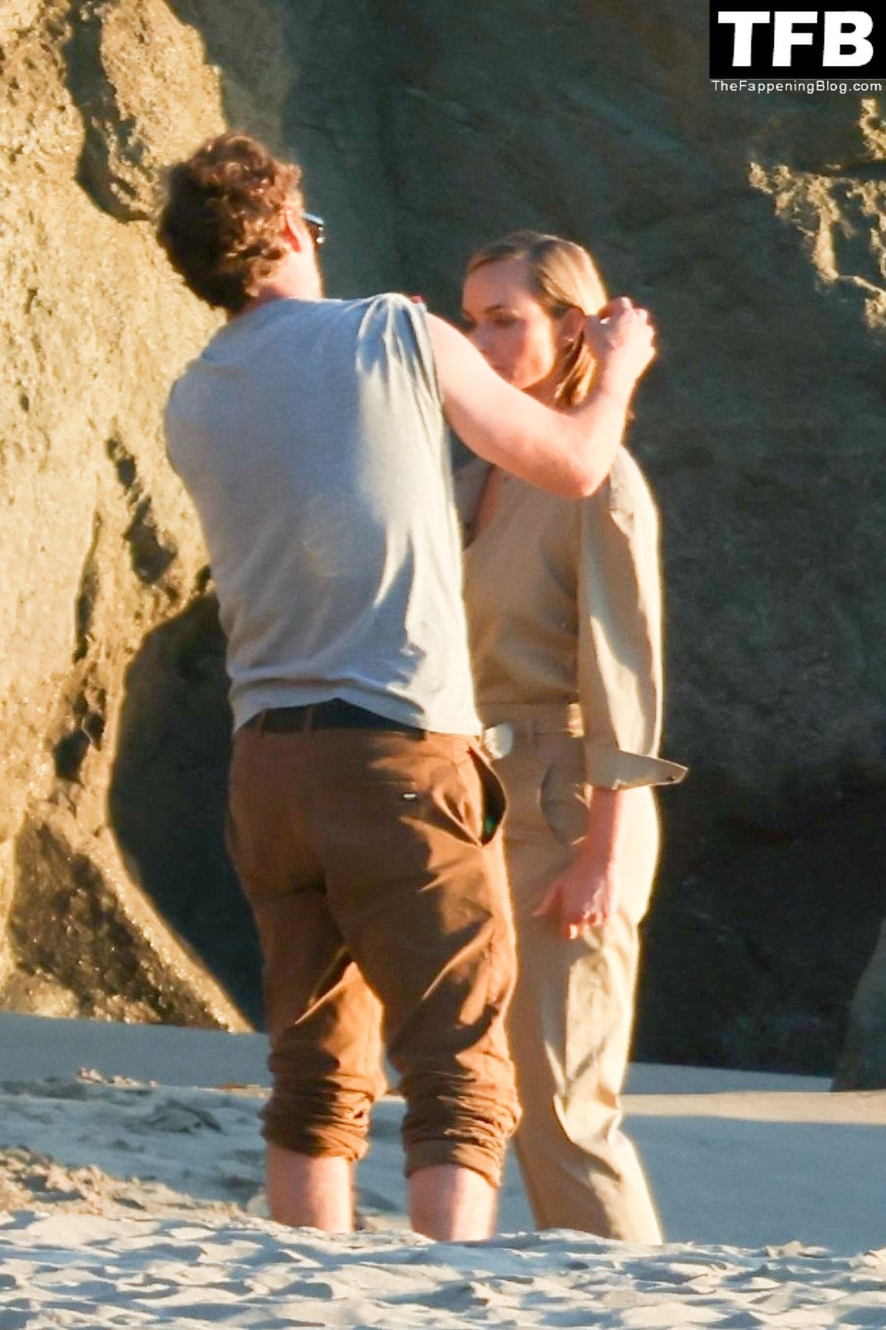 Американская модель Эмбер Валлетта позирует топлес во время сексуальной модной фотосессии в золотой час на пляже в Малибу, 02/09/2022.