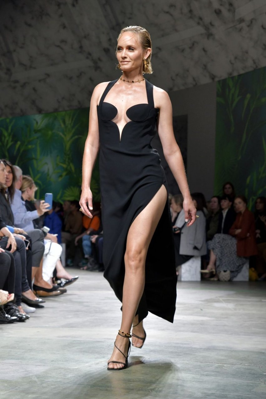 Ветеран модельного бизнеса Эмбер Валлетта продемонстрировала свои сексуальные ноги и грудь на подиуме шоу Versace Весна/Лето 2020 во время Миланской недели моды в Италии, 20.09.2019.