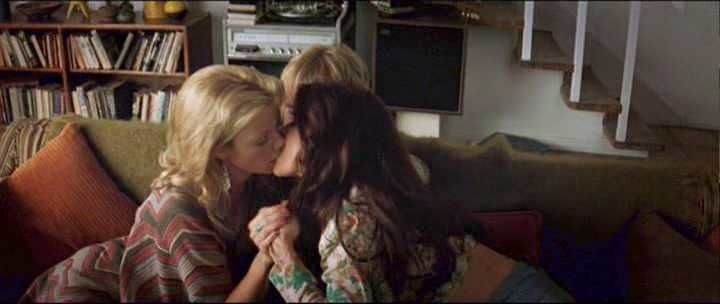 Amy Smart lesbian kissing Carmen Electra on a couch in front of a guy.
