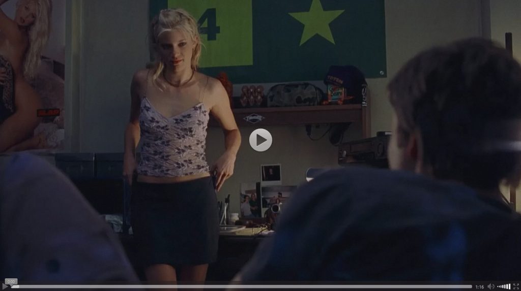 Amy Smart is dancing on stage at a strip club, unhooking her top to reveal black X’s taped on her nipples. She then continues to dance like that, wearing just a pair of very tiny pink shorts as she shows off her body and a room of guys look on. She then recognizes one of the guys and talks to him for a bit before a fight breaks out in the club.
